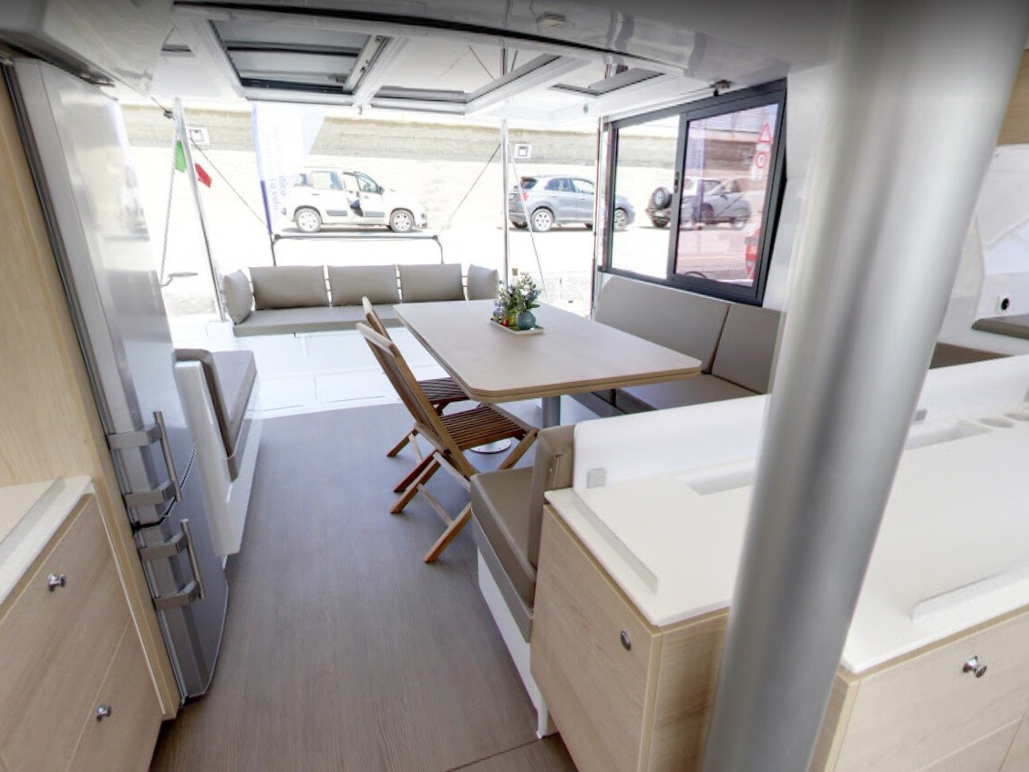 Mezzo marinaioDoccetta in pozzettoParabordiTenderPasserellaTavolo in pozzettoBiminiSalpa ancora elettricoAcqua caldaFrigoriferoKitchen utensilsCaricabatterie220V shore connectionRadio VHFElectric WCBarometroOrologioRadioGPS Chartplotter in cockpitBinocoloBearing compassRiflettore radarStazione VentoCarte nautichePilota automaticoChartplotterEstintoreSeat beltsKit di primo soccorsoSegnale sonoroSalvagenteTorciaZattera di salvataggioDinghy pump