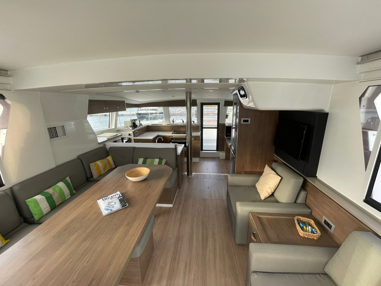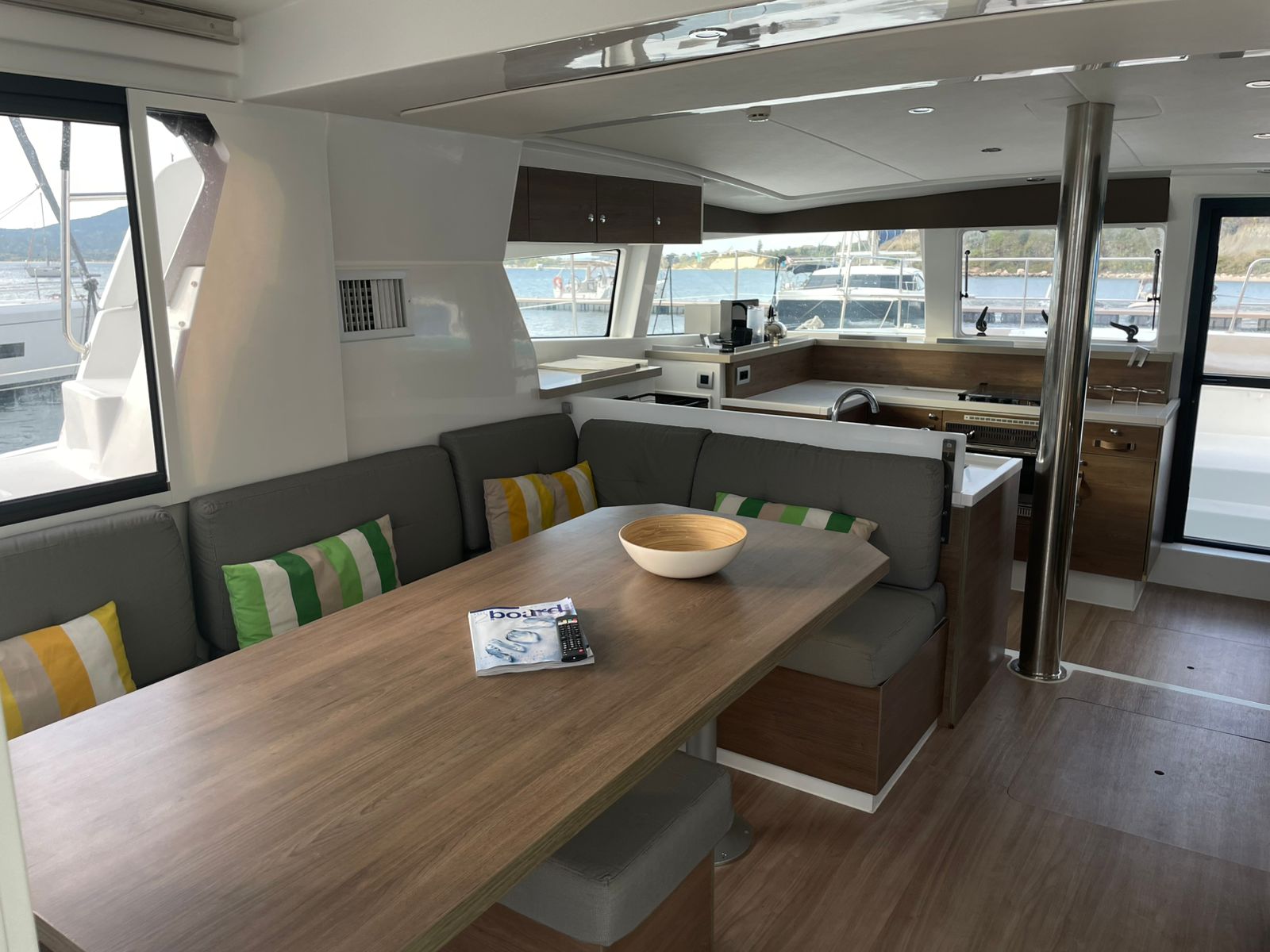 TenderPilota automaticoChart PlotterFuoribordoSprayhoodWater makerGeneratoreBiminiElectric winchesPannelli solariAria condizionataHydraulic gangwayAttrezzatura per lo snorkelingFrigoriferoTeakCassetta attrezziTorciaEstintoriMedical kitFirst aid boxZattera di salvataggioGas ovenFlat platesCoffee cupsForksKnivesSpoonsGlassesCutting boardBowlBread knifeFrying panVHF Radio telephoneLog-speedometerBarometroStazione VentoBinocoloPilota automaticoGPSCarte nauticheChartplotterYacht documentsParabordiCime di ormeggioBimini topSun tent (Bimini)Cuscini in pozzettoTenderSprayhoodPlastic bucketOarsSpazzolone2 Gas bottlesAutomatic light