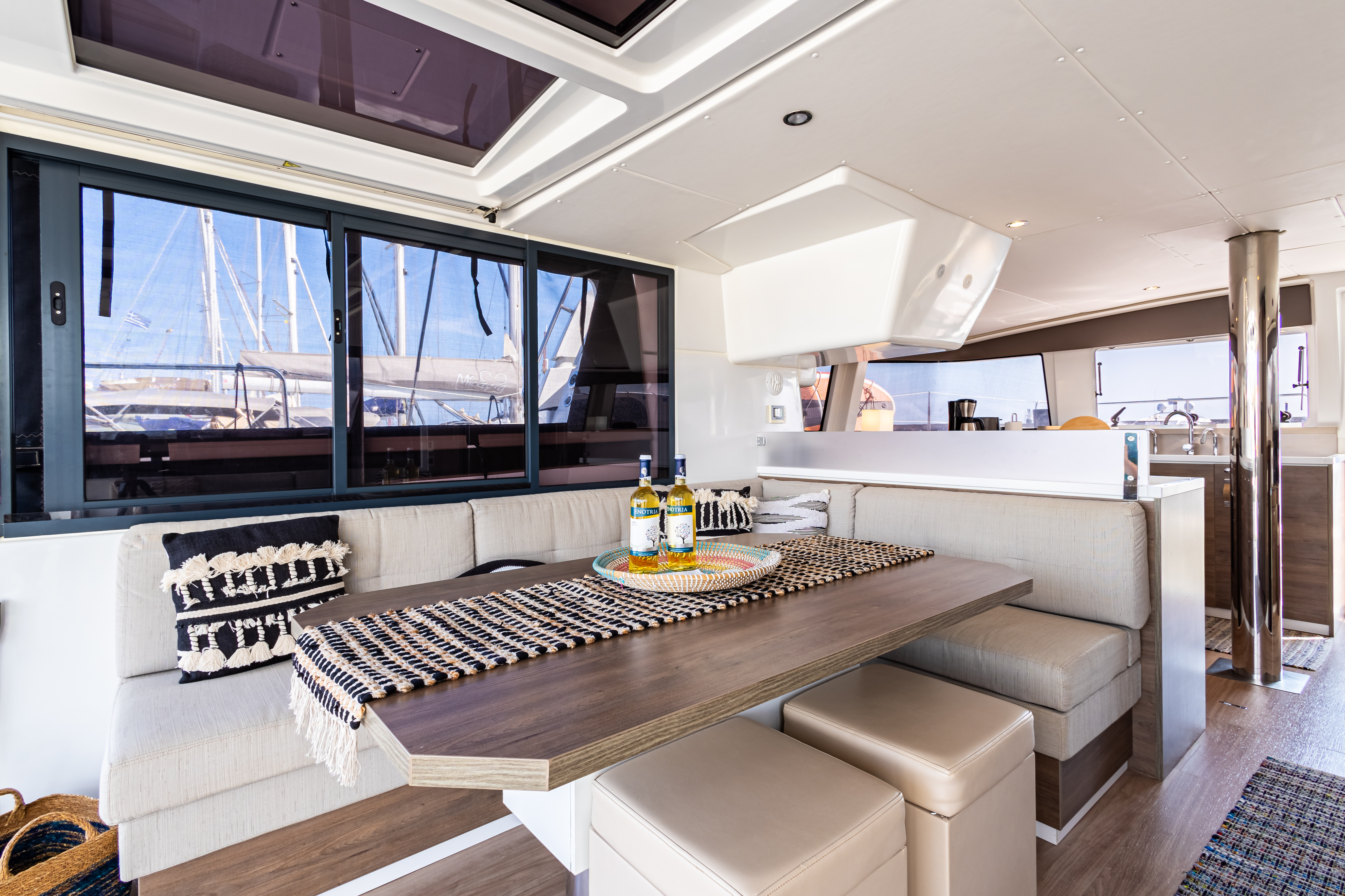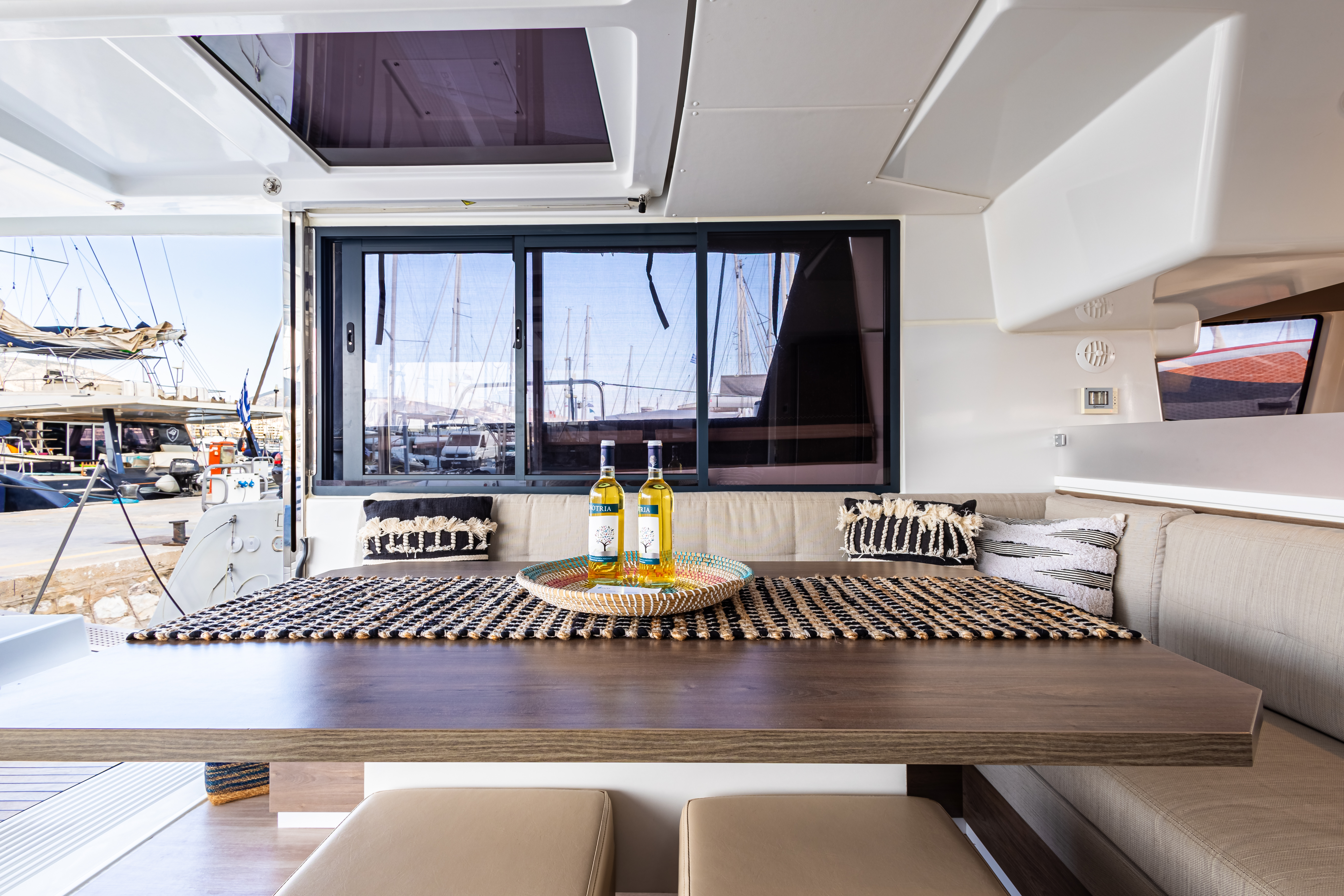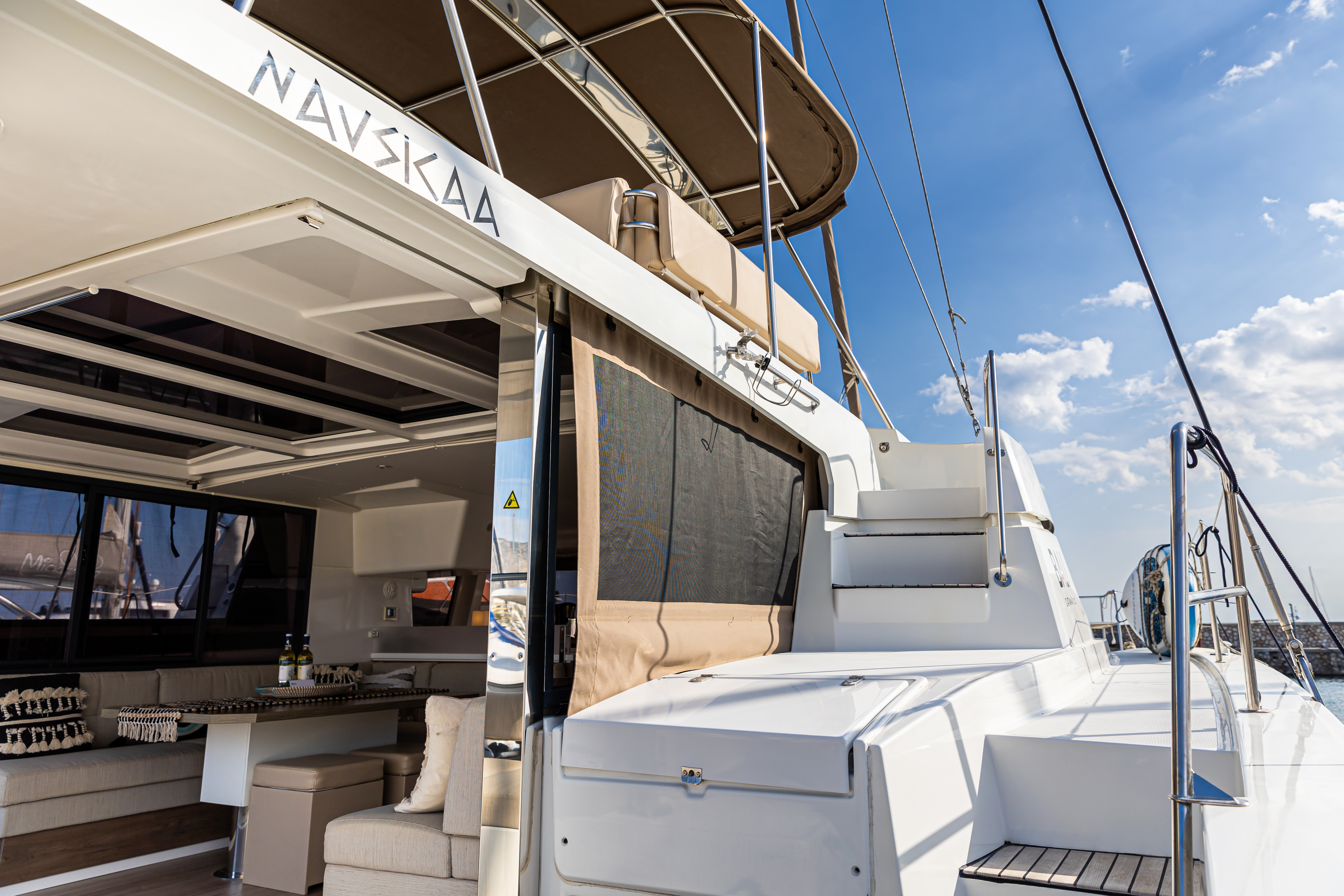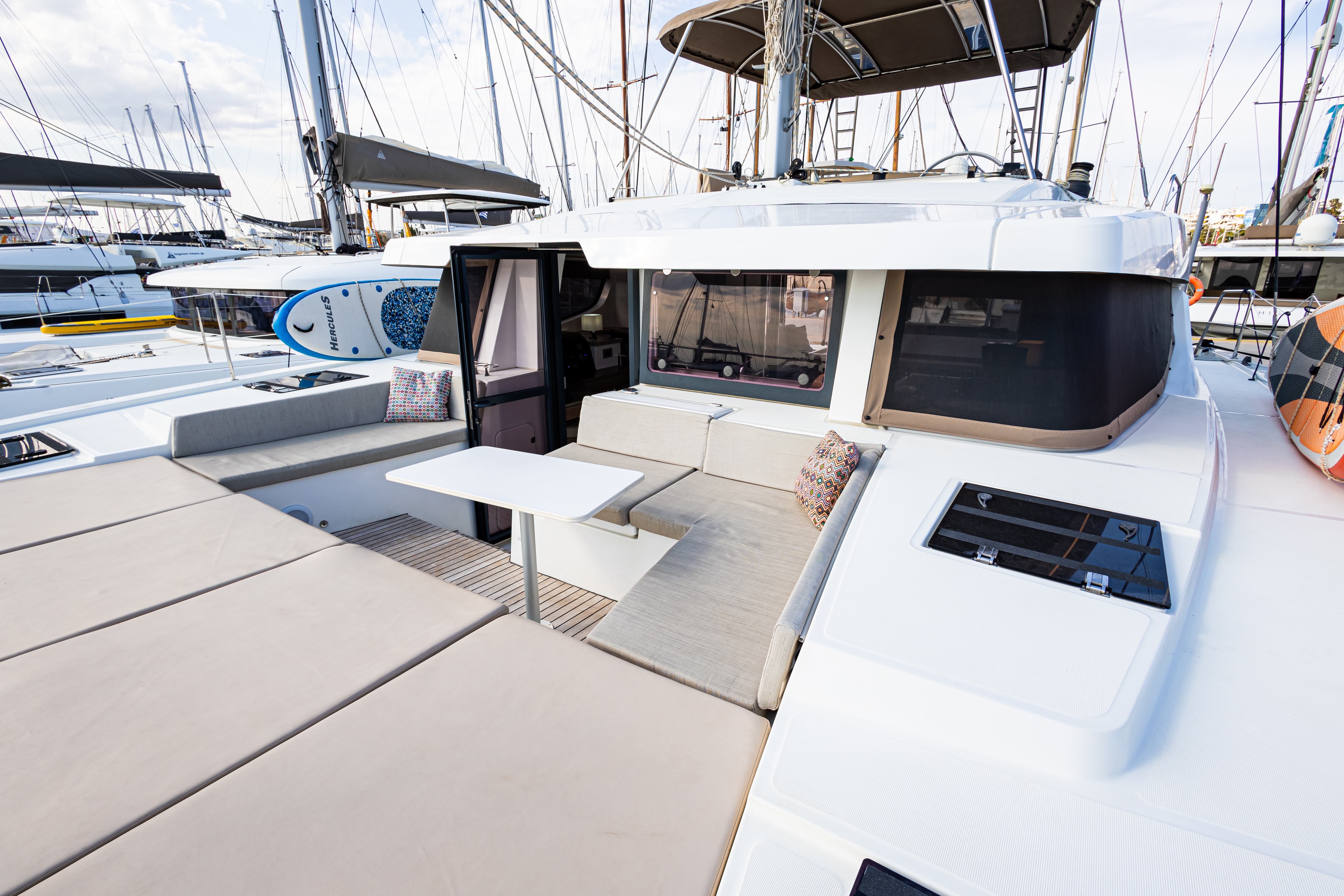 VHFFirst Aid KitGiubbotti di salvataggioDinghy with Outboard engineBiminiSprayhoodTavolo in pozzettoWinch elettricoFull set of electronic instrumentsSerbatoio acquaComplete safety with automatic life vests & galley equipmentAluminium-teak gangway230V InverterPannelli solariScaletta per il bagnoGPS plotterAir-conditioningAnchor chainElectrical davitsSalpa ancora elettricoGeneratoreGenoaMainsailWatermakerLazy jacksComplete navigation systemLazy bagBatterieCoffee machineElectric gangwayGas ovenElectric Davits