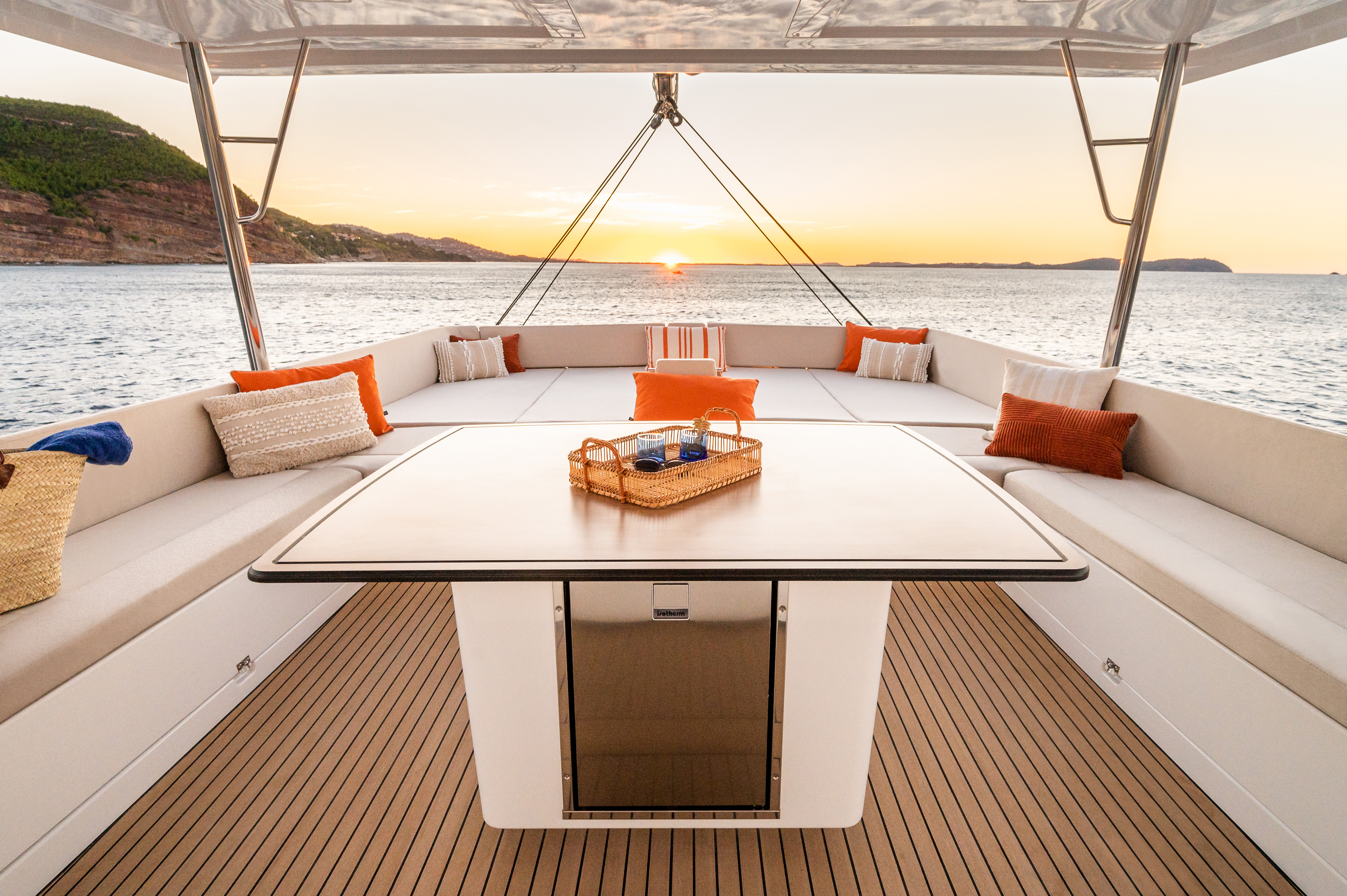 Aft bench cushionsComfortable swim ladder with large handles and teak stepsInverterAmerican fridgeHot & Cold cockpit showerForward cockpit cushionsElectric toilet head with fresh waterSaloon litling bayAft back cushionsGas oven2 extra service batteries of 110 AmpTenderlift hydraulic platformWatermakerWine caveMacchina del ghiaccioHouse fridge freezer (615L) with chilled water, ice maker and inverter Pannelli solariAft cockpit courtesy lightingHelmsman seat cushionBlinds in all cabinsMattress springsHard TopGeneratorePlotterBussolaGPSAltoparlanti in pozzettoCaricabatterie4 underwater LED lightsSound system salon/cockpit/Upper deckAir conditioning in cabinsChart table with navigation equipmentsClub corner (two armchairs and a mini-bar)Deep freezerDishwasherForno a microondeFornoPot holder on burner cookingTV in salonComplete anchoring equipmentComplete equipment of moorings and fendersVHFPilota automaticoRanda steccataComplet Raymarine Electronic pack3 blades folding propellerElectric winchesSalpa ancora elettricoPonte in teakTavolo in pozzettoCuscini in pozzettoForward cockpit fixed table with trunk and 8 seater flapsSafety equipment for 12 pax with liferaft and EPIRBComplet Safety equipmentEPIRB - Boa di emergenzaAnchor + chain + bridleAISLazy bagLazy jackGenoa avvolgibileSnorkeling masks and flipperseFoil