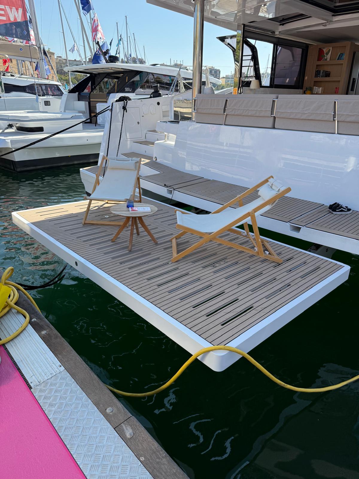 StoviglieCusciniCoperteElectric wcGeneratoreDishwasherWatermakerMicro-wave oven Ice MachineBarbequeCoffe MachineDotazioni di sicurezzaPannello solareElica di pruaRemote anchor controlCabin fansGPS ChartplotterAcqua caldaFuoribordoAncora di rispettoFrigoriferoTacking jibDoccetta esternaRanda steccataVHFLazy bagTimone a ruotaTenderMooring equipmentPompa di sentina manualePompa di sentina elettricaSalpa ancora elettricoBussolaInverterPilota automaticoBiminiAISWinch elettricoTavolo in pozzettoCucina a gas con fornoSkipper toiletEcoscandaglioFlybridgeHIFI systemLog\speedSkipper cabinUSB plugsLadderForward cockpit door32-bottle wine cabinetIndirect lighting around the bedsUnderwater LightsWasher-dryerHydraulic swim platform Fridge sink on the fly Luxury front cockpit tablePonte in teakAir condition fullMacchina del ghiaccioElegance intiriorTV