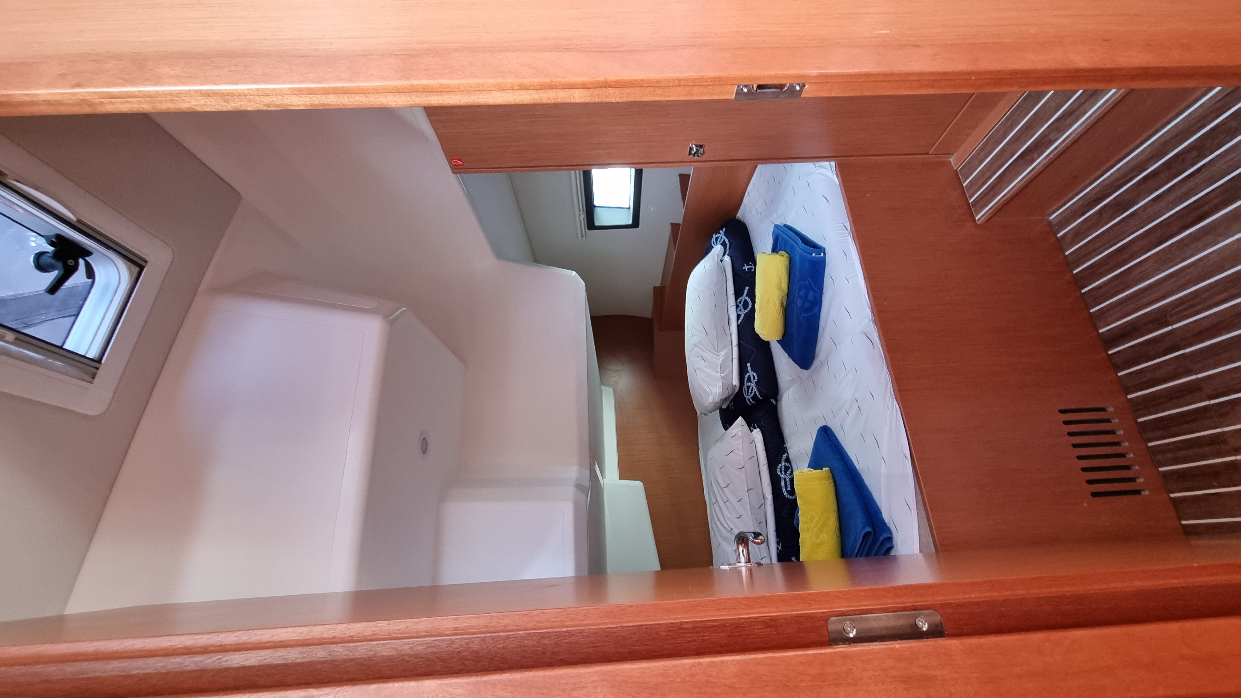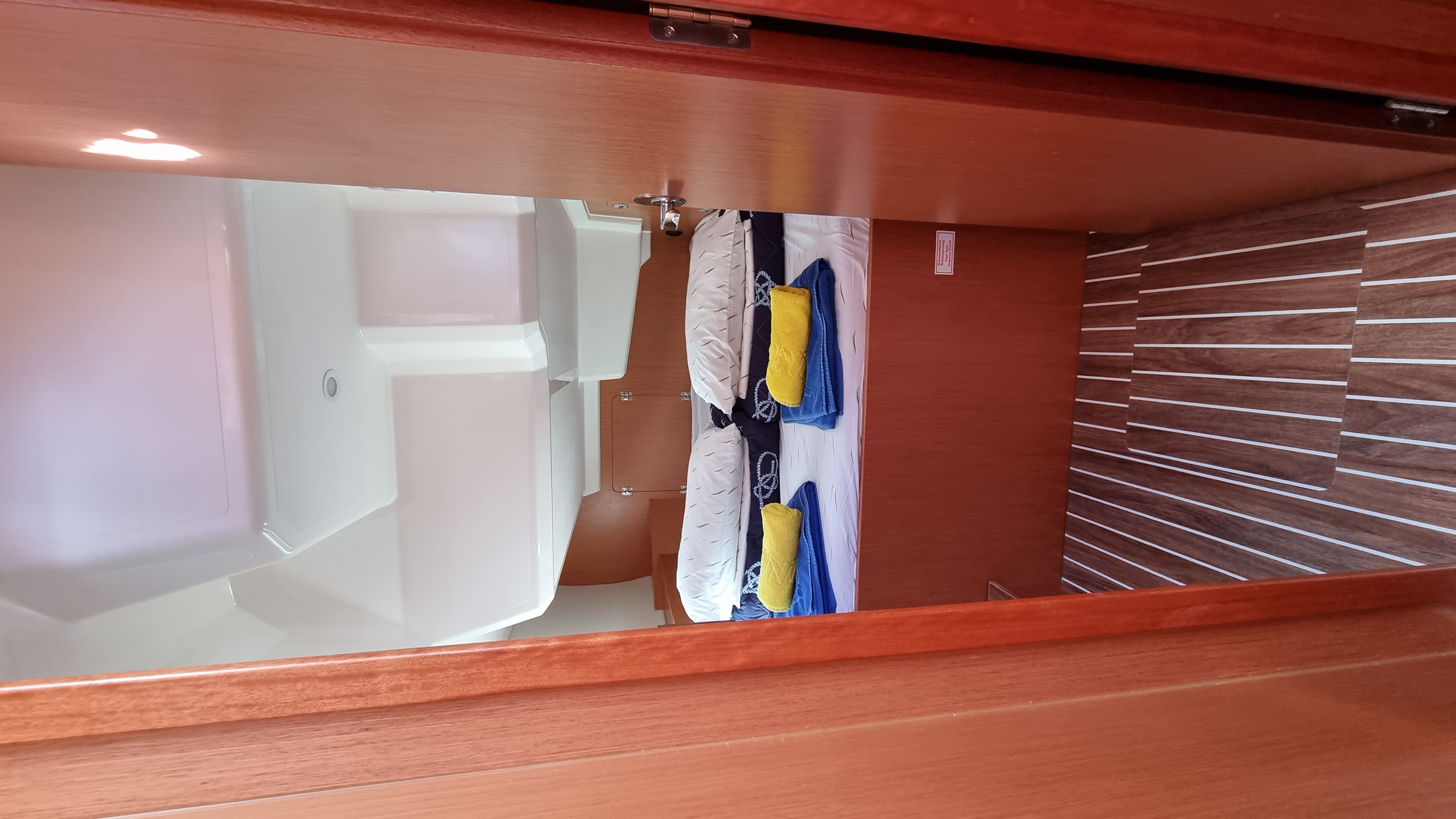 Furling/Roll mainPilota automaticoTavolo in pozzettoBimini TopSprayhoodVHFEcoscandaglioLog SpeedGPSOutboarderDoccetta esternaFridge in galley, 110L, front loadingWindlass (electric)Plancetta Specchio di PoppaElica di PruaSelf tacking jibBlinds on side & panoramic windowsTeak on cockpit floorElectric toilette 2xAutomatic life jacketsGPS plotter esternoWebastoInverterMosquito screensSolar panels Fusion radioCuscini in pozzetto
