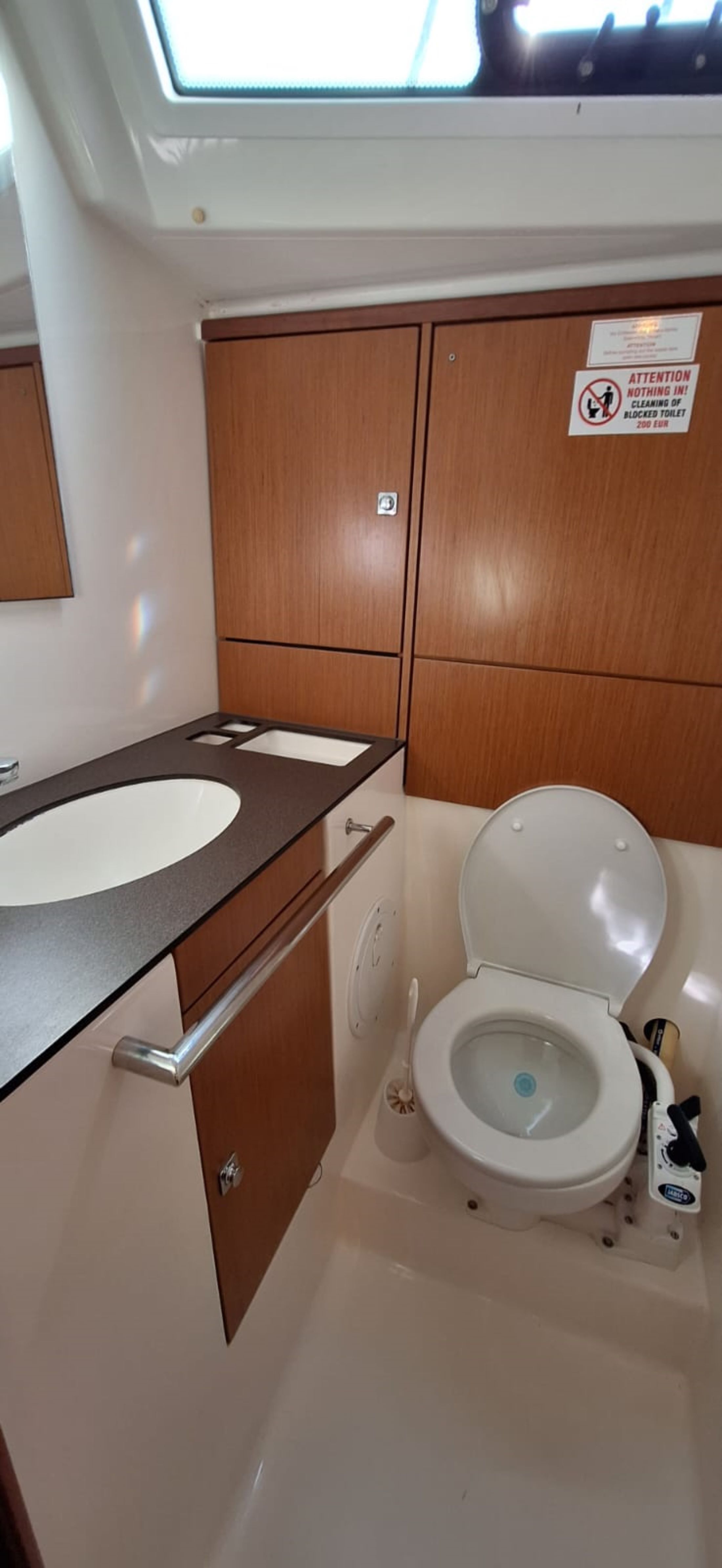 Bimini topPlancetta Specchio di PoppaPasserellaSprayhoodTavolo in pozzettoCockpit/stern outside showerScaletta per il bagnoDinghy + pumpFuoribordoAncoraCime di ormeggioPlastic bucketSpare anchor (reserve, auxiliary anchor)Maniglia WinchImpeller, V-belt, oilfilterSalpa ancora elettricoAnchor swivelBlack ball Mezzo marinaioParabordiSpring lineManichetta acquaKit di primo soccorsoSegnale sonoroHorseshoe lifebouyLife jackets per personDistress flare boxLife belts (Safety harness x2)Distress signalsSet of toolsRadio VHFTorciaEstintoreZattera di salvataggioRanda avvolgibileGenoa avvolgibileFrigoriferoAcqua caldaMoka potLavelloKitchen utensils (Galley equipment, cutlery)Bombole gasStufaOutdoor speakersBluetooth playerIndoor speakersWi-Fi internet (unlimited)Elica di pruaBussolaDeptsounderGPS chart plotter - cockpitBinocoloSet di navigazioneHarbour guidesNavigation (Nautical) charts and nautical guideStazione VentoRiflettore radarAISBussola da rilevamentoPilota automaticoComposite steering wheelsLogge/Lot/Speed/Wind-tridataBilge pump handleConvertible from 4 into 3 cabinsCabin cushions/pillowsDuvet + coverConvertible saloon tableBatterieCaricabatterieBilge pump - Electric230 volt socketPresa 220VPannelli solariHeating-webasto