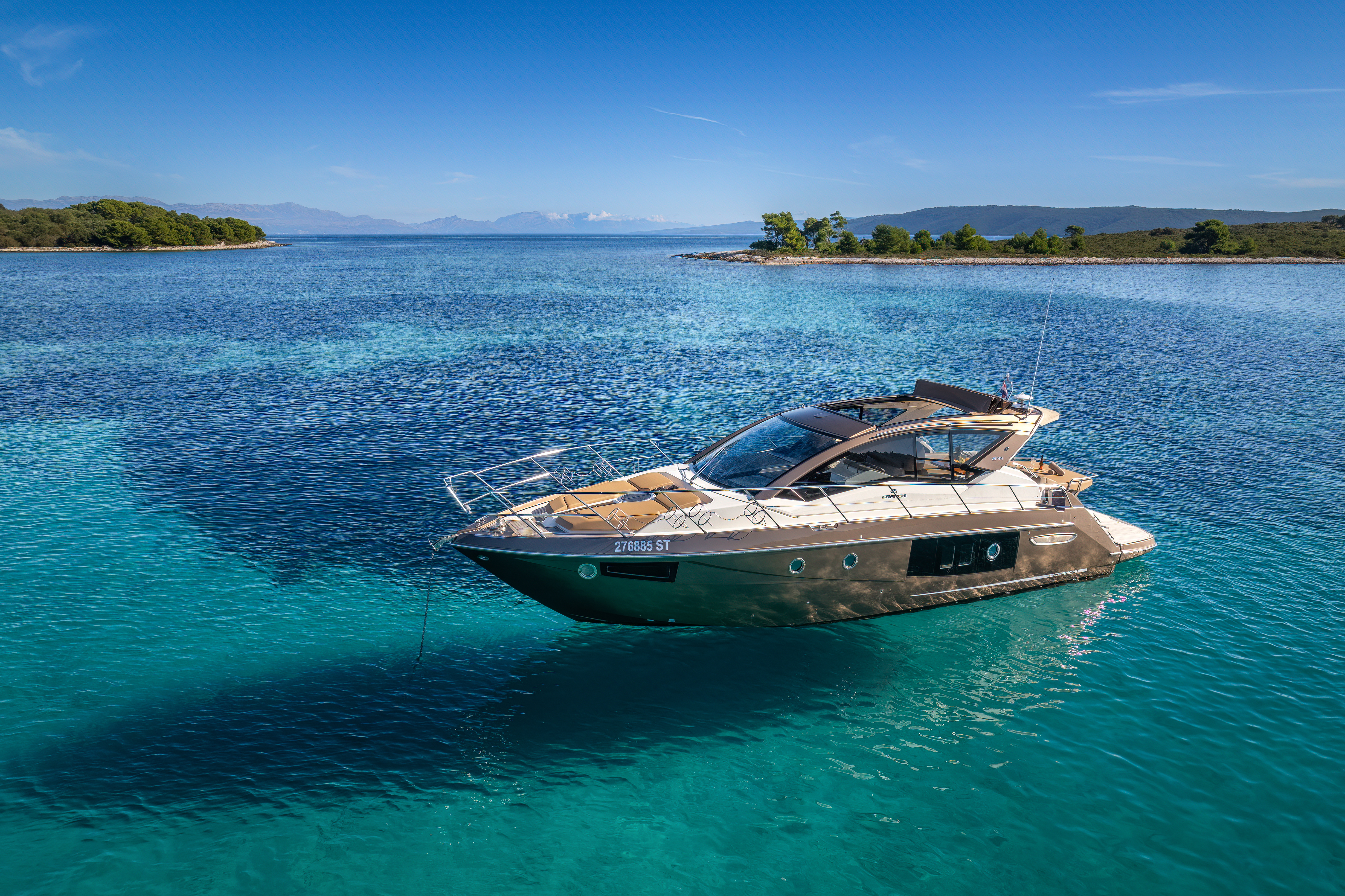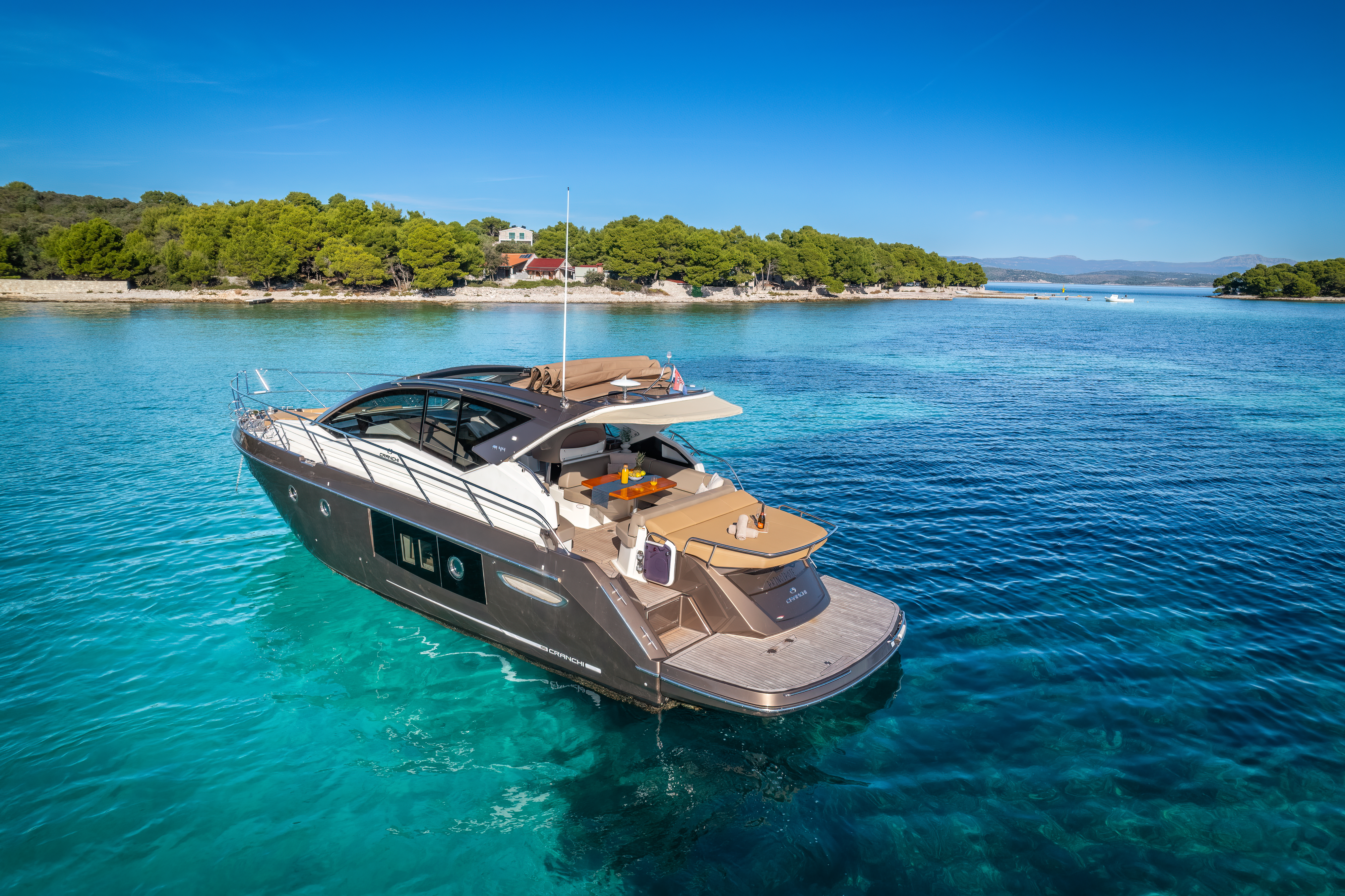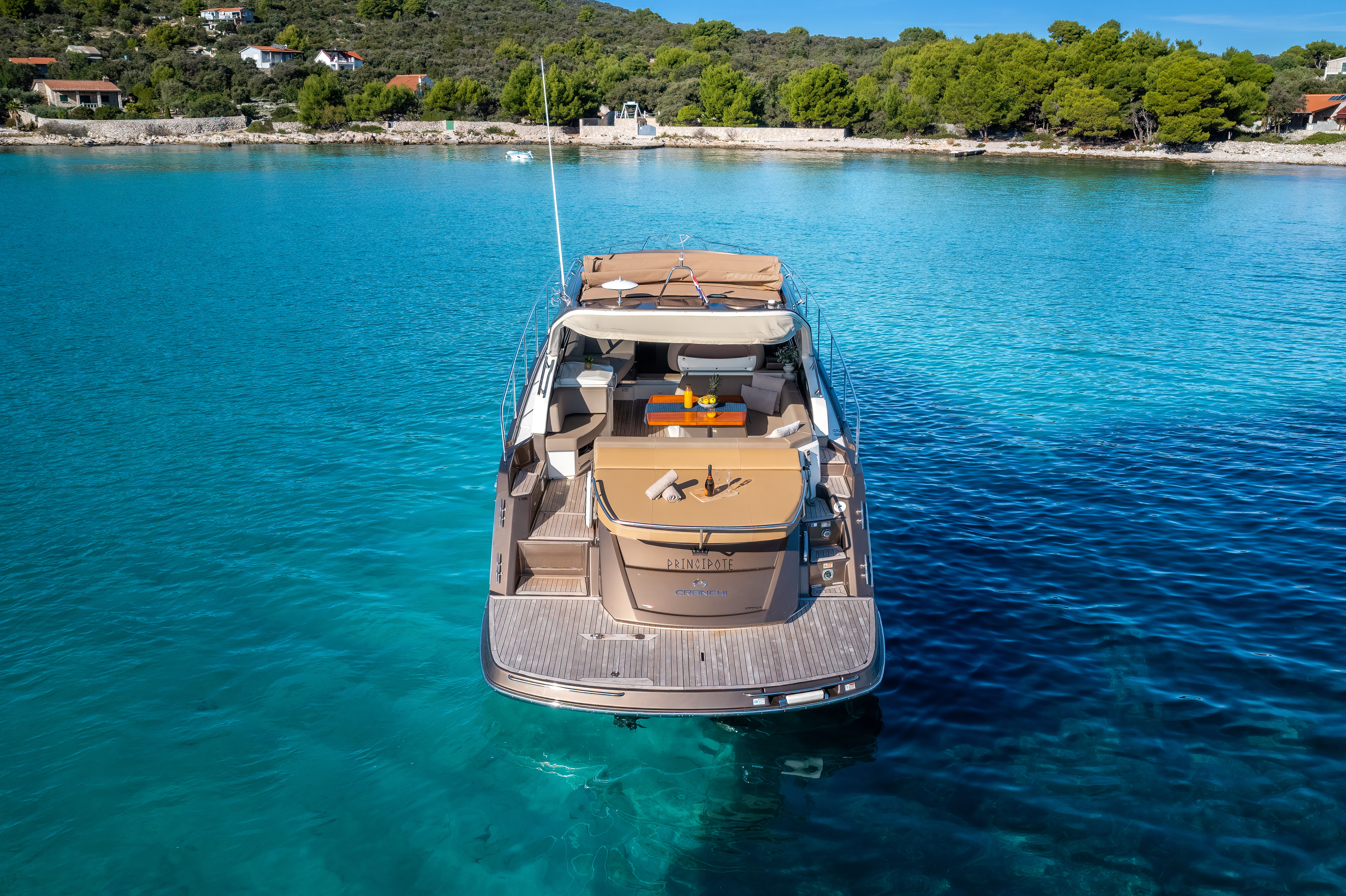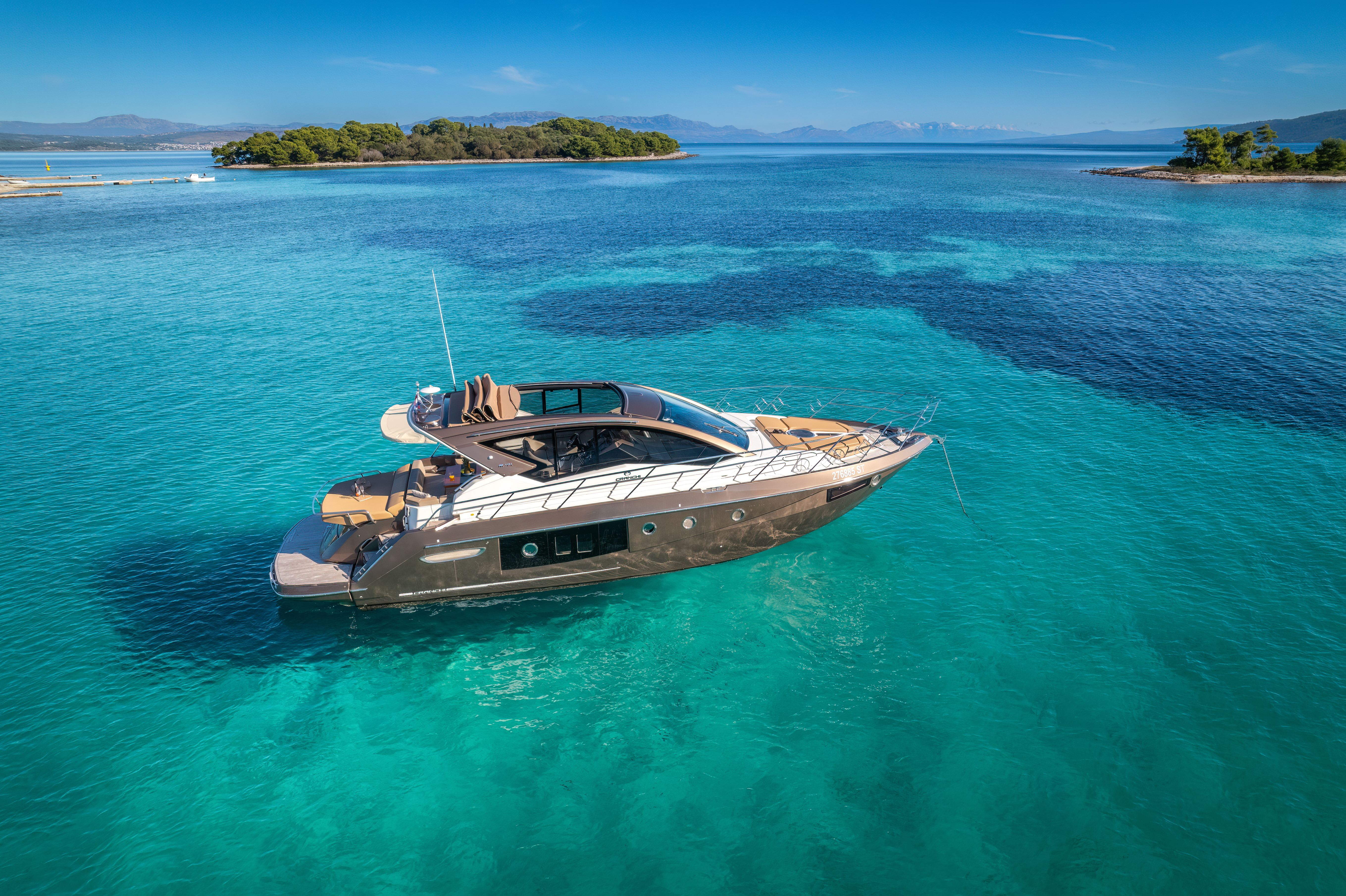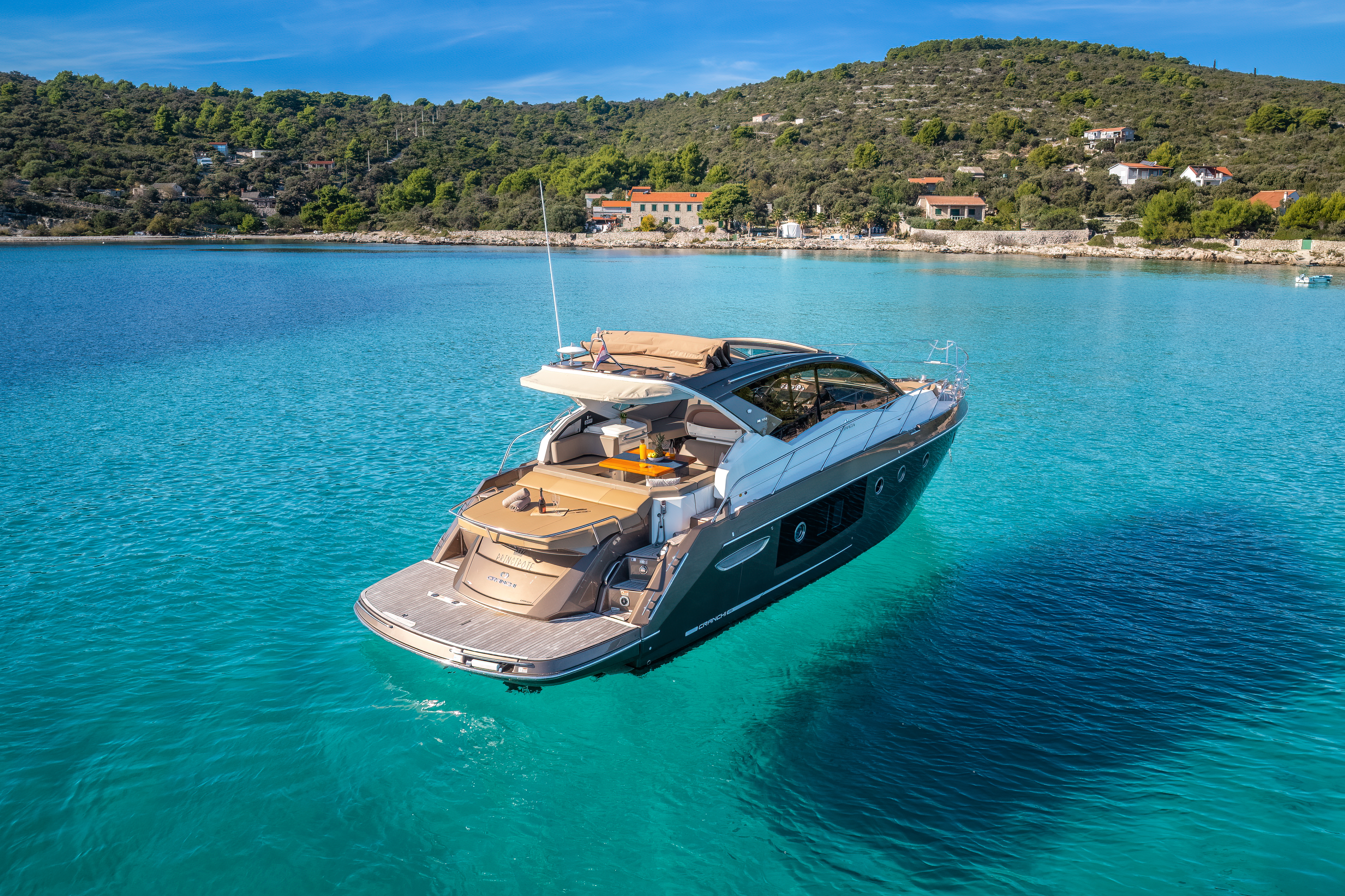 Dinghy with outboard engineSUP boardSnorkeling gearHardtop with a large opening soft topHelm stationU-shaped seatingConvertible dinette/sunbedPortside galley with fridgeWet barGalley (oven, fridge)Aria condizionataRiscaldamentoTVGPSChartplotterVHFElica di pruaJoystick control (engine)Hydraulic gangwayPozzetto in teakSalpa ancora elettricoPlancetta Specchio di PoppaSwim ladderGeneratoreShore powerBoiler acqua caldaWC elettrici