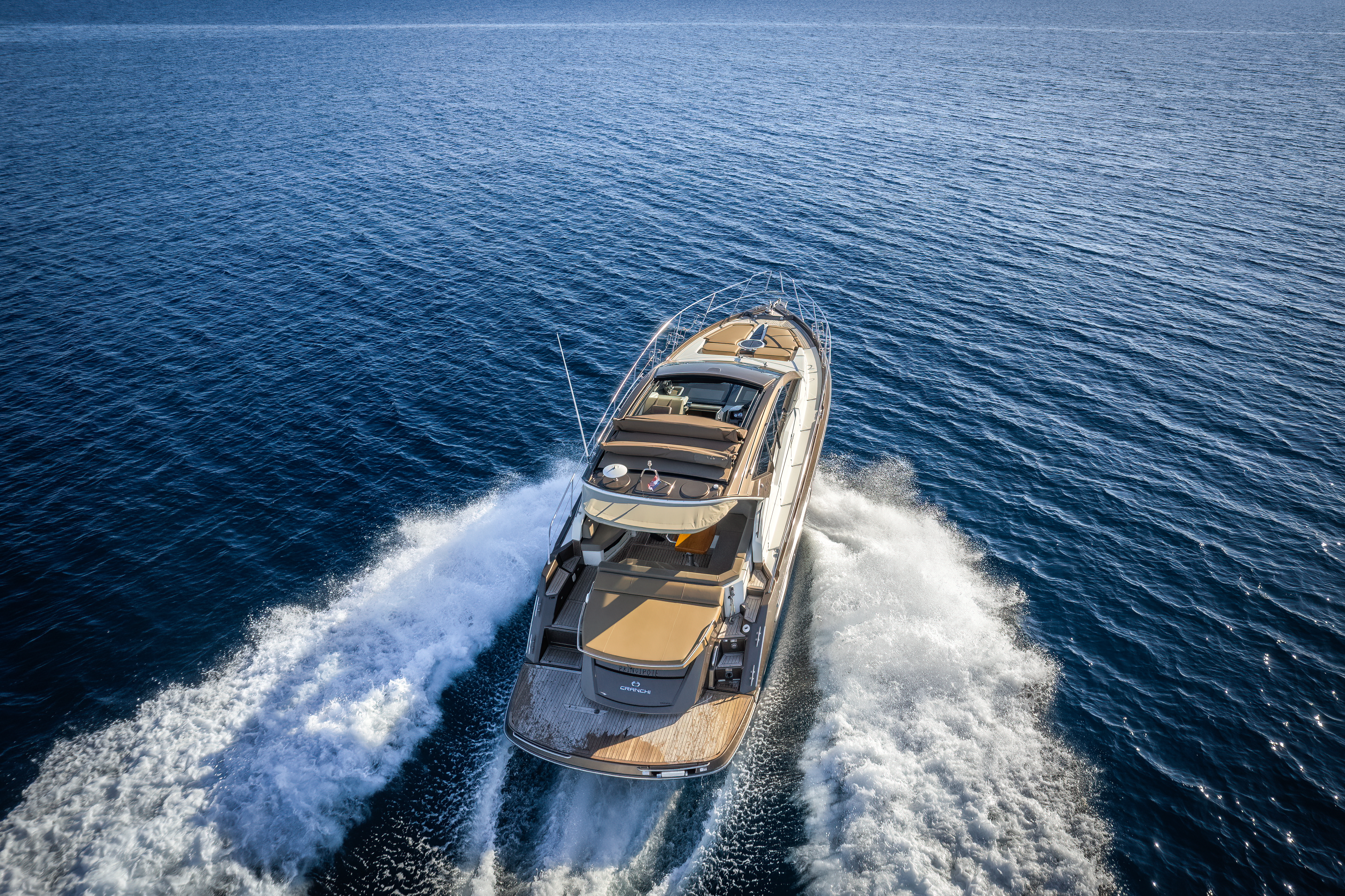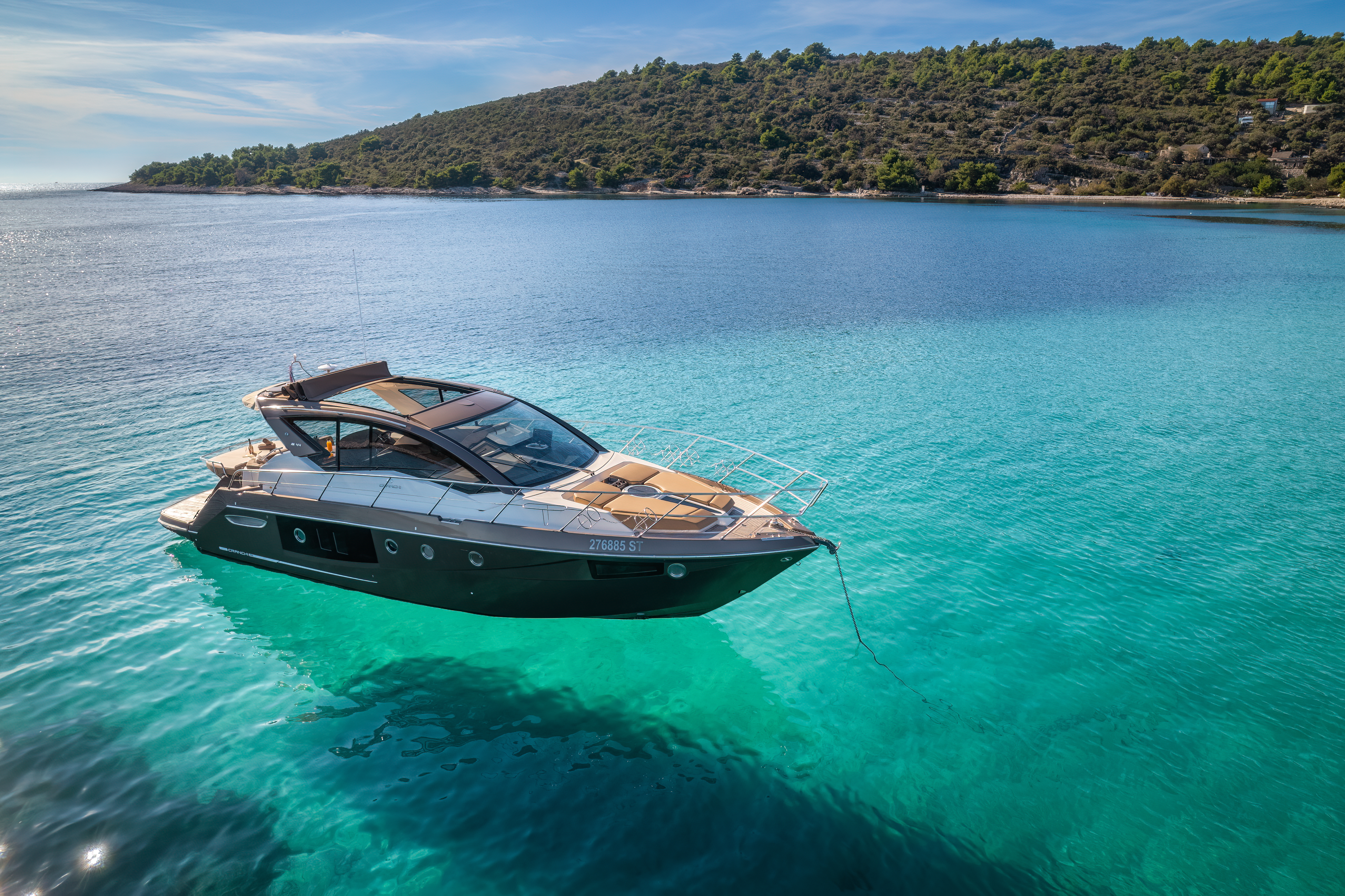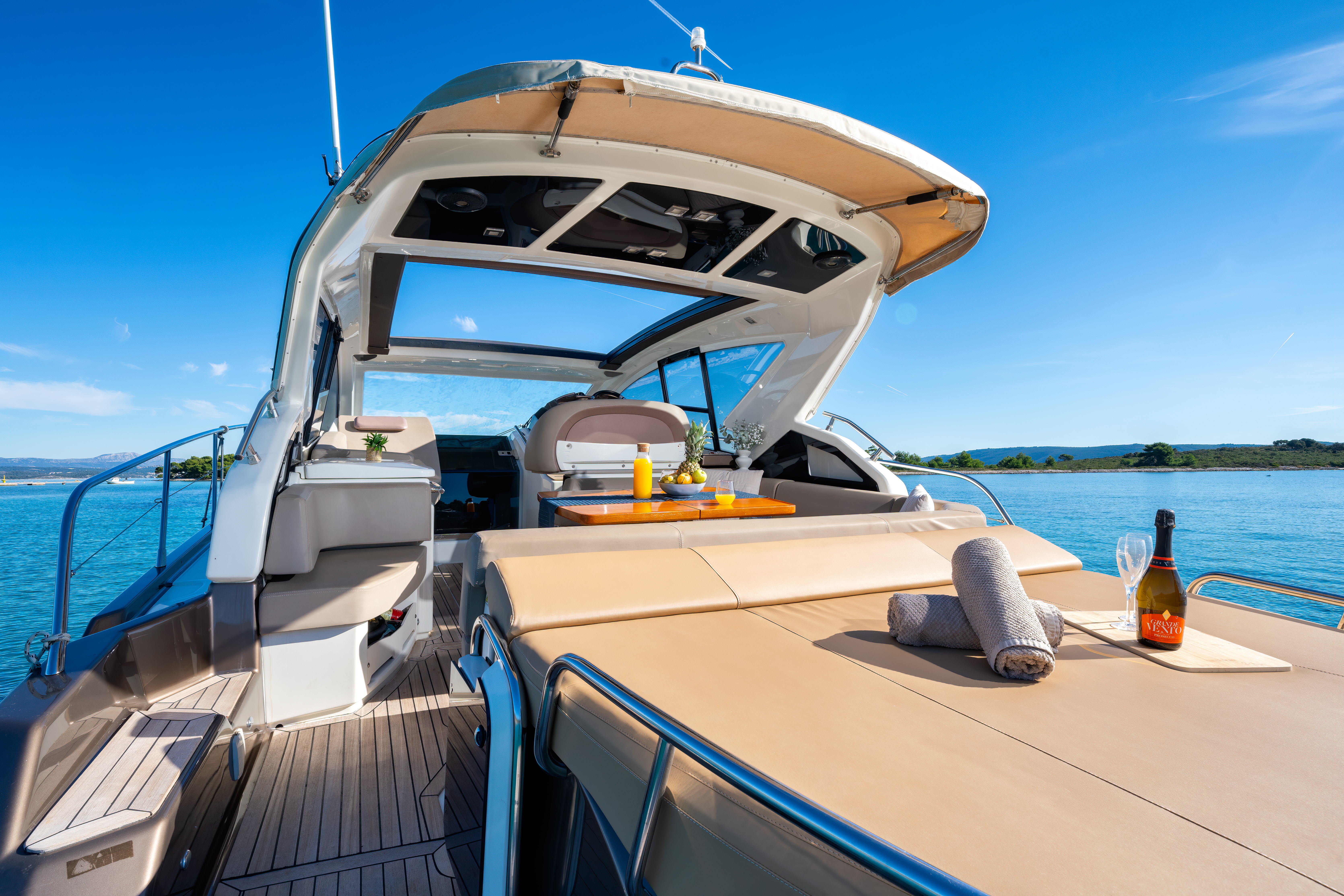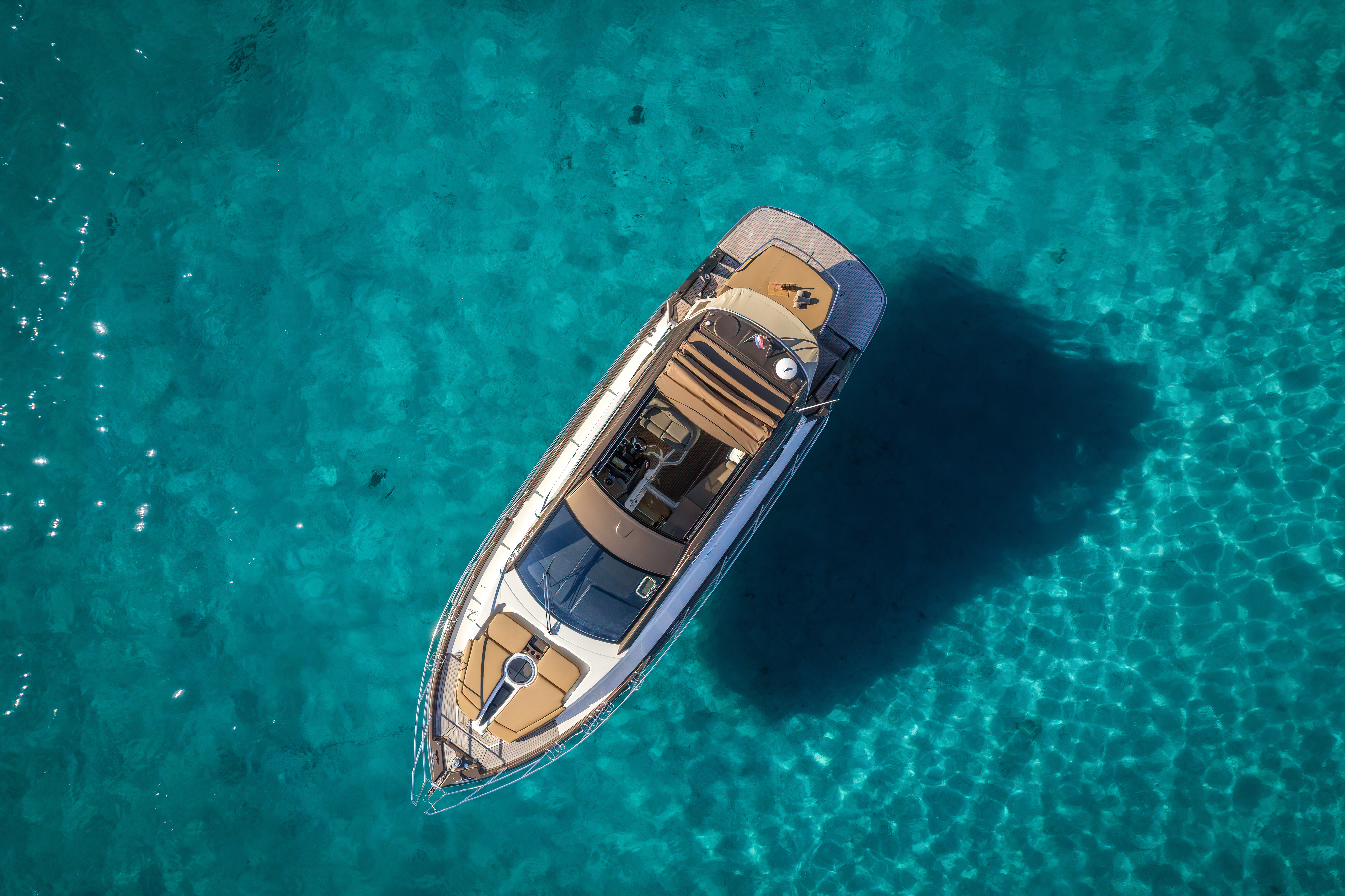 Dinghy with outboard engineSUP boardSnorkeling gearHardtop with a large opening soft topHelm stationU-shaped seatingConvertible dinette/sunbedPortside galley with fridgeWet barGalley (oven, fridge)Aria condizionataRiscaldamentoTVGPSChartplotterVHFElica di pruaJoystick control (engine)Hydraulic gangwayPozzetto in teakSalpa ancora elettricoPlancetta Specchio di PoppaSwim ladderGeneratoreShore powerBoiler acqua caldaWC elettrici