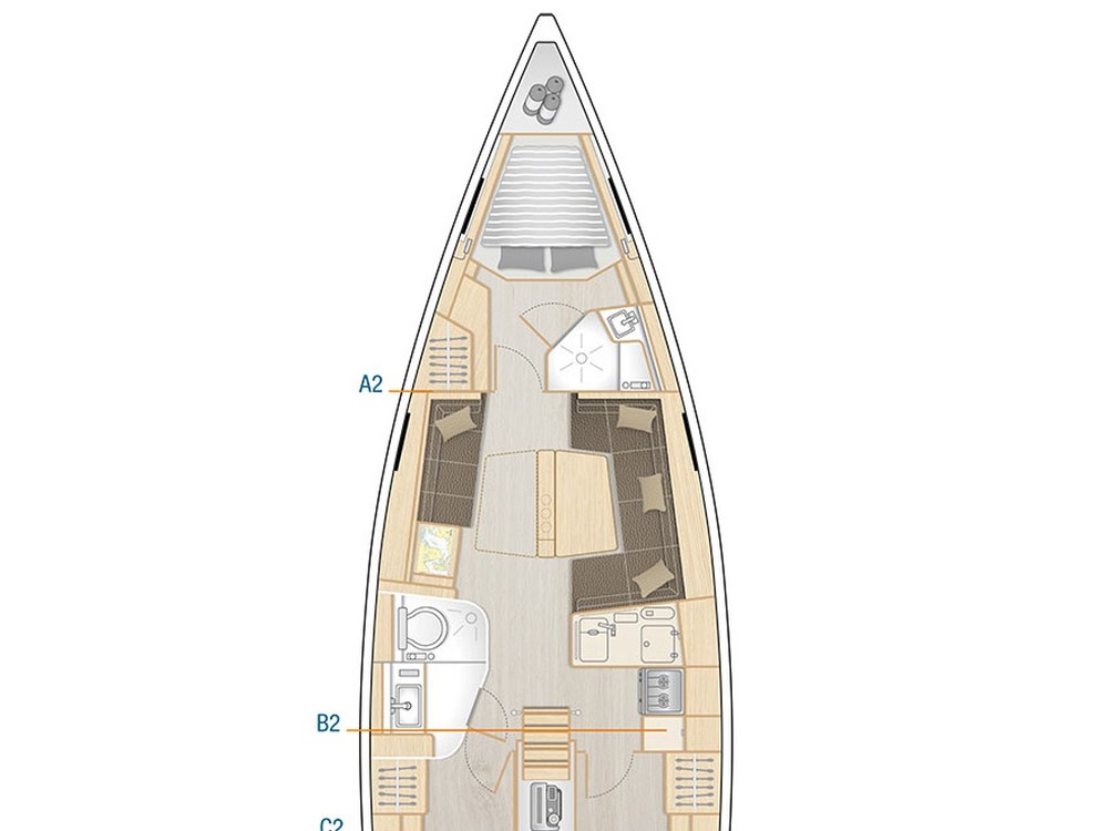 BiminiSwimming PlatformDoccetta esternaTavolo in pozzettoRadio VHFChartplotterPannelli solariElica di pruaAncora di rispettoPilota automaticoGPSSwimming LadderPozzetto in teakBatterieGalley fully equippedFuoribordoEcoscandaglioPresa 220VElectric windlass Attrezzatura per lo snorkelingMain sail Full battenedSprayhoodSelf-tacking jibTenderCuscini in pozzettoSaloon sofa transformed to double bedShades for hatchesAudio systemInverterAcqua caldaForno a microondeWinch elettricoHeaterAnchor control in cockpitSelf tacking jib genoaMarine VHF radioCarbon wheels