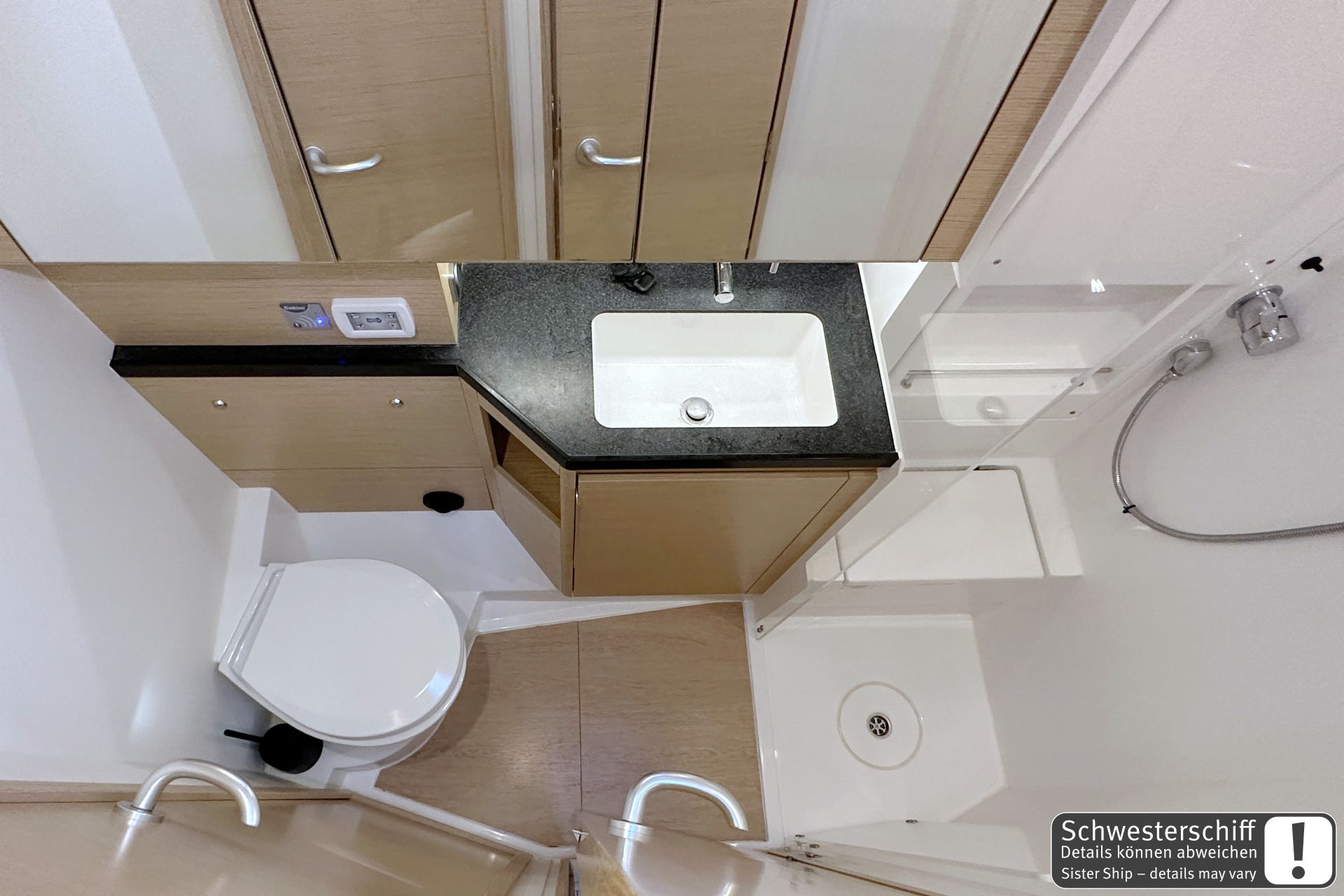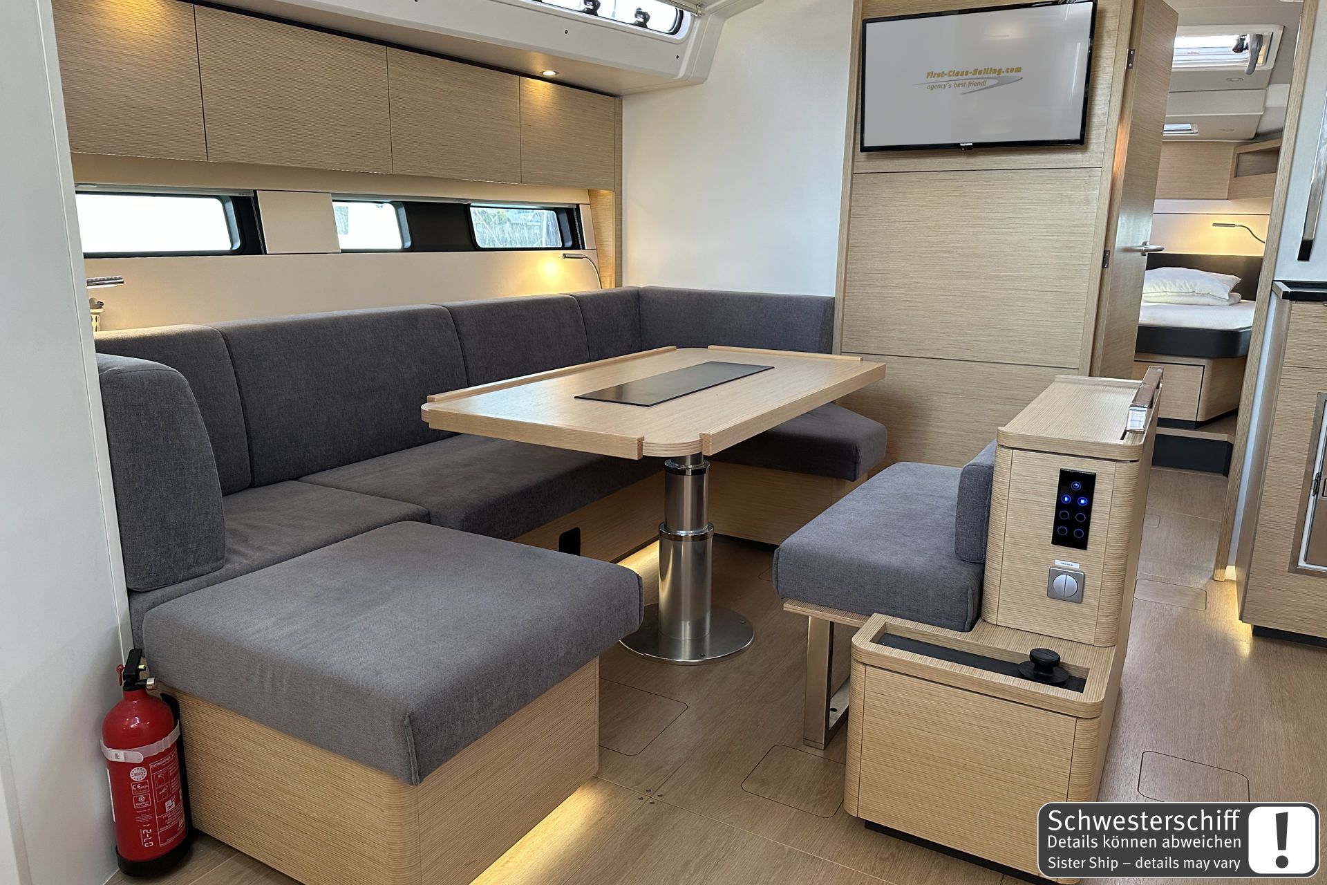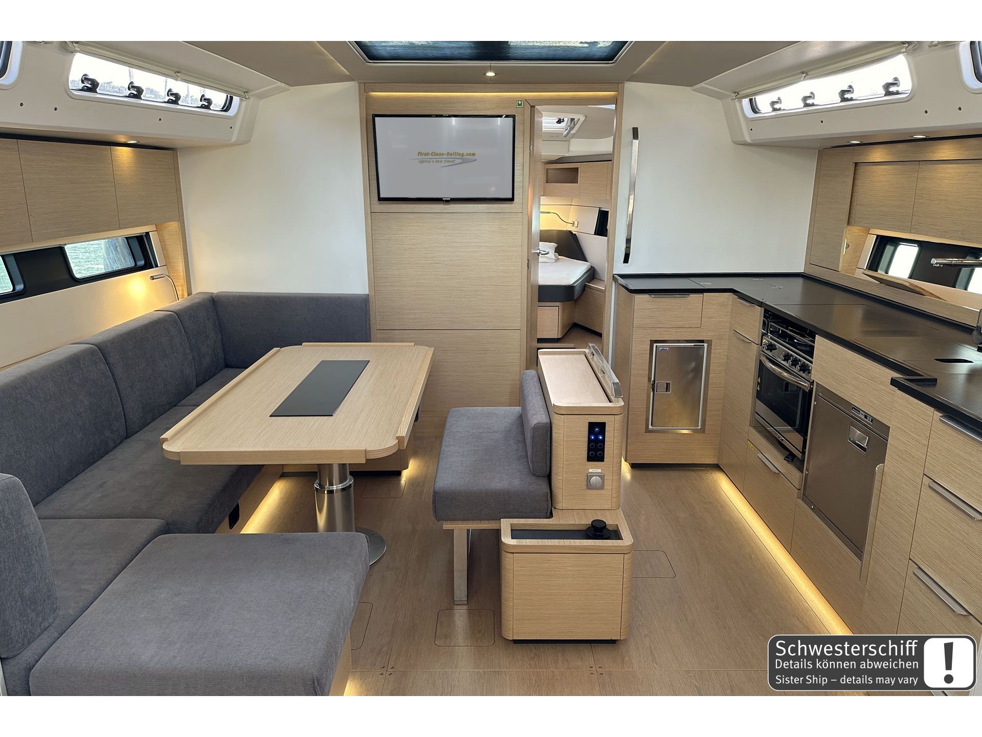 12 V sockets220 V socketsAdapter cableAutomatic charger 220 VFornoPressurized water system with taps pantry12 V RefrigeraterFresh WaterGas stove (2-3 flames)equipped pantryCabin lightingConverter 12V-230VRadio with MP3-CD-PlayerSafeSink in the pantryHotwaterWIFIlowerable salon tableAir ConditionFrigoriferoForno a microondeAnchor lightAutomatic charger 220VCockpit ShowerBiminiScaletta per il bagnoBilge pump electricMezzo marinaioBoatswain's chairBow and stern pulpitSteamer lightSpazzoloneDinghiDouble sea railingElectric shore connection cable 220V, 25 mSalpa ancora elettricoSerbatoio acquaHalyard winches 2 pieces, fenders 6-8 pieces, mooring ropes 4 pieces (30 m)PasserellaMain anchor with 50 m chain, national flagPosition light, contactor, towing line 25 mSchootwinsche, SprayhoodDiving goggles and snorkel (1 Set)Second anchorShroud cutter, tool box, yacht & engine keyBathing platform electricElica di pruaCuscini in pozzettoTavolo in pozzettoComposite steering wheelsFolding propellerGeneratorePozzetto in teakPonte in teakSteering position: 2Rudder blades: 12 trianglesPilota automaticoDiesel canister, binoculars, course calculatorGPSEmergency tiller, bearing compassNautical charts and nautical guidesSumlog and depth sounderClock, CircleRadio VHFStazione VentoAIS receiverRadarFull Batten Main SailLazy JacksSelf-tacking JibLazy BagAutomatic waistcoats with lifebelt or crotch strapEPIRB - Boa di emergenzaEstintoreHalogen headlampBilge pumpsLife-Line safety systemFog horn, emergency flashing lightZattera di salvataggioLifebuoy with swim lineFirst-aid boxDistress signals, torchMore powerful engine, 3-blade folding propeller, synthetic teak on the cockpit floor, cockpit benches, bathing platform and helmsman's seats, retractable centre cleats, bow and stern cleatsCockpit windows in the aft cabins, cockpit shower hot/cold, mast steps, Delta anchor 20 kg - stainless steel with 100 m stainless steel chain, anchor winch 1500W with remote control and chain counterELVSTRØM SPS laminate performance sails, headsails and fully battened triradial mainsails, Dyneema halyards for mainsails and headsails, mainsail traveller systemFloor lighting in companionway, cockpit and saloon, indirect lighting in saloon and cabins, LED ceiling lighting in saloon and cabins – dimmable, 2 fans for deck hatchesSLS - Scenario Lighting System - Touch screen controller and dimmer in saloon and forward cabin, roller blind set with fly screens for deck hatches, roller blinds for hull windows, pleated blinds for side cabin roof windowsFUSION APOLLO MS-RA770 multimedia radio with Wi-Fi and touchscreen – for saloon and cockpit, subwoofer with integrated amplifier in saloon, 4 high-end 2-way speakers in saloon2 high-end 2-way speakers in the cockpit, FUSION MS-ERX400 remote control in the cockpit, FUSION wireless adapter – control via mobile devicesSaloon table electrically lowerable with cushions - convertible to double berth in saloon, furniture - French Oak, flooring - Classic Stripes, flooring - wooden grating for all bathrooms and showersCockpit table with teak top – electrically lowerable to form a sunbathing area, including cushions and extension of the cockpit seating area on starboard sideCockpit table with teak top – electrically lowerable to lying surface, incl. cushions on port side, side access for railing, 2 electric LEWMAR 50 EST EVO halyard winches2 LEWMAR 45 ST EVO genoa winches, electric bathing platform with remote control, electric deck wash pump - connected to the deck in the bow area2 folding helmsman seats, bowsprit with integrated anchor and forestay fitting with double roller incl. 2nd forestay and gennaker eye, lazy bag with lazy jack, throttle lever on instrument panel, helm station starboardGenerator 8000i 6.4 kW, heating: hot air blower in saloon and aft bathroom, air conditioning 28,000 BTU in saloon – fore cabin – aft cabins, additional refrigerator in galley, additional refrigerator in cockpit on port side.