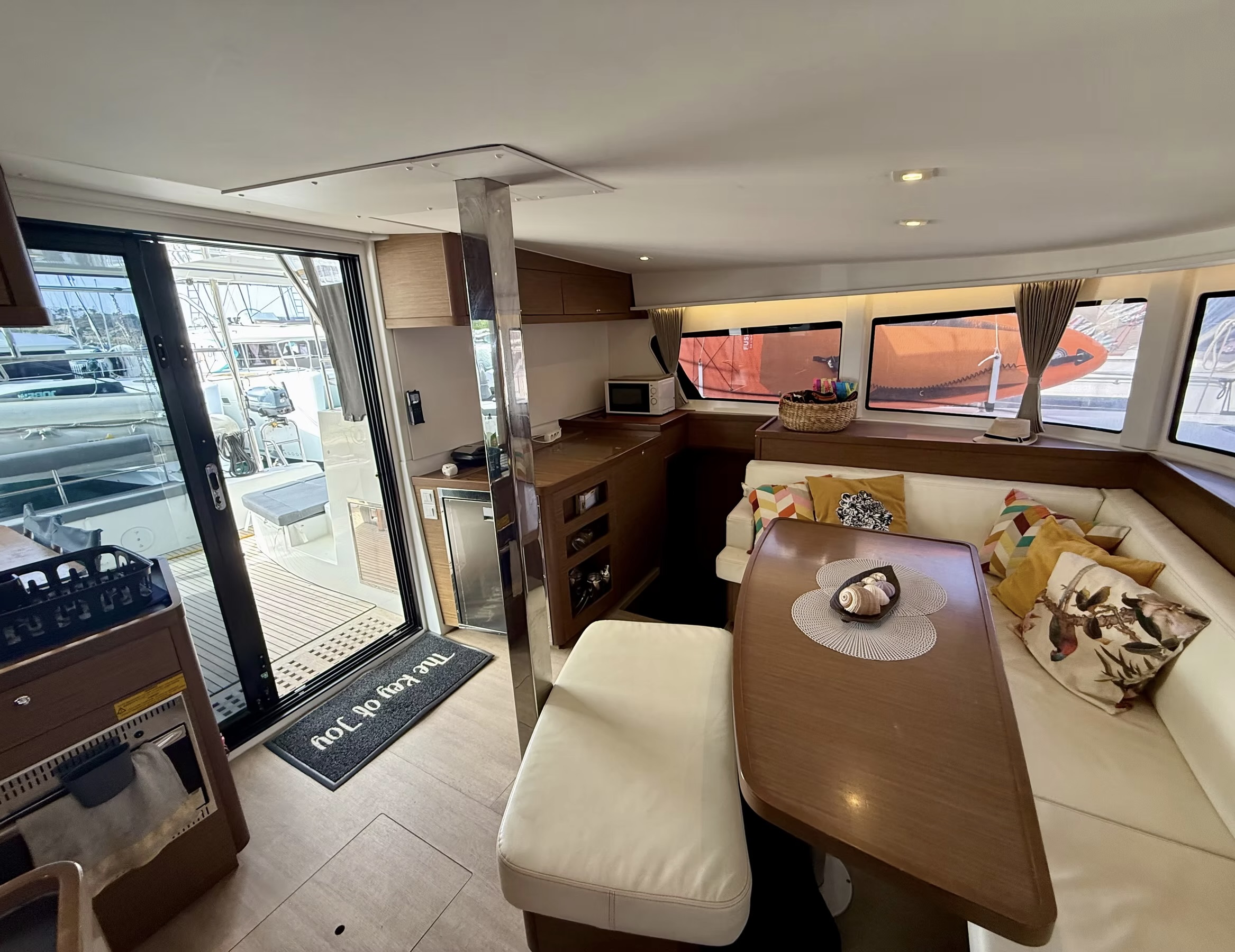 VHFFrigoriferoAria condizionataGeneratoreKit di primo soccorsoSafety HarnessInverterDeep freezerPilota automaticoCaricabatterieBed linens, pillows, pillow cases, towels and quiltsBiminiSprayhoodBansigoCuscini in pozzettoDoccetta in pozzettoAltoparlanti in pozzettoFuoribordoEnhanced sails packEPIRB - Boa di emergenzaEstintoriFlare kitSegnale sonoroFull kitchen equipmentGPS + PlotterHorse shoe buoyAcqua caldaLarge teak wood tableLazy packNespresso machinePump and oarsRiflettore radarRadio/CD/MP3 Player with speakers - bluetoothRepair kit for sails and dinghySails riggingAttrezzatura per lo snorkelingPannelli solariSpeed/Depth/WindTimone a ruotaScaletta per il bagnoPonte in teakToastmakerTool box, engine oil impellerWatermakerUnderwater lightsDinghy With Outboard engine (6hp-Yamaha)Electric heads with fresh water optionOutdoor showerDotazioni di sicurezzaOutside GPS PlotterZattera di salvataggioGiubbotti di salvataggioFire blanketMacchina del ghiaccioFilter coffee makerFornoForno a microondeKitchen utensilsLarge salon-cockpit wooden table (10pax)