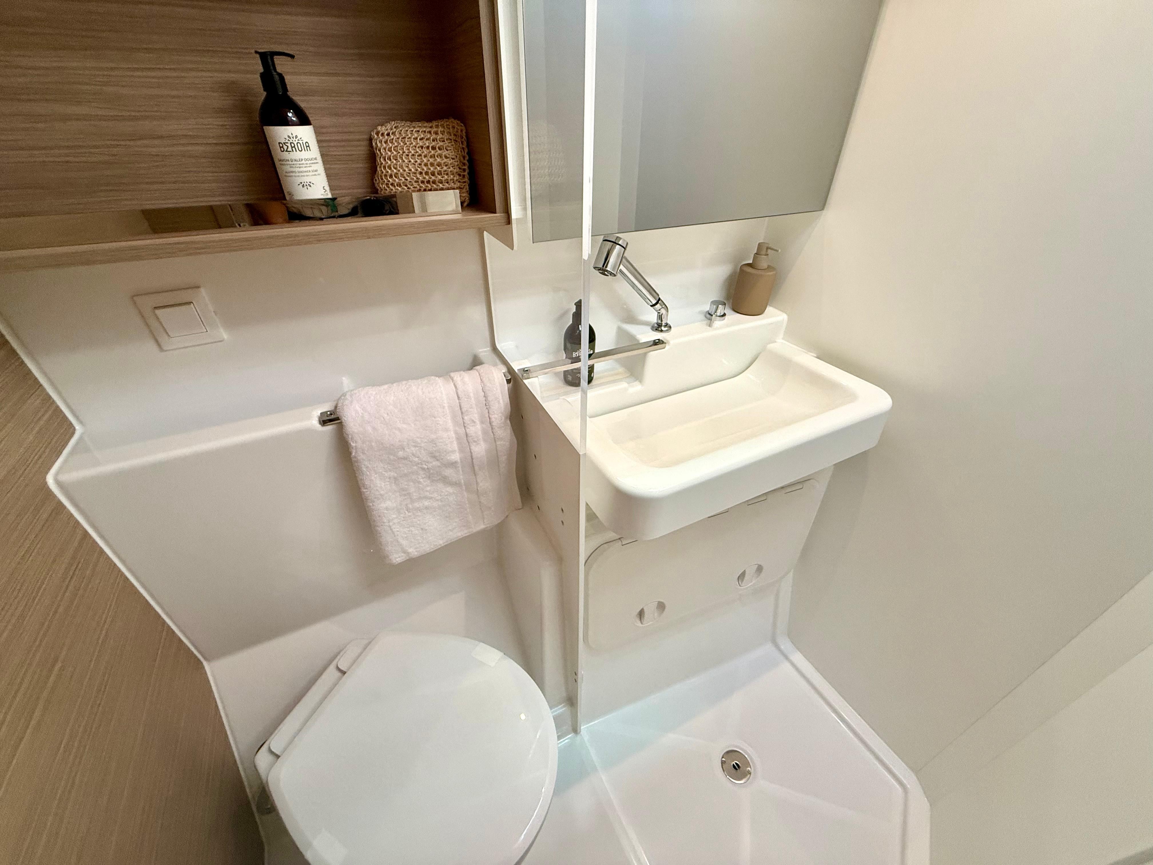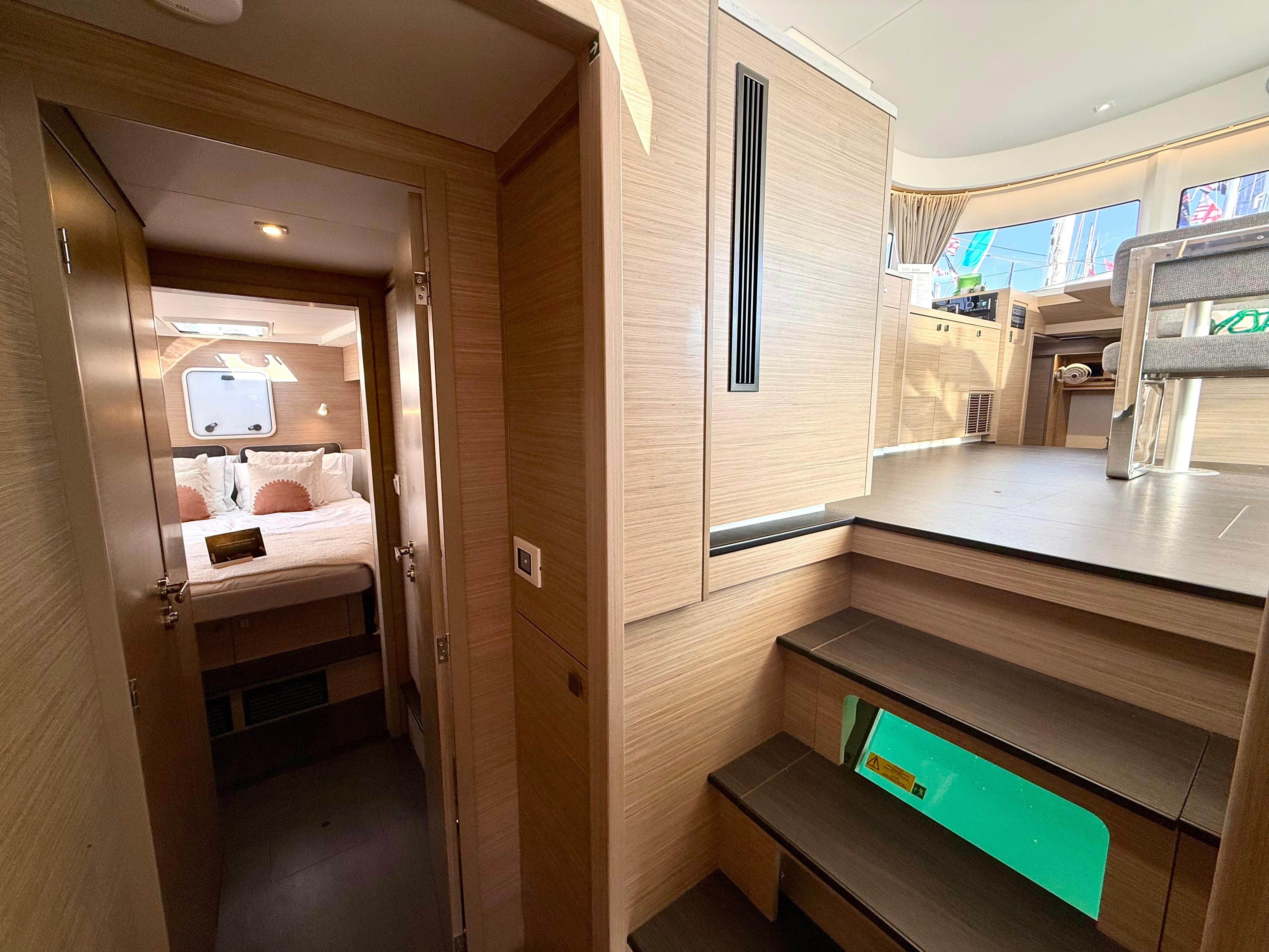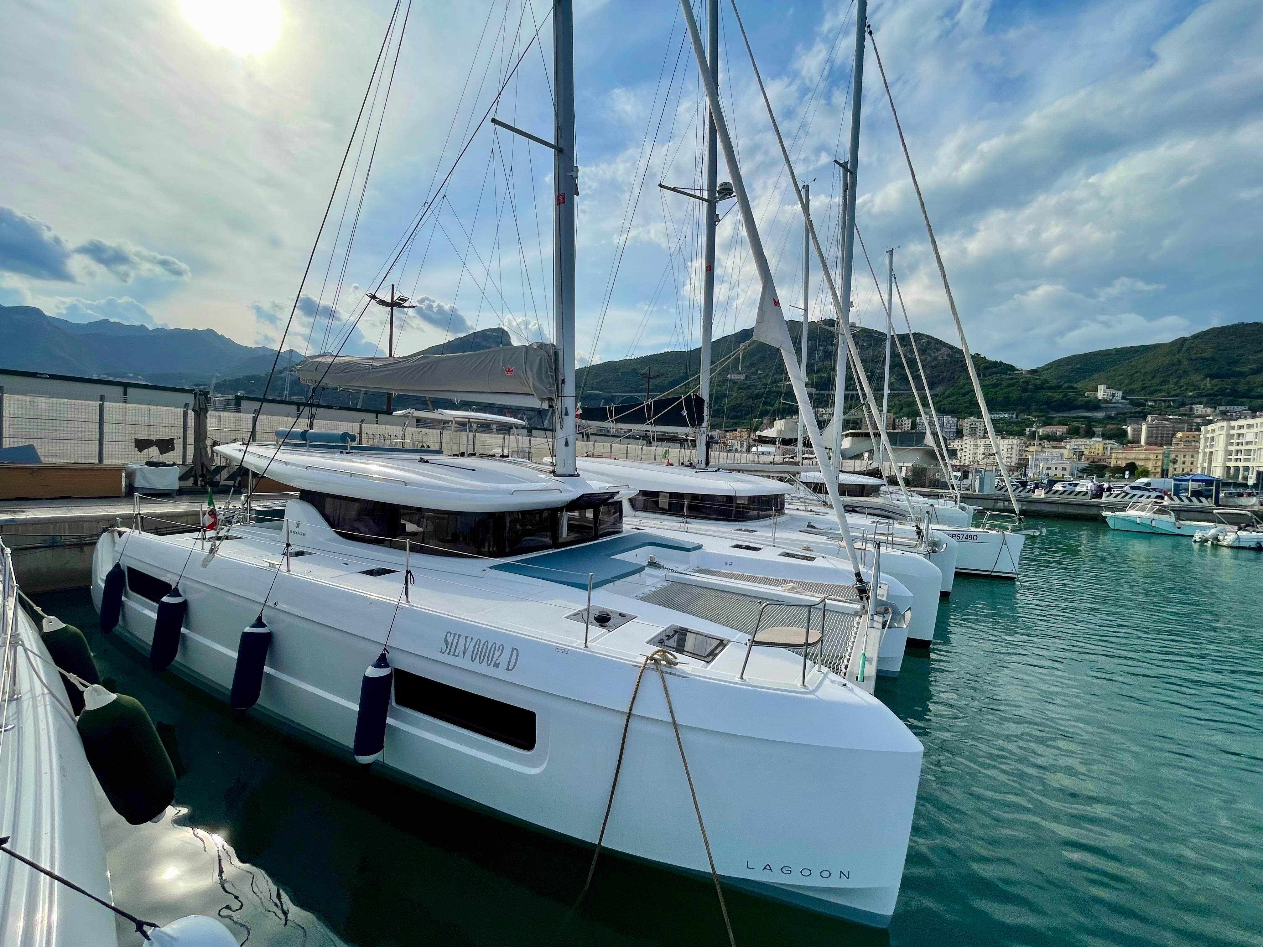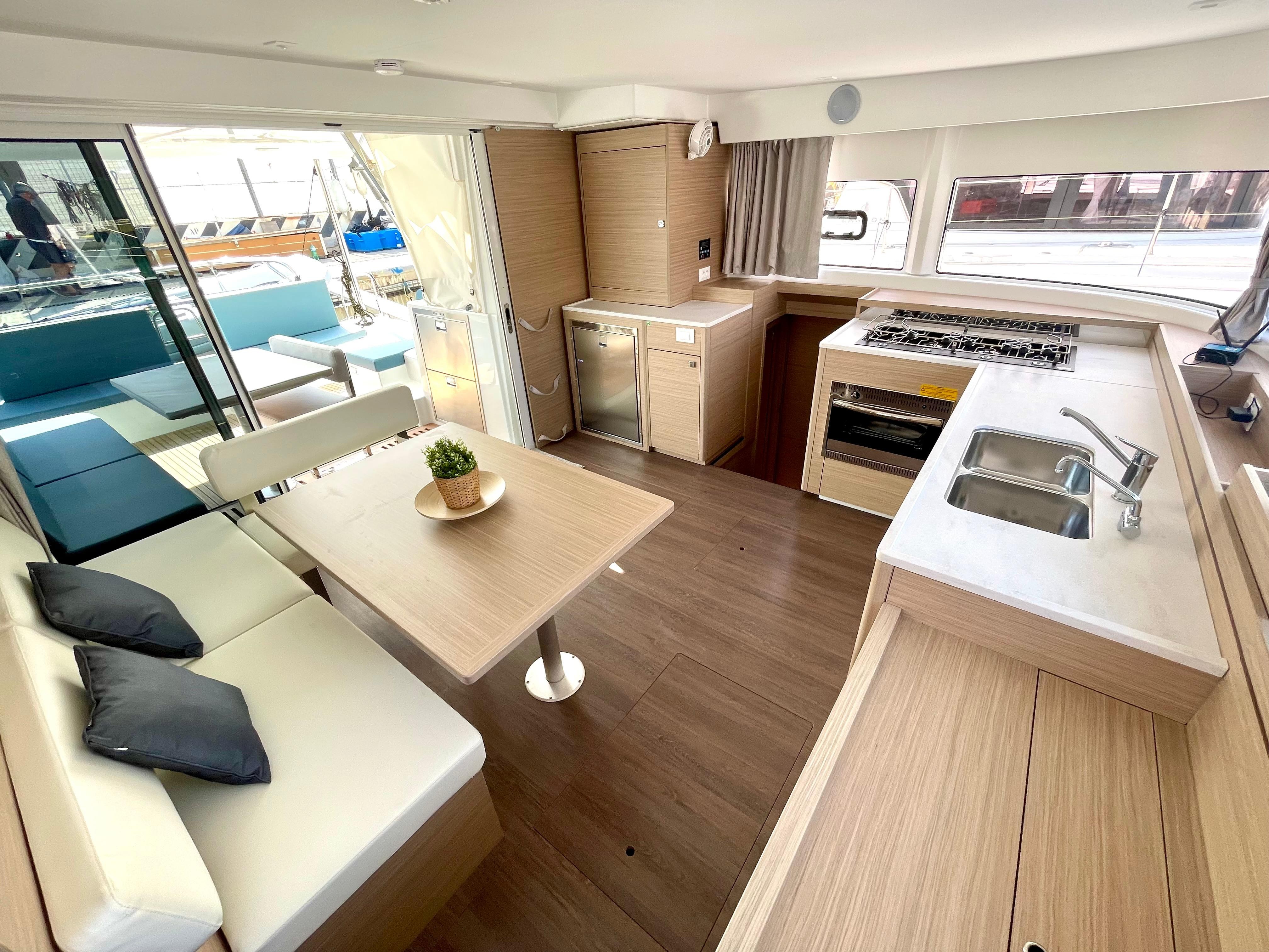 Pilota automaticoPlotter in cockpitUSB SocketGPSRadio - cd players - bluethootSpeakers in Cockpitelectrical winch 50.2 at helm stationanodized aluminium mast and boom on the roofgenoa 37 mqwith Uv protective band1700W/12V electrical windlasscockpit fridge 150Lcomposite bimini, windscreen and enclosurednatural wood on aft cockpit floor and transomswindlass remote control at helm station with chain counteradditional aft portholes in aft cabins with sun curtainsadditional pullman berth in aft port cabin (berth dimensions: 1.80x0.74m)Air conditioning in salon and cabinsconvertible dinettecurtains and blinds in all cabinsfans in salon and cabinslateral portholes in salonseparate shower with PMMA door il all headsraymarine navigation packDINGHY 3,40mtanchor 25kg, 85 m anchor chain D12electric toilets in all cabinsindirect lighting in cabins and saloninternal fridge 12V 130LL-shaped galleyelectrical circuit 220V6 service batteries 95Amp + battery controller 50AmpMonitoring display Navicolorusb sockets in the cabinsdouble helmseat bench and wooden steps for roof accessS/steel dinghy hoist system &manual winch1 automatic immersed bilge per hull, with alarm signalinverter 12/220V 50HZ - mastervolt 2000 kwagenerator genset1 manual bilge pump per hullblack water circuit 4x80L