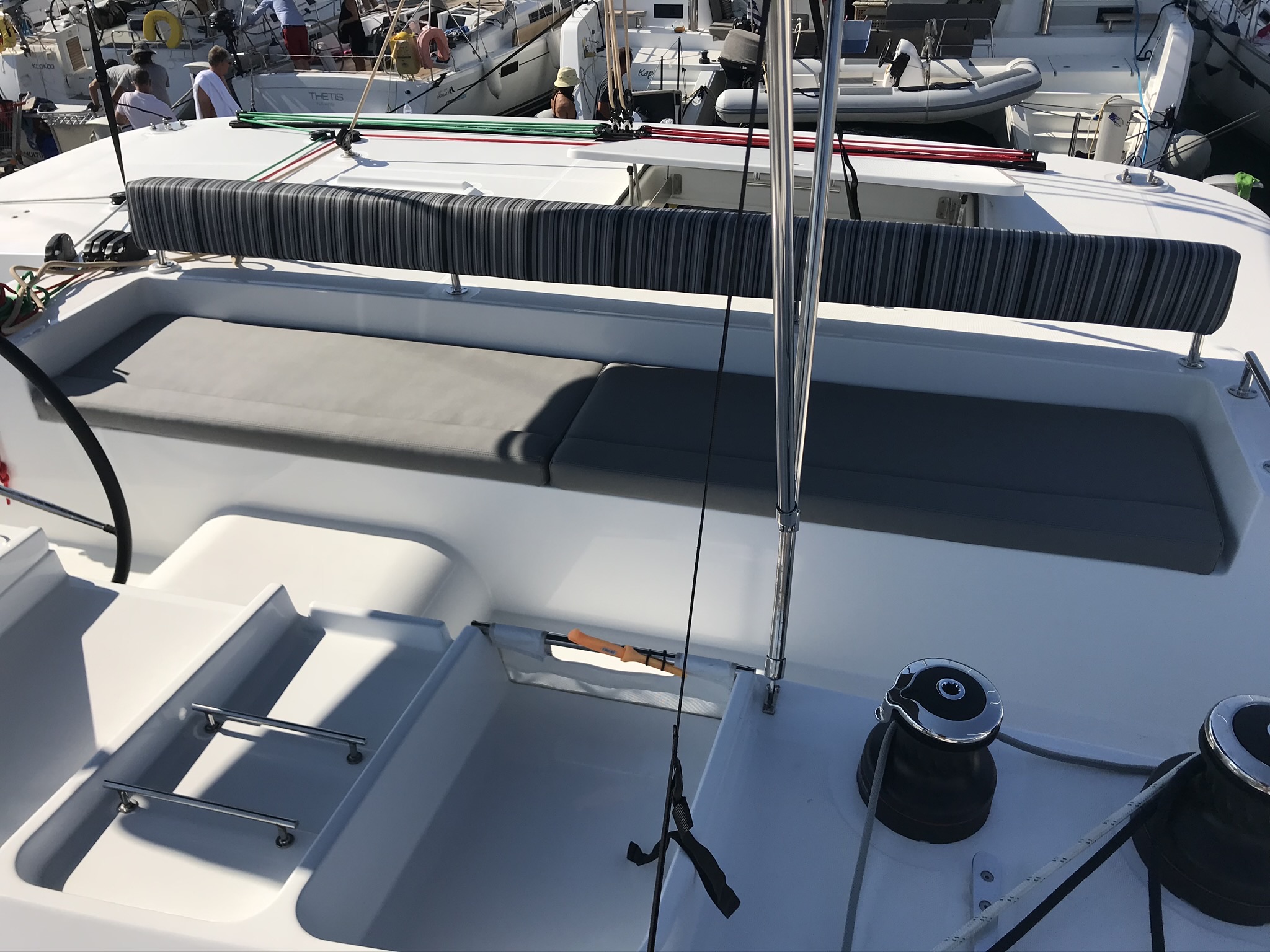 Black ballBlack water tankCuscini in pozzettoCockpit fridgeTavolo in pozzettoCockpit/stern, outside showerSpazzoloneTenderSalpa ancora elettricoElectric winch for mainsailParabordiImbuto per carburanteJerry cans for DieselCime di ormeggioPlastic bucketAncora di rispettoScaletta per il bagnoManichetta acquaManiglia WinchPompa di sentina elettricaGeneratoreInverterPannelli solariWatermaker - desalinatorMobile phoneTVUSB socketAria condizionataCoffee machineCongelatoreBombole gasGas cookersAcqua caldaKitchen utensilsFornoFrigoriferoLavelloToasterLenzuolaBilge pump - mechanicElectric fans in cabinsSalon table AISPilota automaticoEcoscandaglioEchosounder/DepthsounderGPSLog/Speed instrumentWind instrument/AnemometerIndirect lighting in cabins and salonSet of toolsDistress flare boxEPIRB Distress radio beaconsBarra Timone di emergenzaEstintoreKit di primo soccorsoSegnale sonoroInflatable life raftLife jackets autoRadio VHFRanda steccataLazy bagLazy jacks