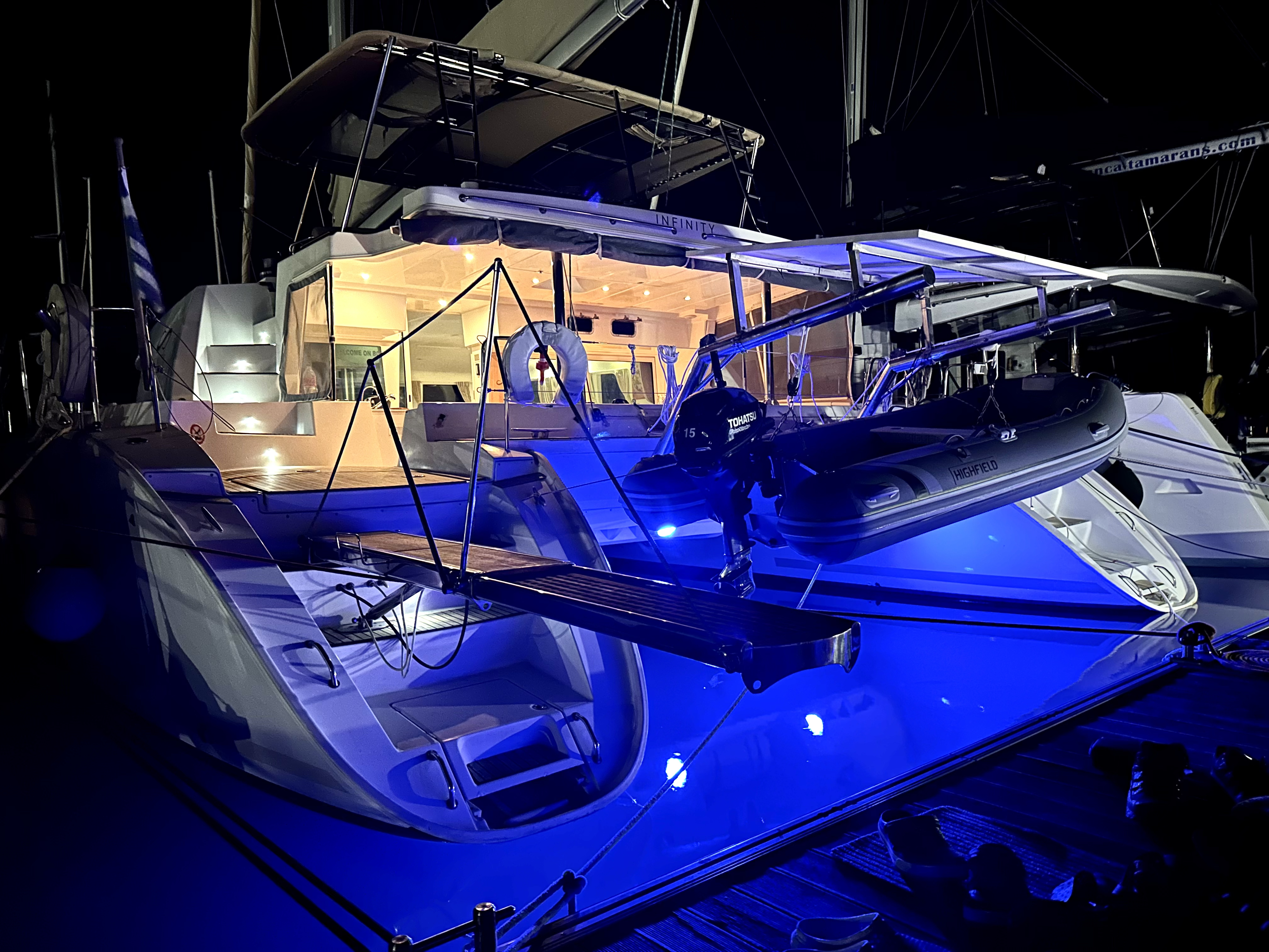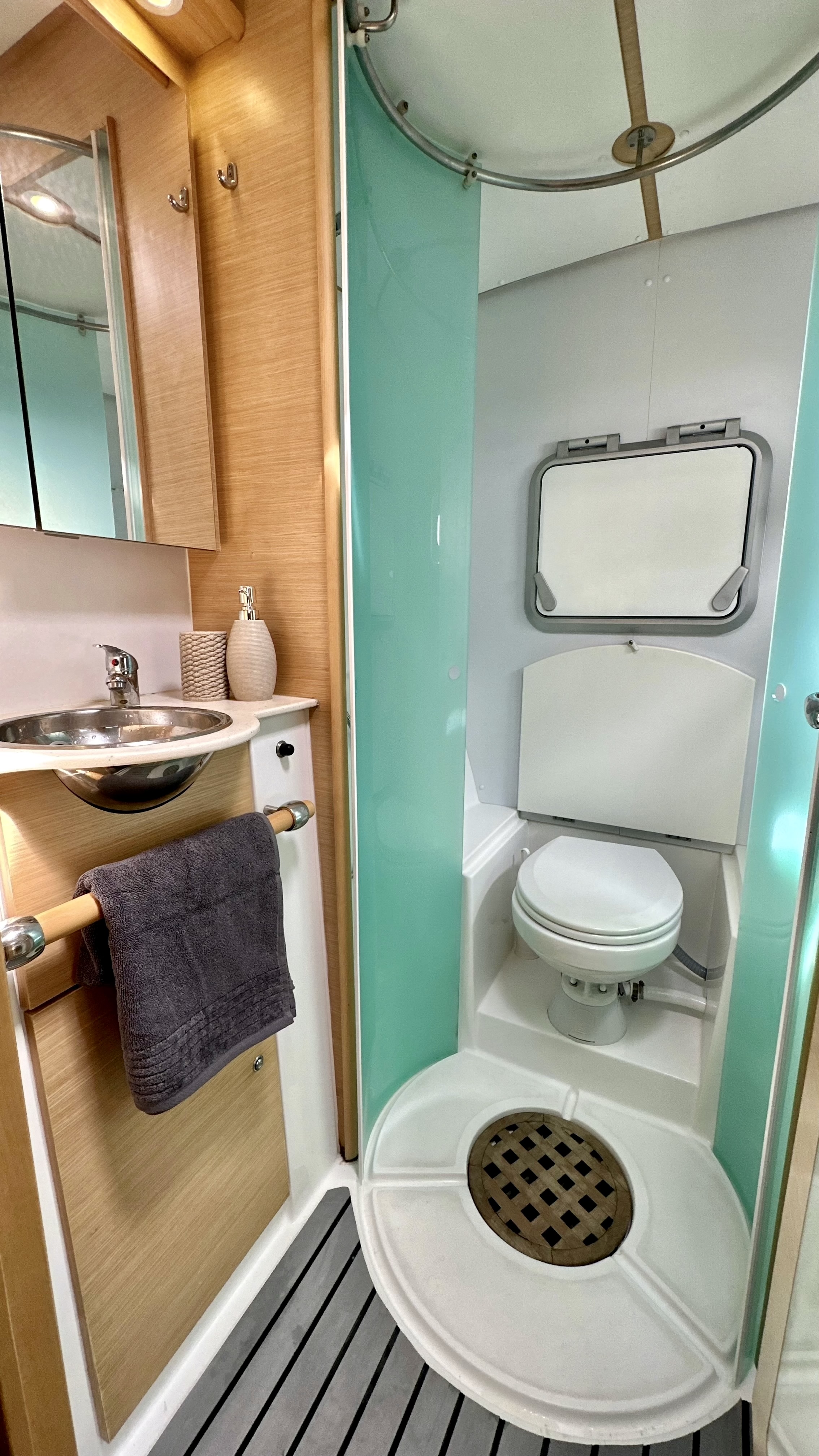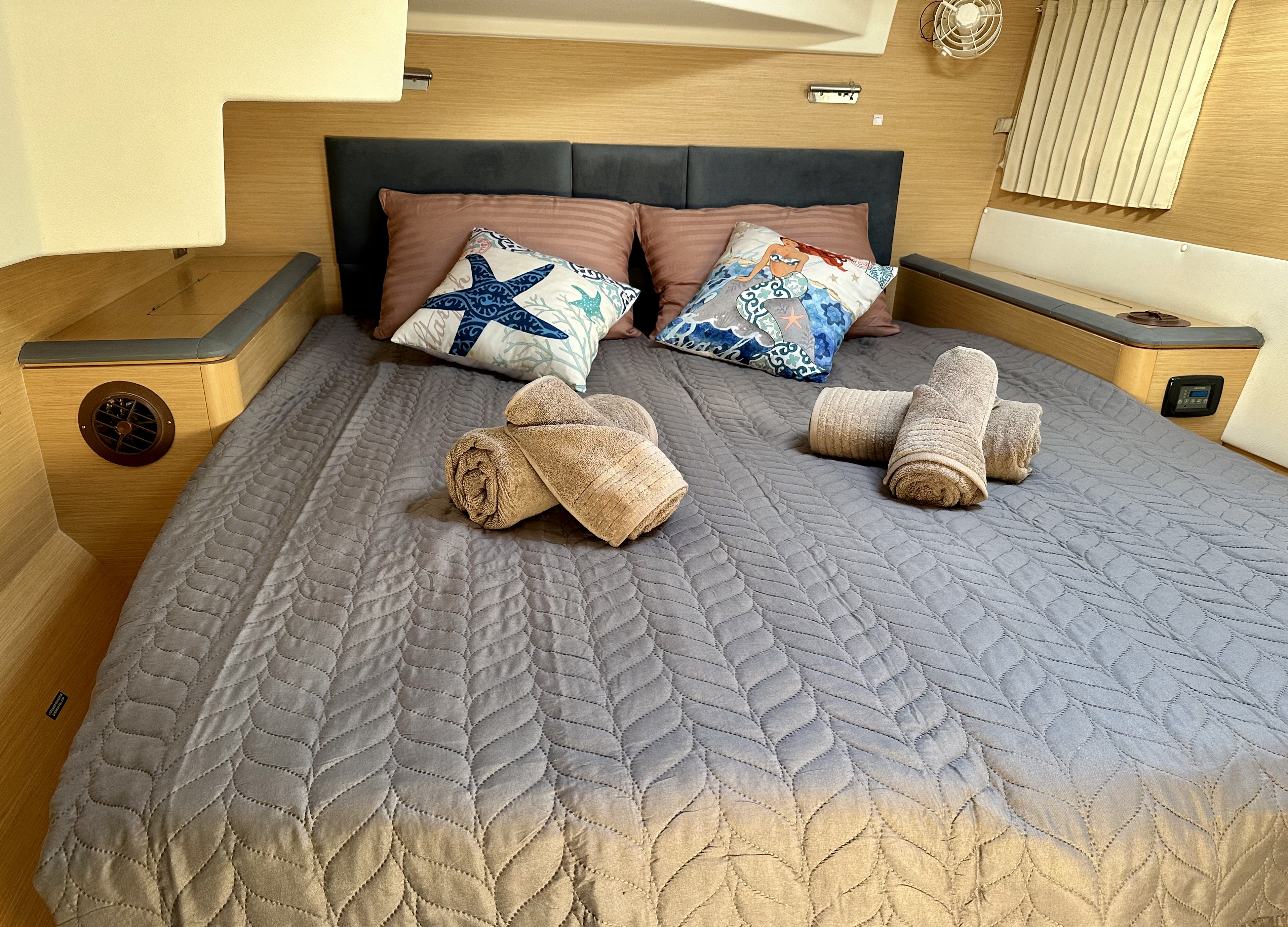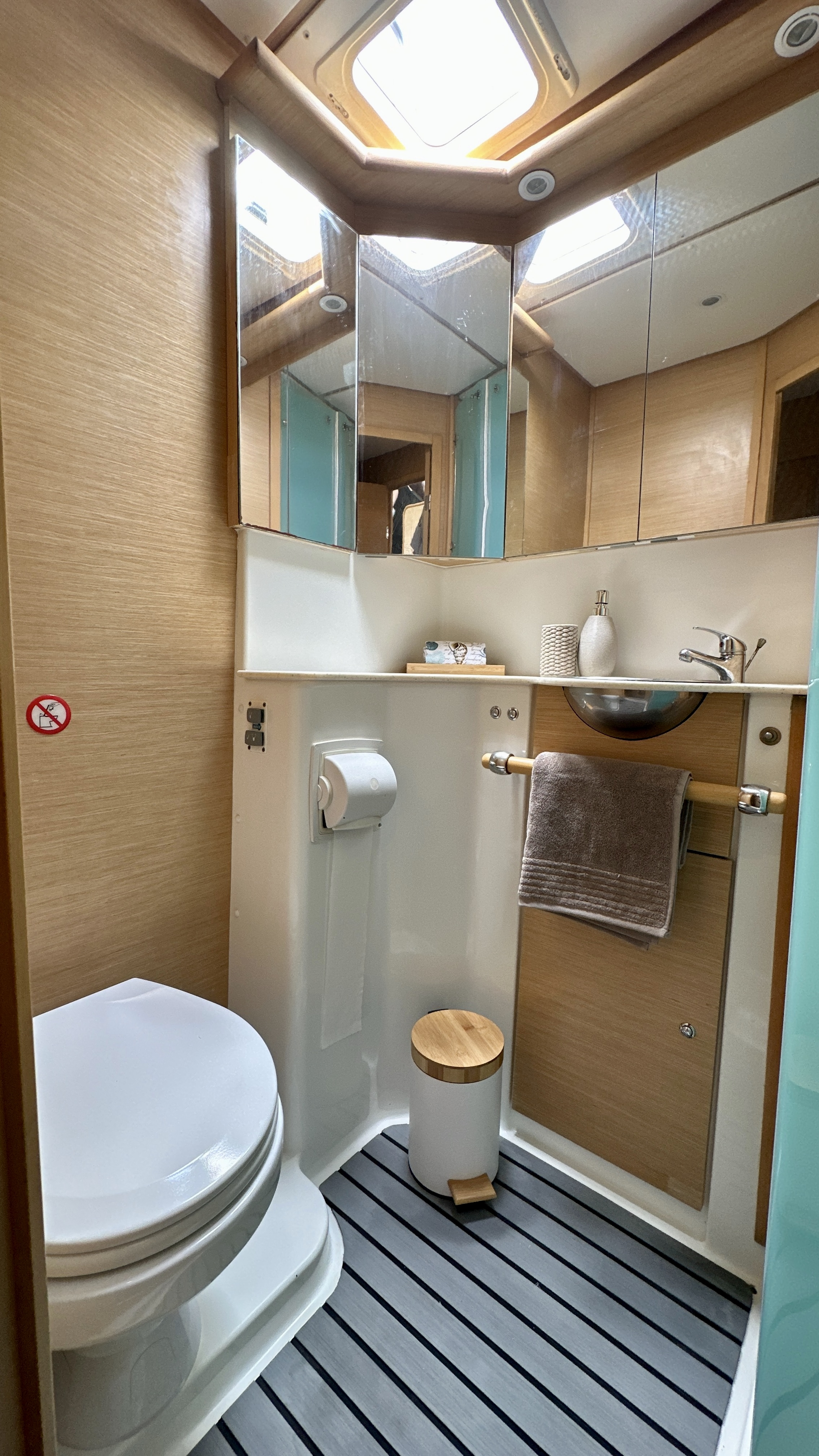 VHF/GMDSS Raymarine Ray 53 GPS chart plotter Raymarine Element HV Autopilot Raymarine Wifi Radar Furuno Depth sounder + Log Wind instruments 2x Raymarine Tridata i70 Full batten mainsail Bridge deck in teak Stern and transoms in teak Sun beds Large bimini 5 electric winches (all) Front cockpit in teakAft cockpit in teak Genoa avvolgibileSalon surround canvas Cockpit shaders Salpa ancora elettricoScaletta per il bagnoSolar panels 660W Hydraulic gangway A/C + WebastoGenerator 17 kW Onan Water maker Aqua base 180 l/h Inverter 2000 WDishwasher Whirlpool 2x Fridges + Cockpit fridgeCockpit ice makerGas oven with electric grillCoffee makerA/C in every cabin + salonCabins with ensuite facilitiesElectric toilets Bed linen, Pillows, Towels, Blankets, Plugs 220V, Fans Wi-Fi LCD smart TV Samsung with 900 channelsHiFi stereo Fusion Apollo with 11 speakers