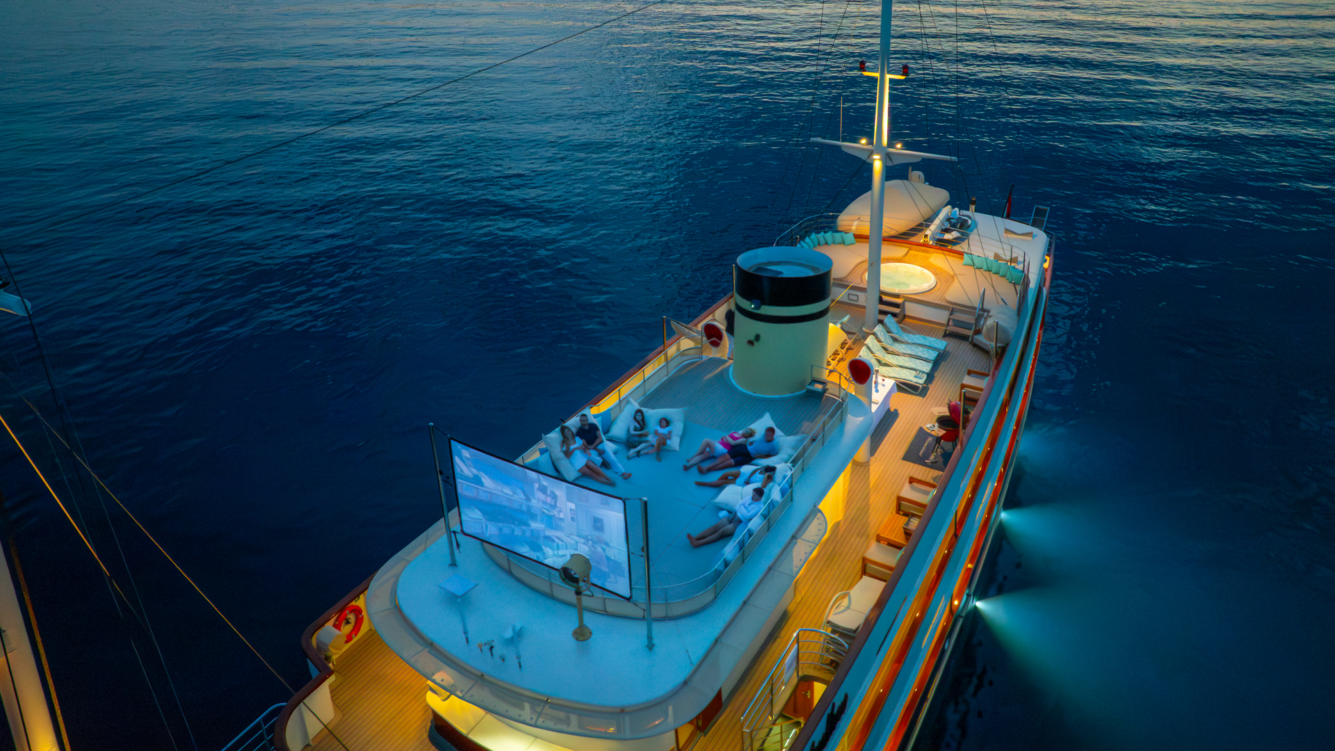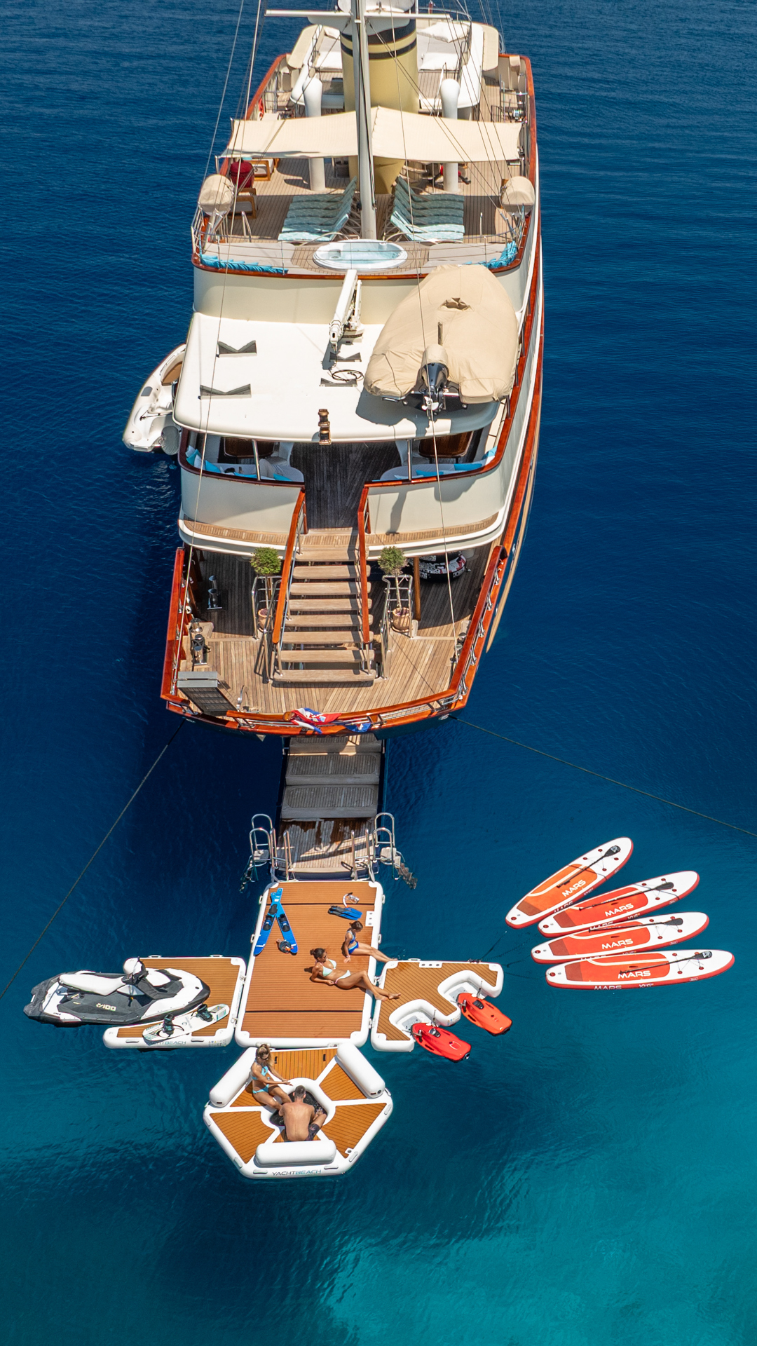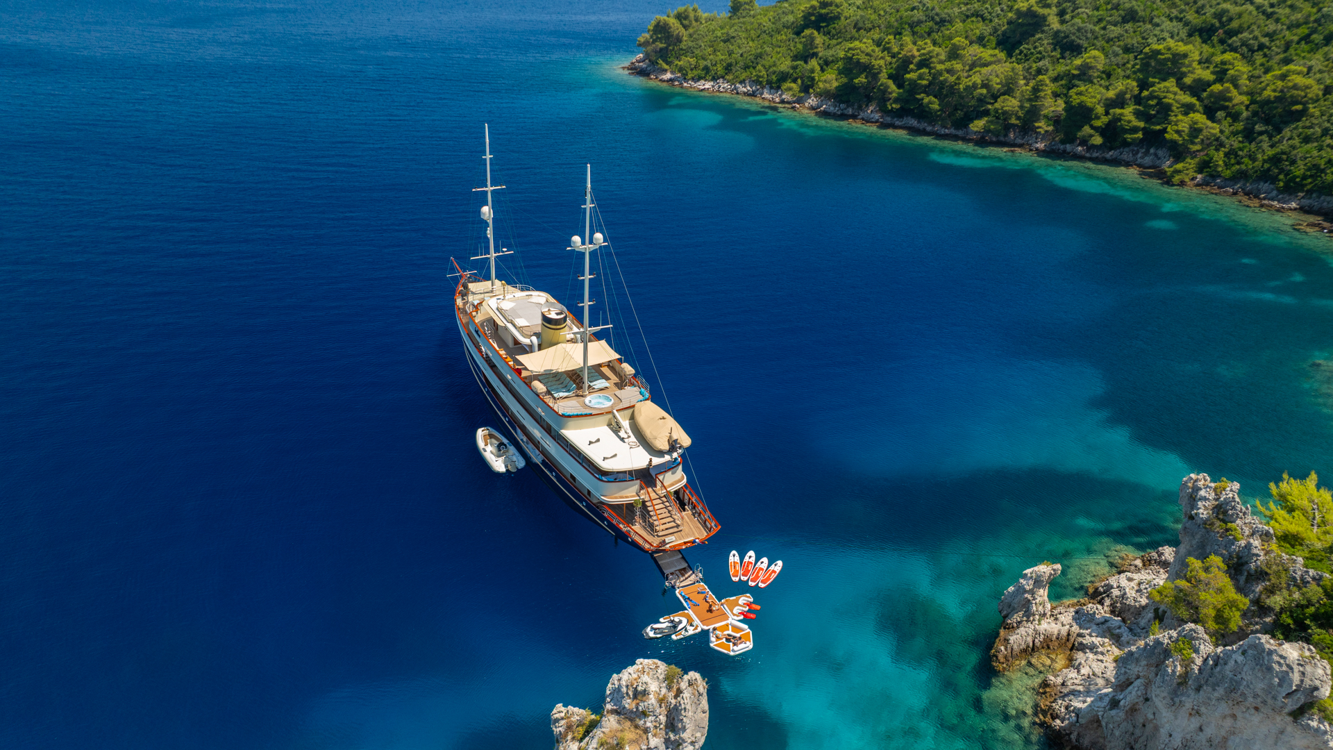 Wake boardFishing gearTenderSeabobWaterskiisSUPJetskiWaterskiis for childrenDonutWater slideWaverunnerInflatable PlatformJet ski dockTowablesAria condizionataWiFi/internetTV in all cabinsDeck JacuzziGym/exercise equipmentAft platformPoolIndoor sauna