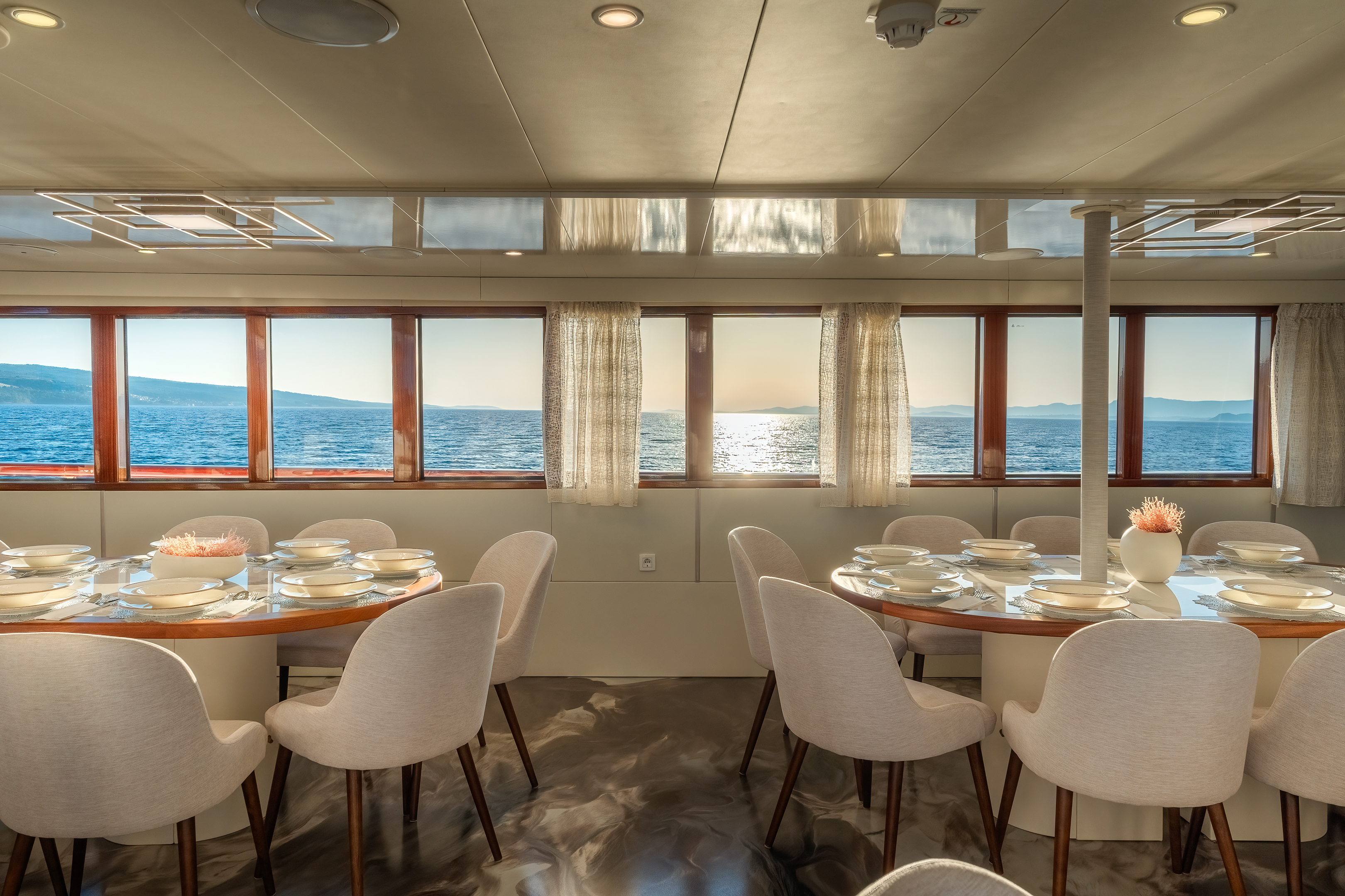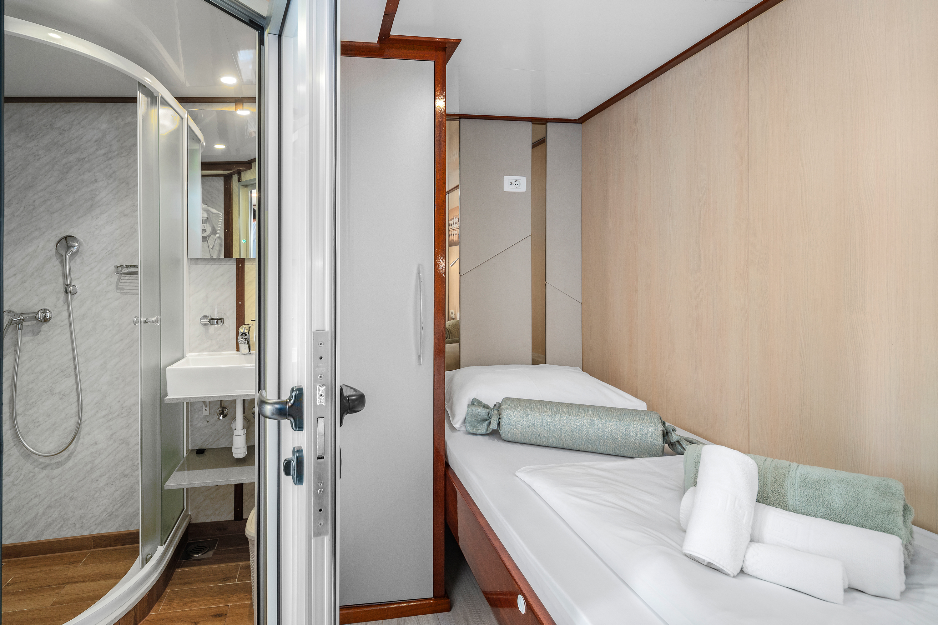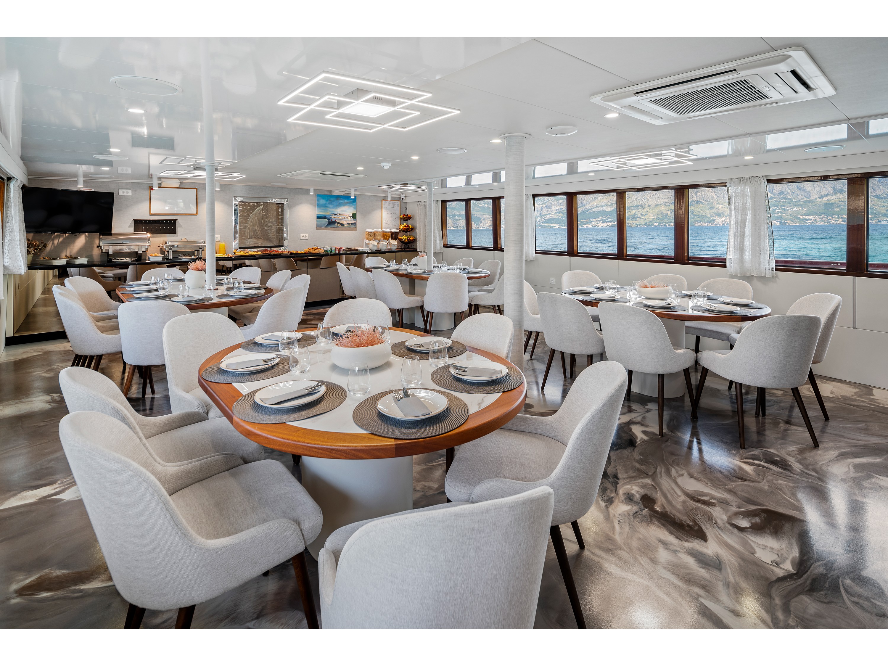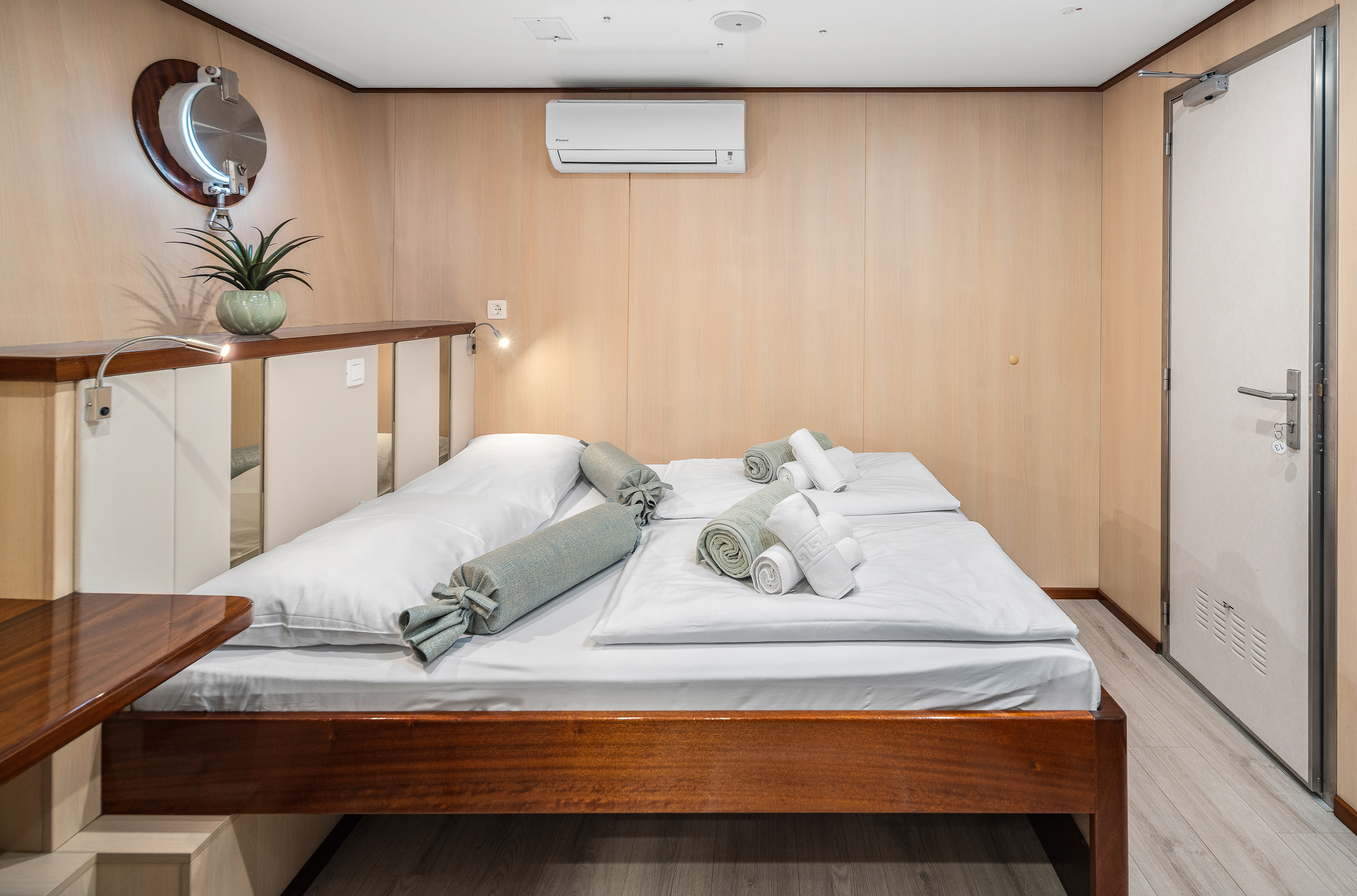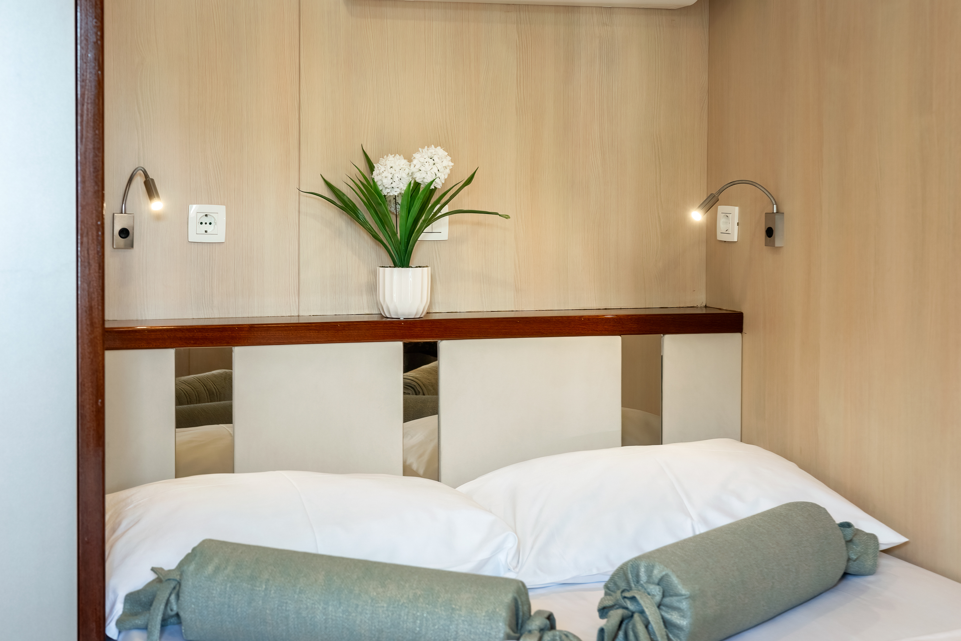 Twin bed cabin (with pullman)Aria condizionataDouble bed cabinLenzuolaAsciugamaniSwimming platformAft deck loungeSmart TVRoom ServiceStainless steel boarding ladder with irocco stepsHidraulic steering system with steering position at bridgeSun awningSun deckDocciaBoard gamesWi-FiSunbathing cushionsSunbathing areaCompasTrue heading autopilotEcoscandaglioSamyung color radarStandard solas navigation lightsTwo horseshoe bouys with warning lightsSolar life jackets for each passengerAutomatic inflatable liferaft for 50 peopleSmoke detectors in each cabinCentral alarm for fire equipmentPortable fire extinguishers for corridors and salonFire extinguishers in the engine using aerosolVHF radio TenderSUPSnorkel and Fishing gearCinema with a projector on the sun deckToorx Race CrossSpinning BikeProfessional Diving equipment – (extra charge)