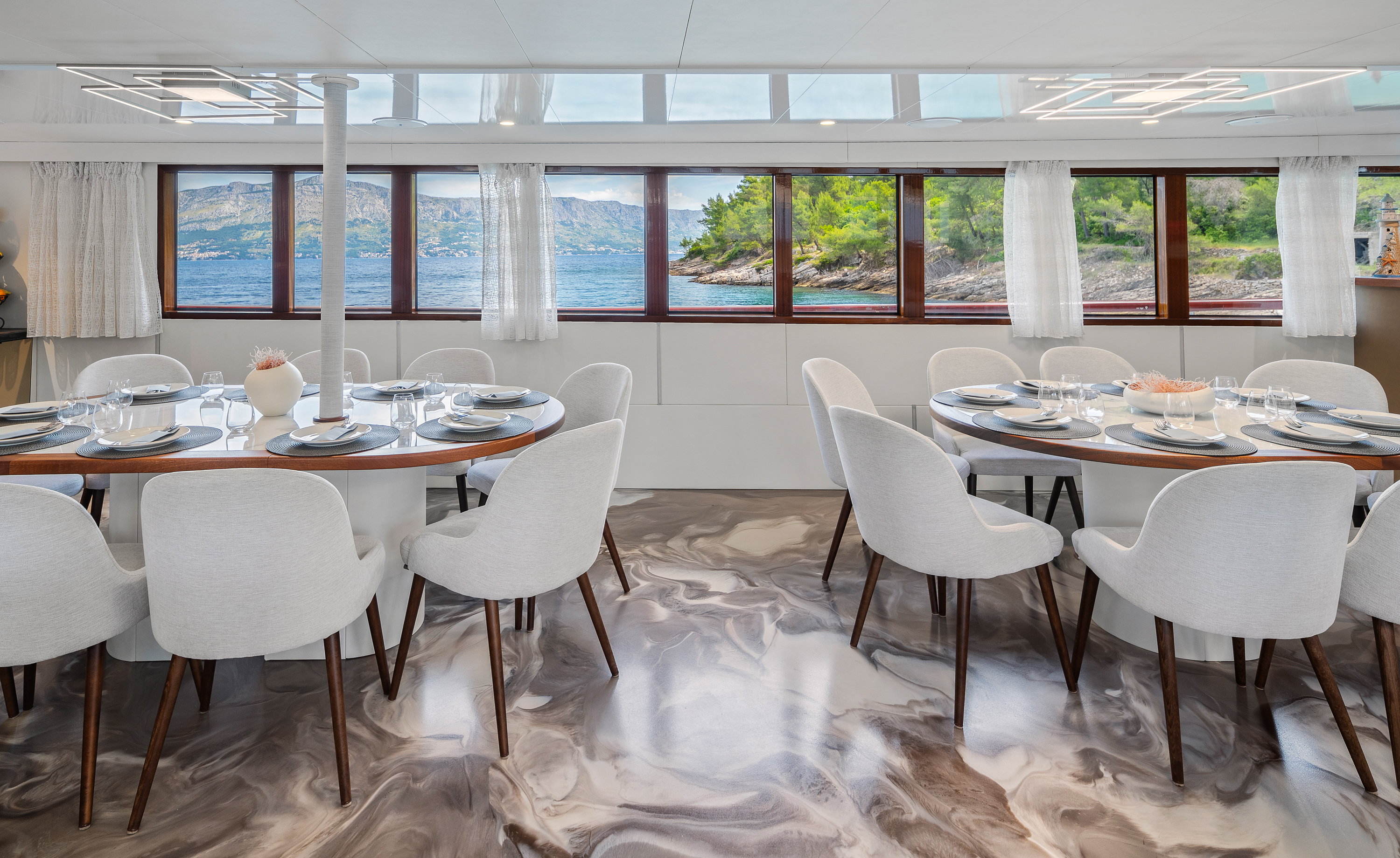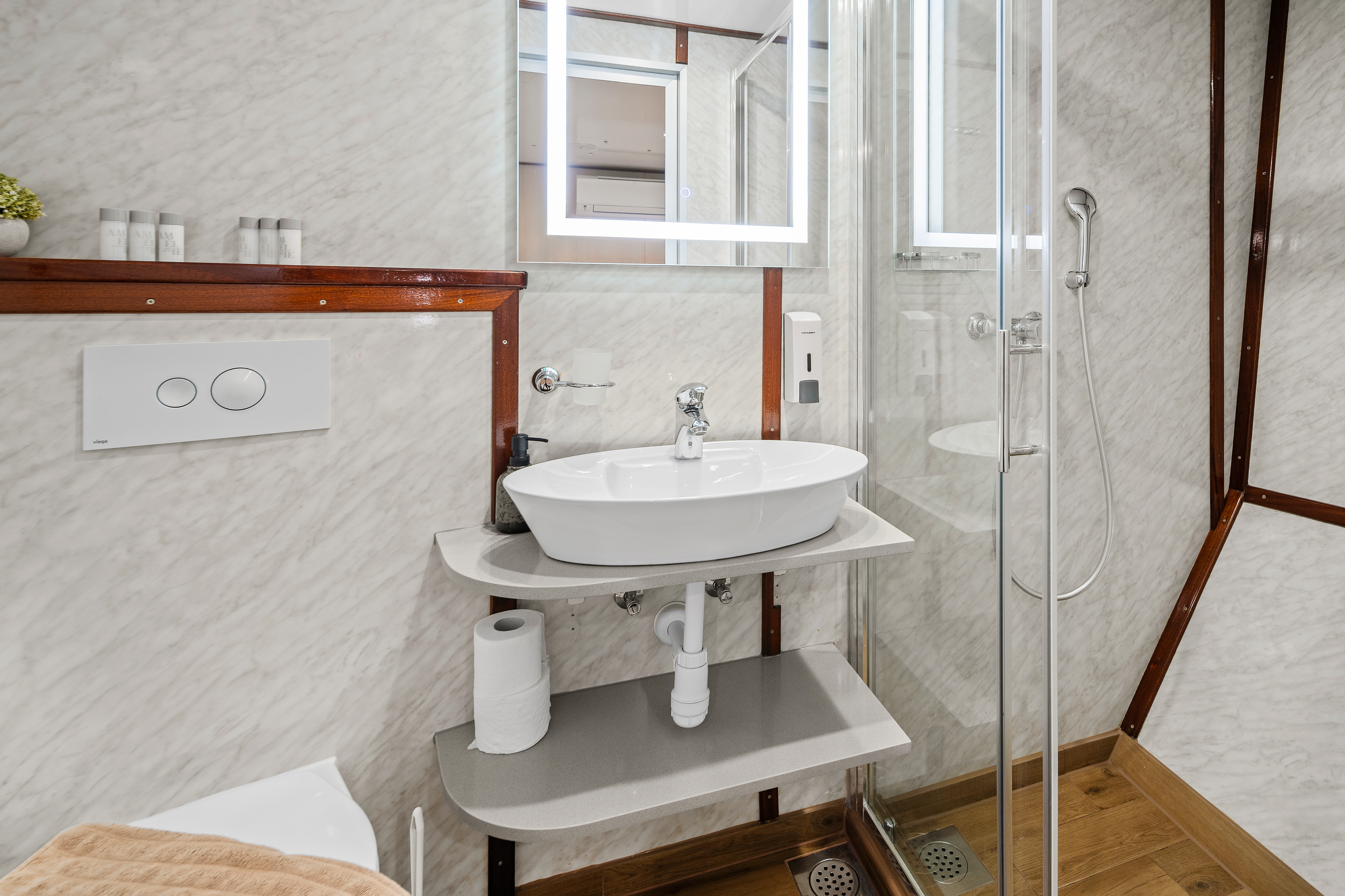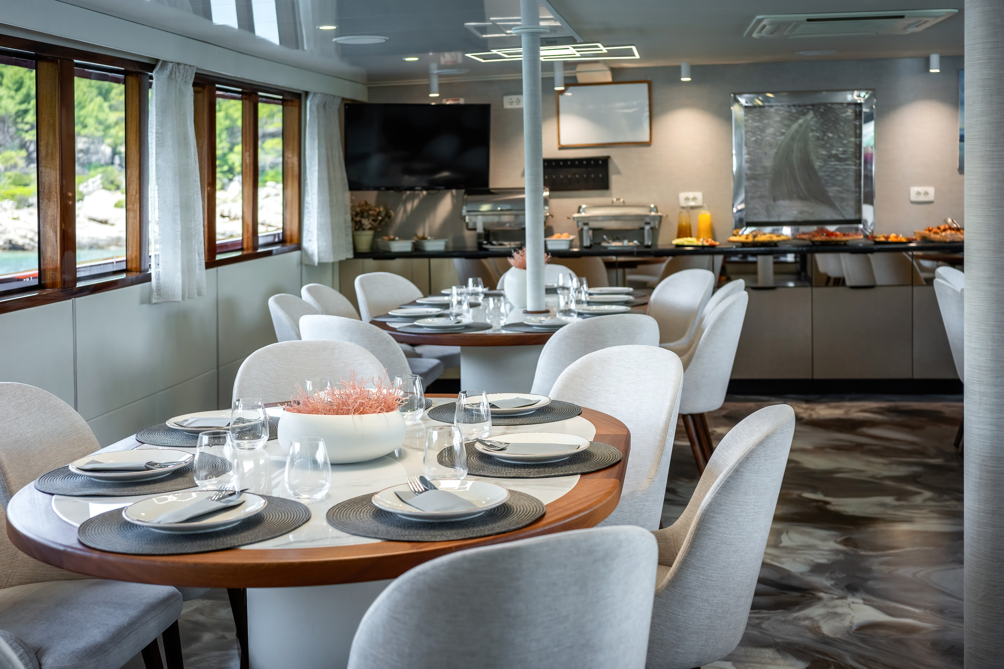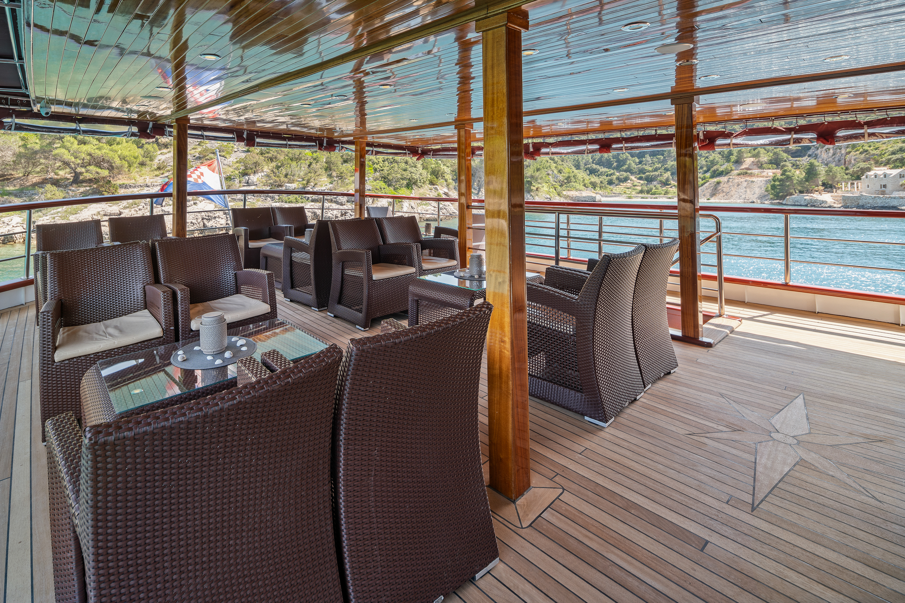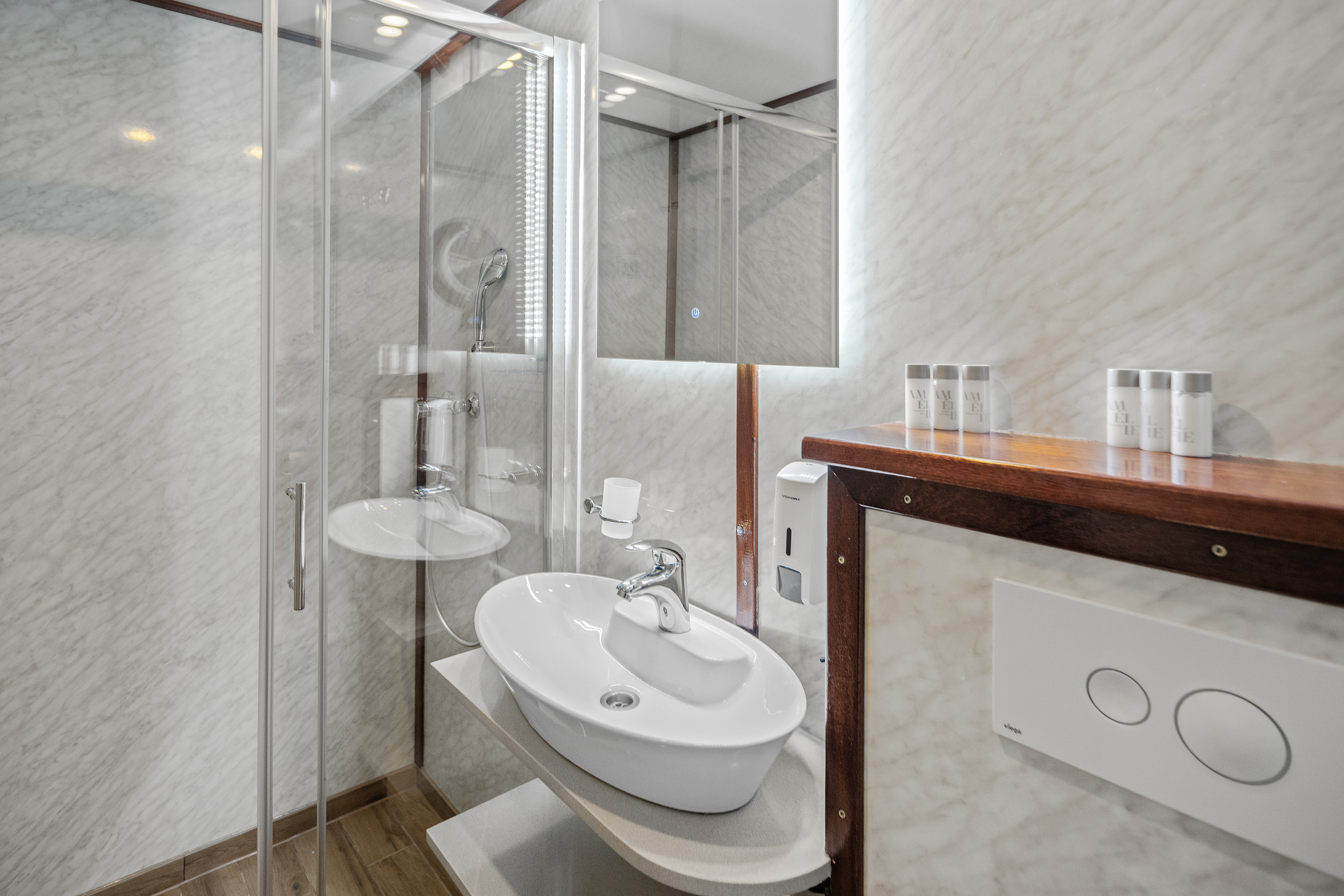 Twin bed cabin (with pullman)Aria condizionataDouble bed cabinLenzuolaAsciugamaniSwimming platformAft deck loungeSmart TVRoom ServiceStainless steel boarding ladder with irocco stepsHidraulic steering system with steering position at bridgeSun awningSun deckDocciaBoard gamesWi-FiSunbathing cushionsSunbathing areaCompasTrue heading autopilotEcoscandaglioSamyung color radarStandard solas navigation lightsTwo horseshoe bouys with warning lightsSolar life jackets for each passengerAutomatic inflatable liferaft for 50 peopleSmoke detectors in each cabinCentral alarm for fire equipmentPortable fire extinguishers for corridors and salonFire extinguishers in the engine using aerosolVHF radio TenderSUPSnorkel and Fishing gearCinema with a projector on the sun deckToorx Race CrossSpinning BikeProfessional Diving equipment – (extra charge)