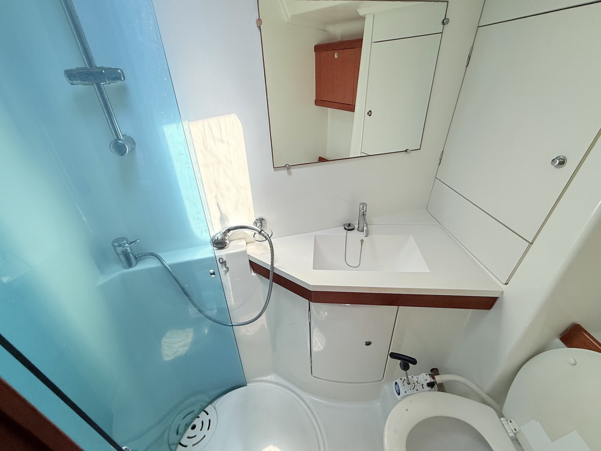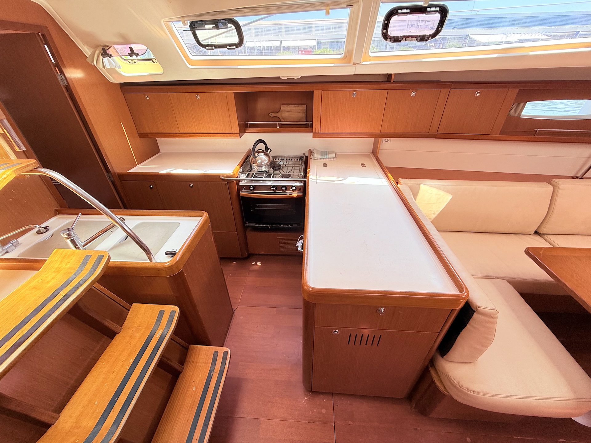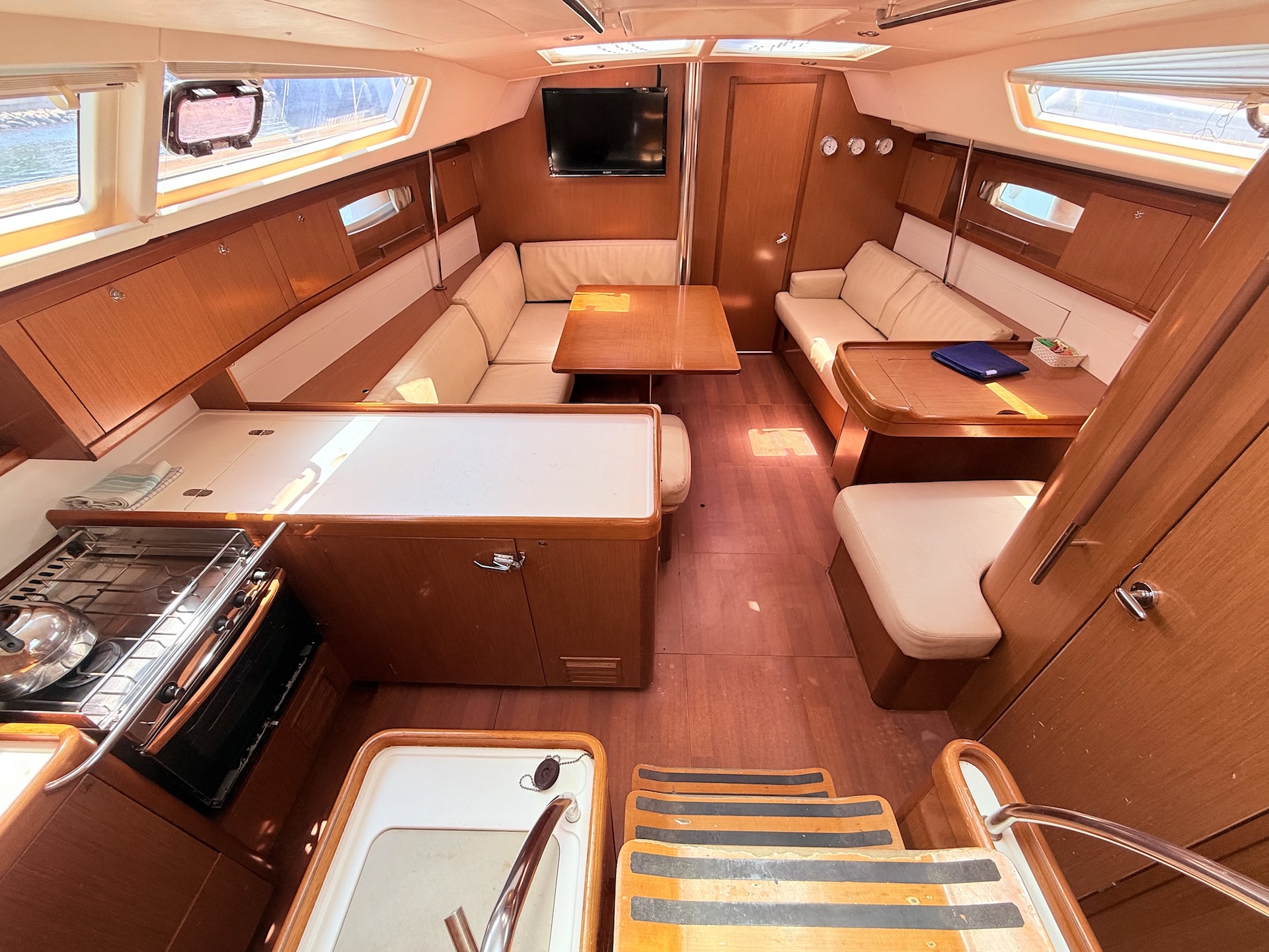 Cucina a gas con fornoFrigoriferoBlue HullElica di PruaTenderTV + DVDRadio/MP3 playerPilota automaticoGPS ChartplotterVHFEcoscandaglioSolcometroWindRiscaldamentoAcqua caldaPonte in teakBiminiSalpa ancora elettricoPozzetto in teakSprayhoodDoccetta in pozzettoRanda avvolgibileGenoa avvolgibile