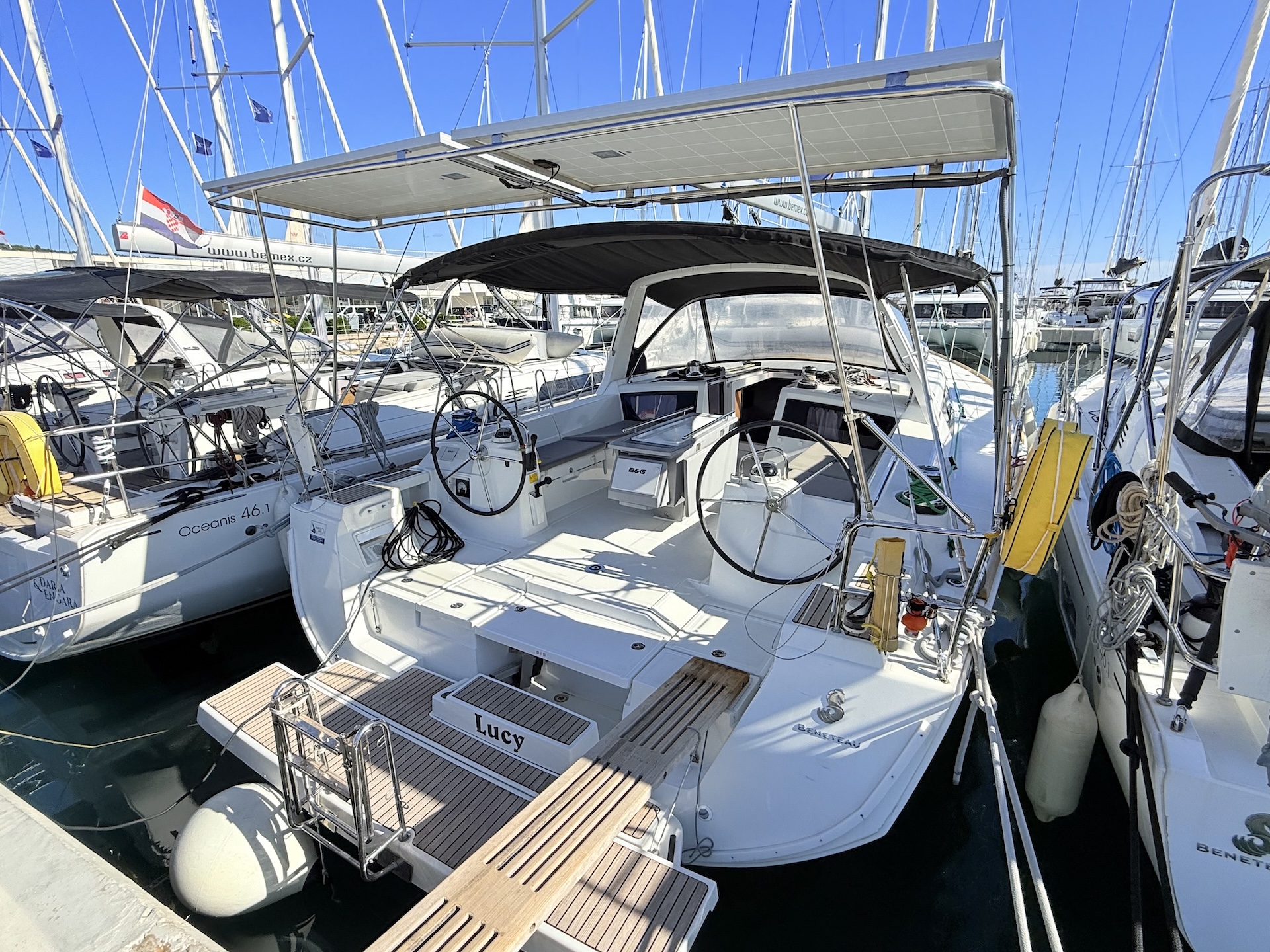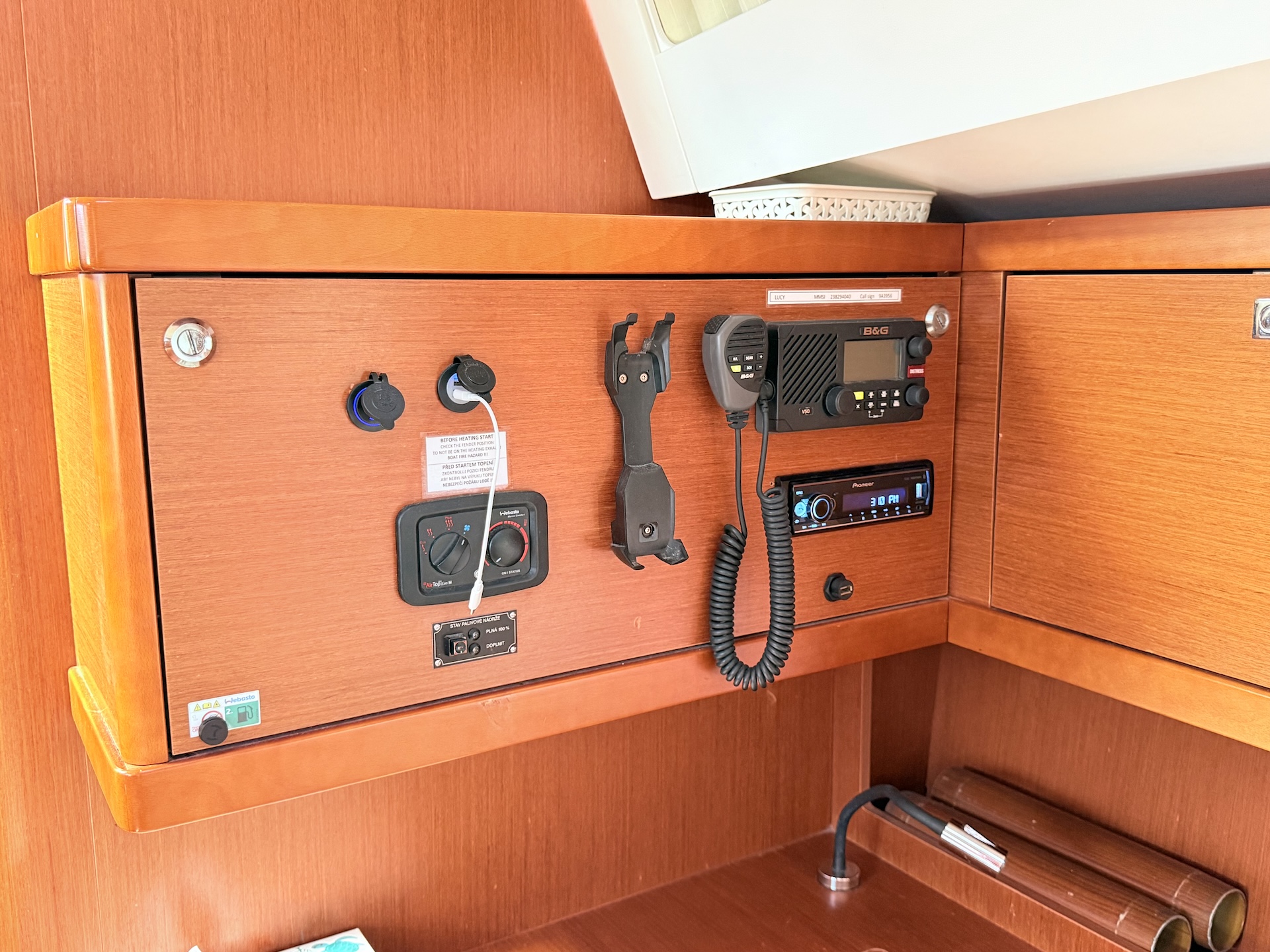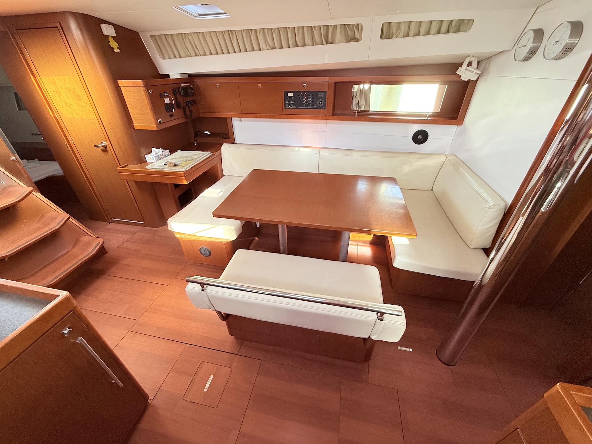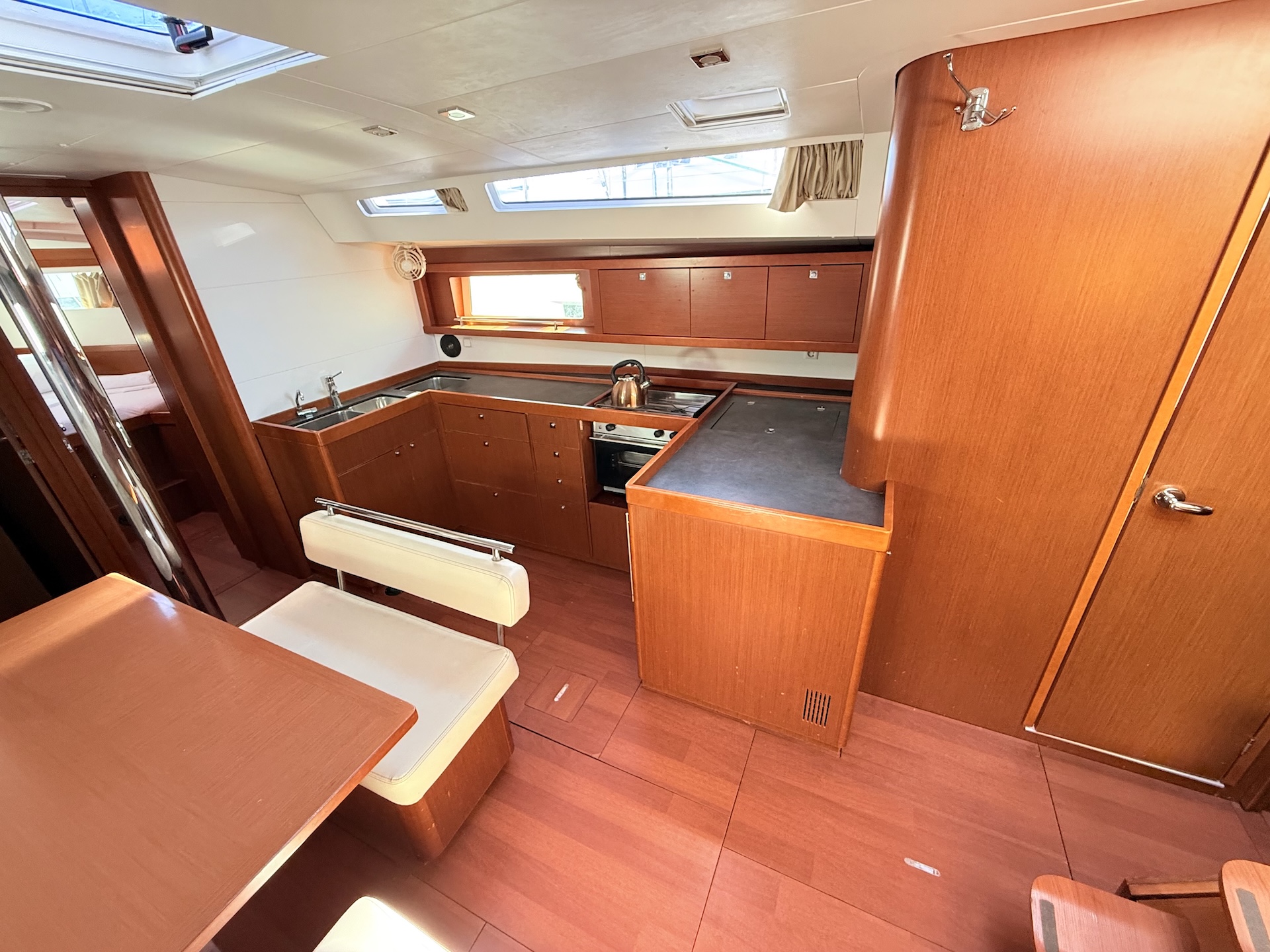 Cucina a gas con fornoFrigoriferoElica di PruaTenderRadio/USB/BTPilota automaticoGPS ChartplotterVHFEcoscandaglioSolcometroWindRiscaldamentoPannelli solariAcqua caldaLithium service batteriesBiminiSalpa ancora elettricoCuscini in pozzettoElectric folding aft platformSprayhoodDoccetta in pozzettoRanda avvolgibileGenoa avvolgibile