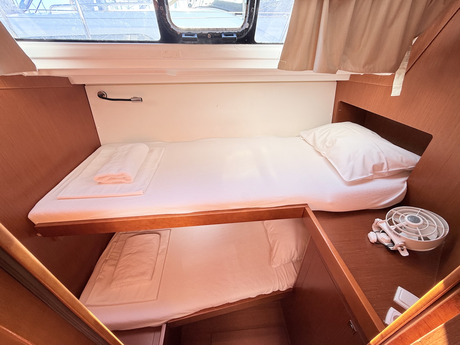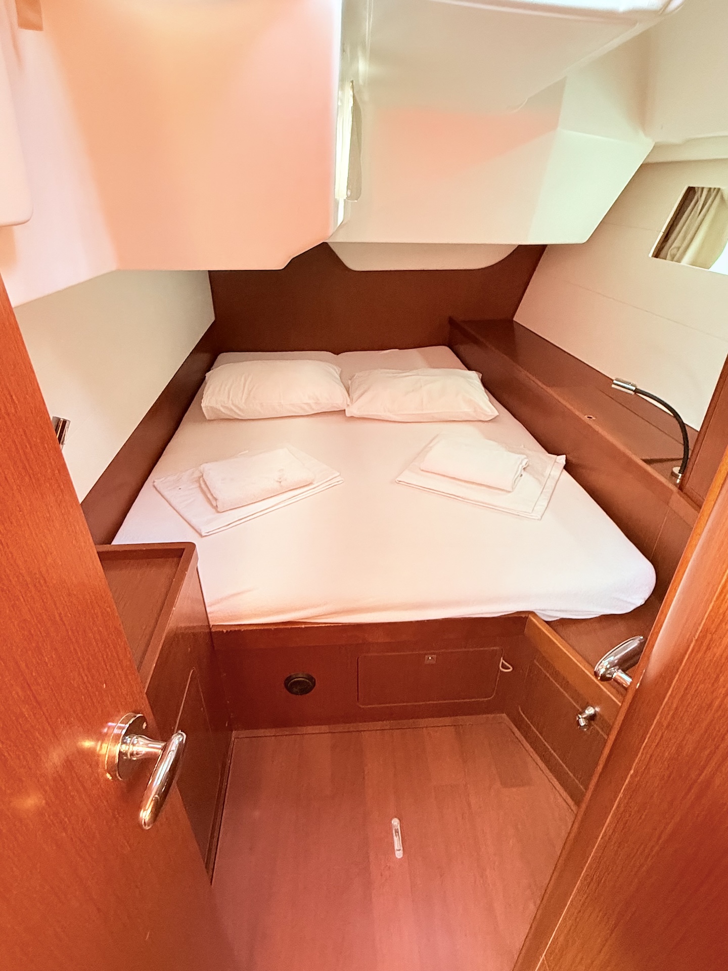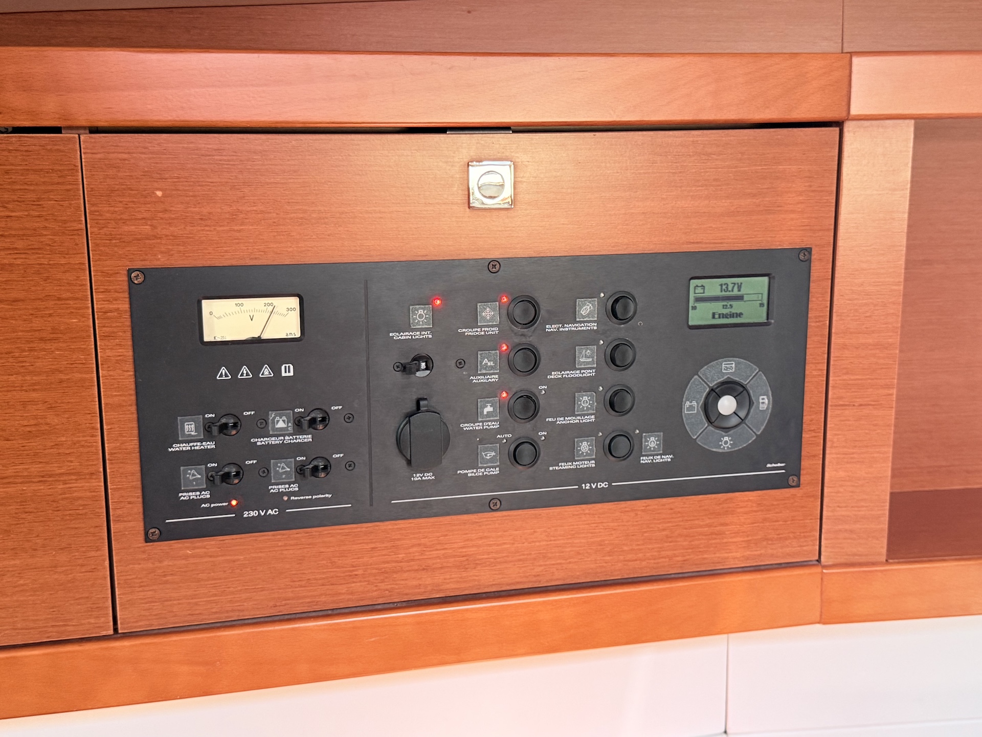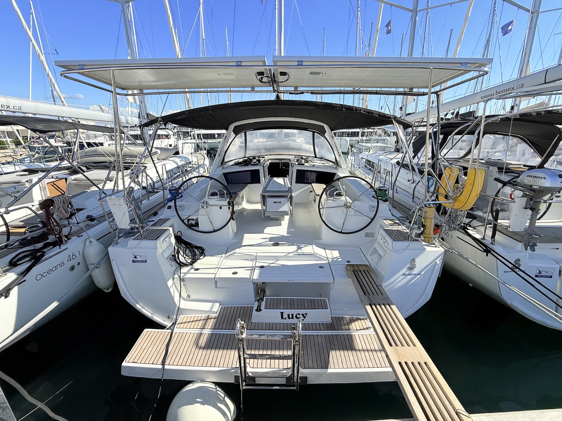 Cucina a gas con fornoFrigoriferoElica di PruaTenderRadio/USB/BTPilota automaticoGPS ChartplotterVHFEcoscandaglioSolcometroWindRiscaldamentoPannelli solariAcqua caldaLithium service batteriesBiminiSalpa ancora elettricoCuscini in pozzettoElectric folding aft platformSprayhoodDoccetta in pozzettoRanda avvolgibileGenoa avvolgibile