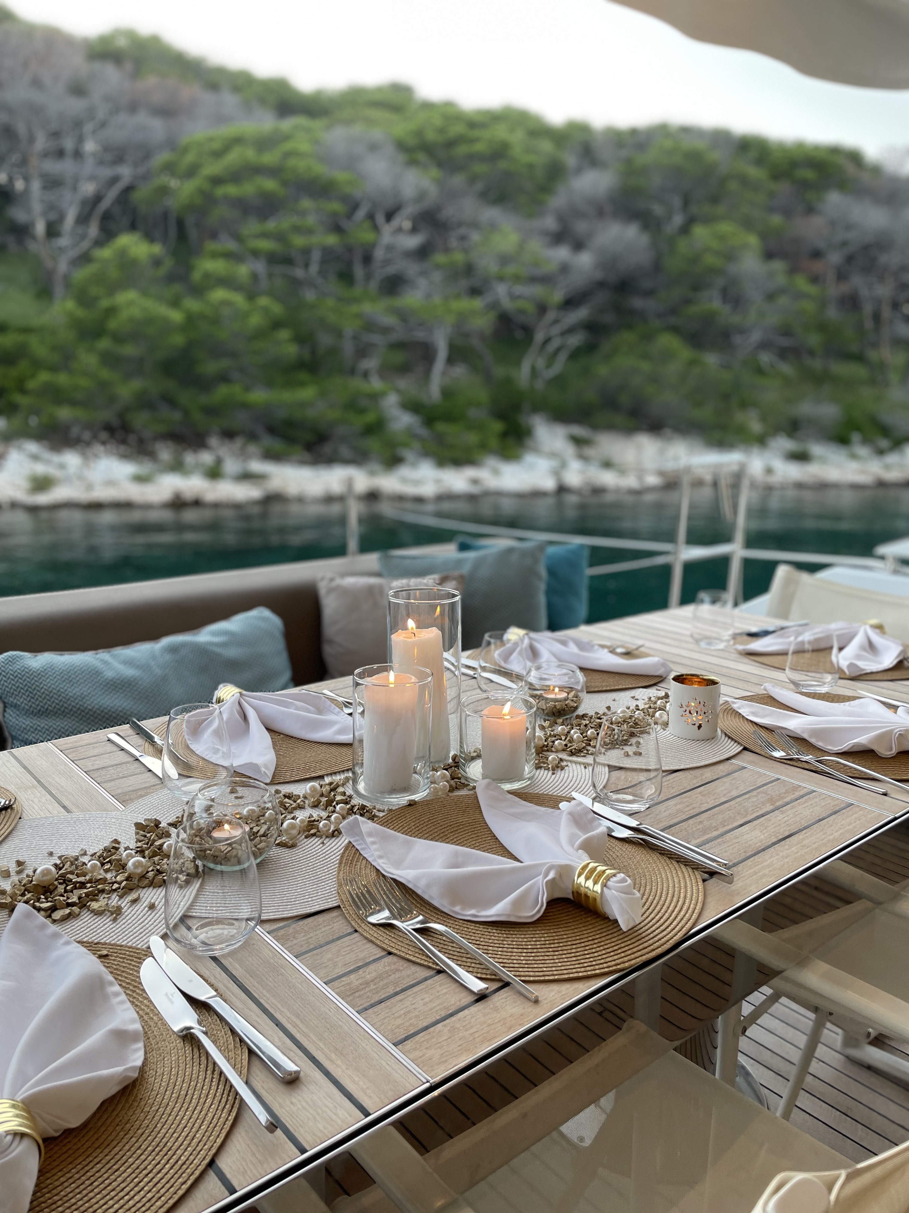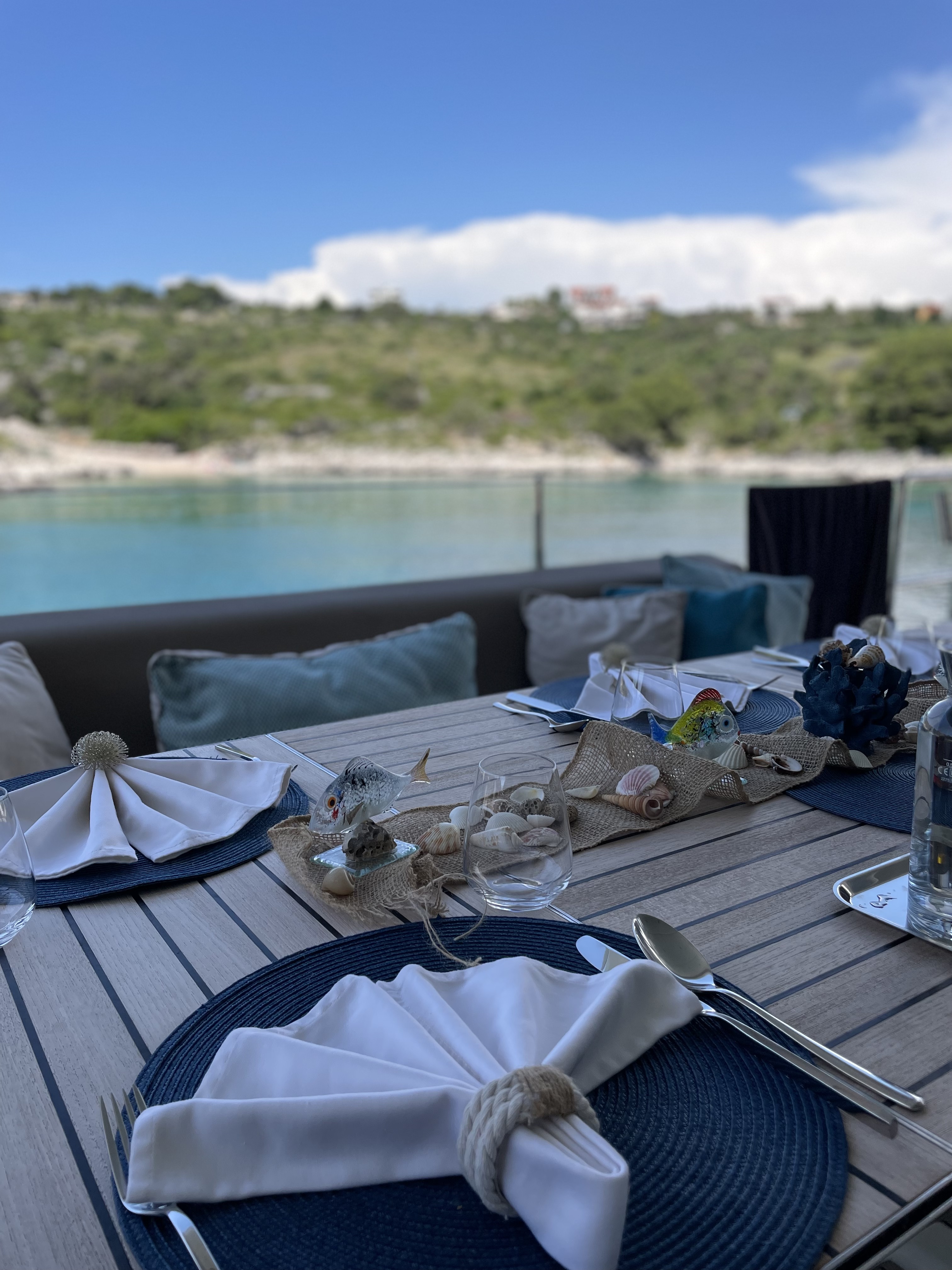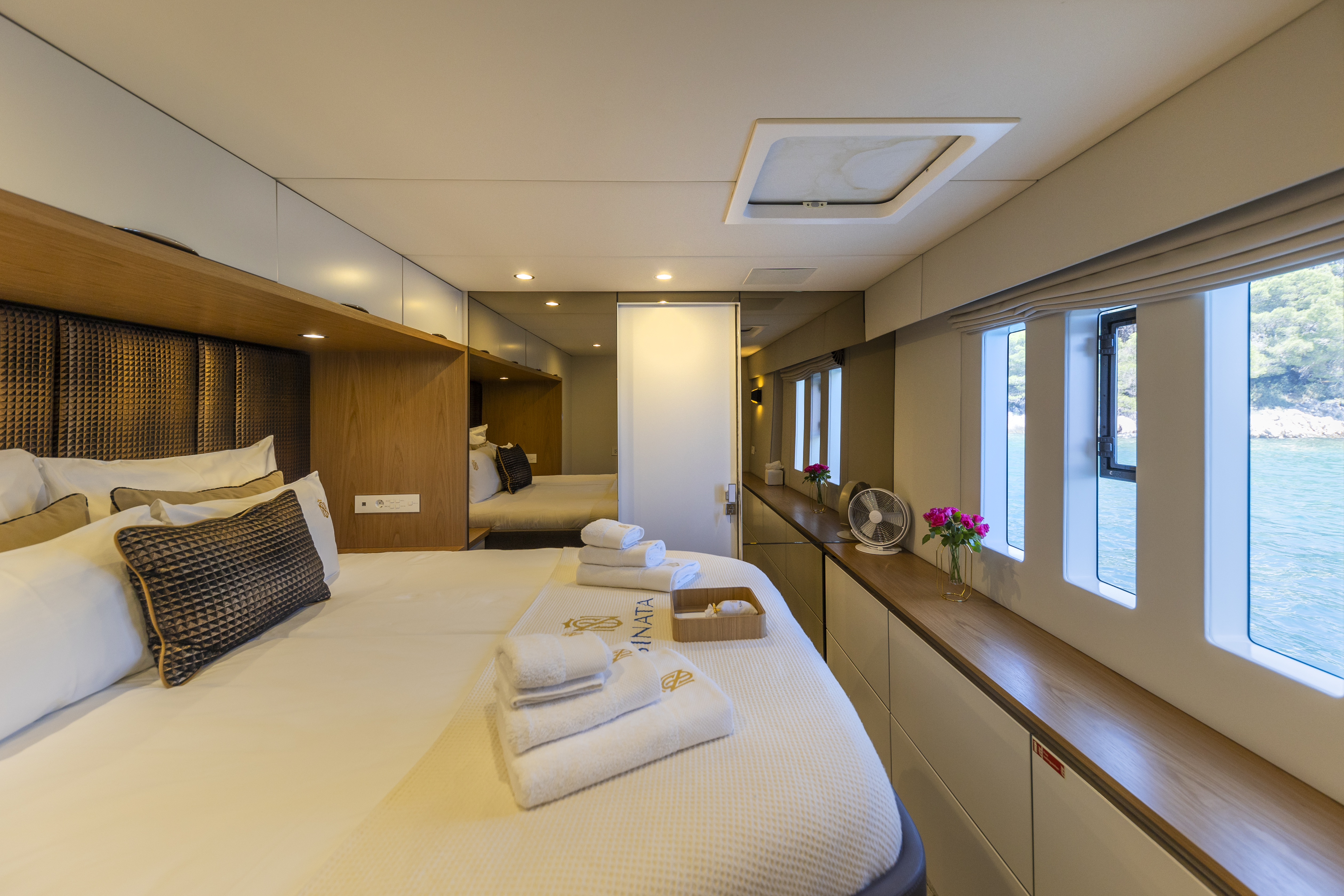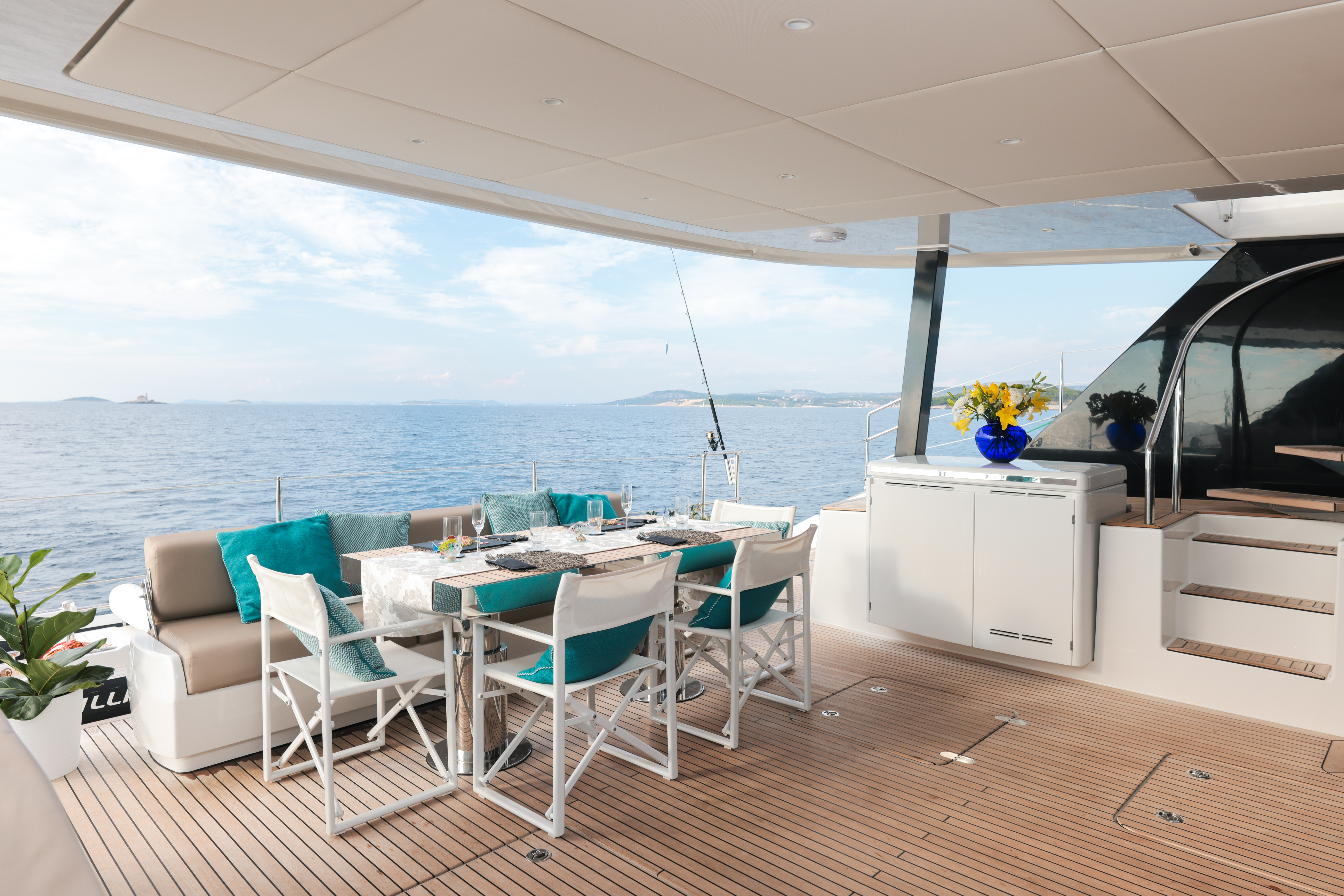BiancheriaTeak flybridgeAnchor and chainPadlock for outboarderCuscini in pozzettoFuoribordoBimini topCroatian flagHydraulic lifting swimming platformElectrical windlassHydraulic gangway220V shore power plug + 110VWinter tentBaloon fender - aftMezzo marinaioTeak laid seatsChain for spare anchor (6m)Teak transomsOutboard mountParabordiCockpit ice makerAft showerHard topSprayhoodBathing laddePozzetto in teakTenderSpongeWinch handle - shortBrush for interiorBuglioloDiesel canister (20l)Water canister (20l)Winch handle - longAncora di rispettoFoot pumpManichetta acquaGlovesFunnelDeck brush with long handleSaloon tableTV setBluetoothHair dryer in each bathroomAir condition-separate adjustable AC unit in each cabinHeating system220 V power generatorIronIroning matWatermakerSpeakers in saloon and cockpitElica di prua220V plugStand up PaddleWIFIFishing gearWakeboardSea BobKayakKneeboardWater skis M-LWater skis SRadarUsb outletsWC elettriciGeneratoreWasherRefrigerator inside 420 litCooling box Macchina del ghiaccioFreezer inside 250 litDishwasherFornoFresh water level instrumentBoat's paper fileBussolaFuel level instrument3 dataCable cuttersZattera di salvataggioBinocoloAxeSafety harnesses - adultsLifejackets - adult/childrenPompa di sentinaBarra Timone di emergenzaBilge liquid level high alarmTorciaBailerEstintoreFirst aid boxSegnale sonoroPompa di sentinaFloating smoke signaHorseshoe w. rescue lineSafety boxEngine tool set and spare parts boxGas fog hornHorseshoe w. rescue line and floating lifebouy lightRiflettore radarBansigoMatches and lighter (watertight)Handbearing compass Lazy bagFull battened mainsailGenoa avvolgibileLazy jack