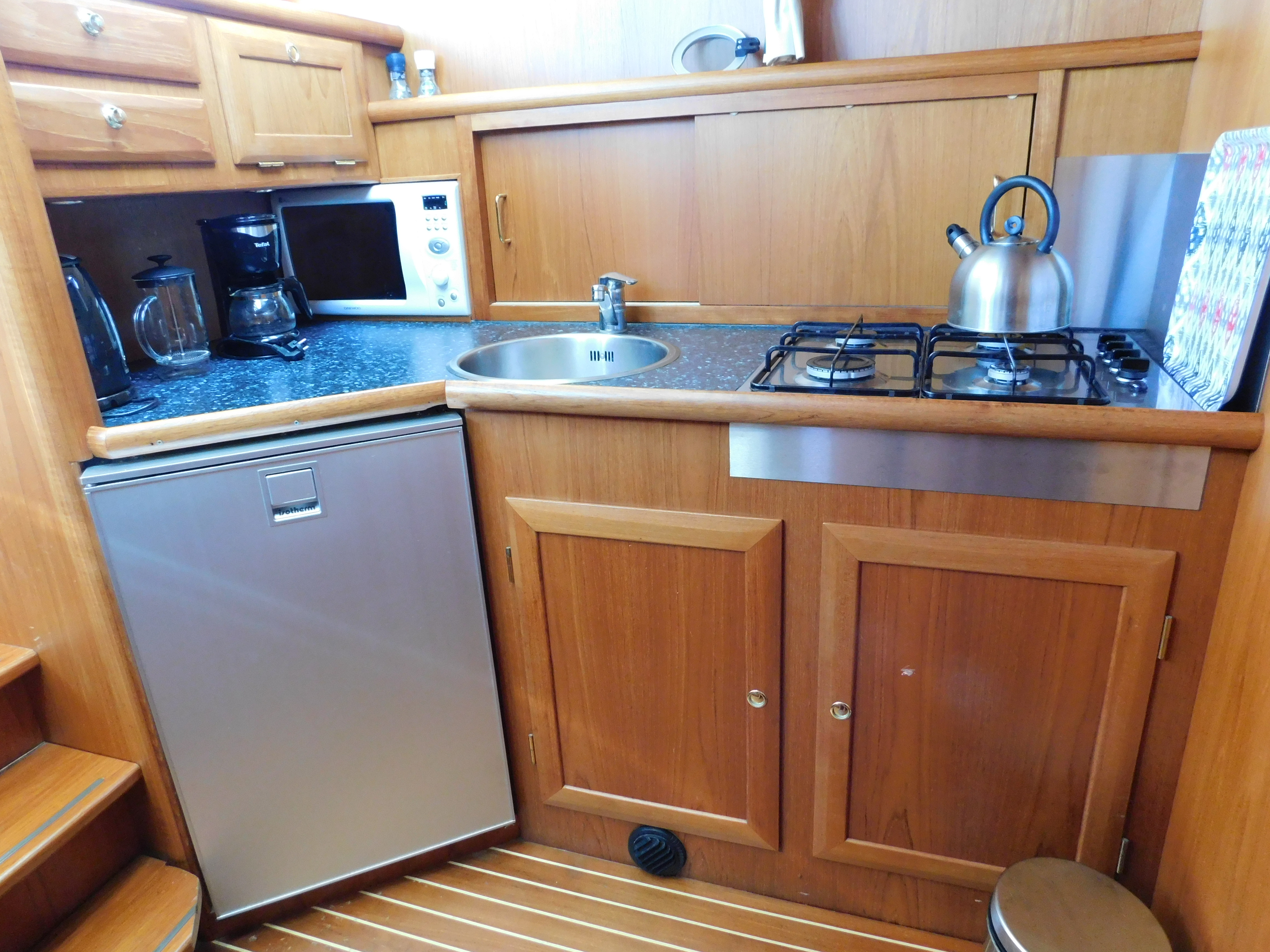 Elica di pruaStern trusterCaricabatteriePressurized water systemInverter220V shore power connectionSingle-lever control220V socketsAcqua caldaPosition lightsBow pulpitTransom door to bathing platformPlancetta Specchio di PoppaSprayhoodSalvagentePompa di sentina elettricaEstintorePompa di sentina manualeCoffee makerWC elettricoForno a microondeRadioTV