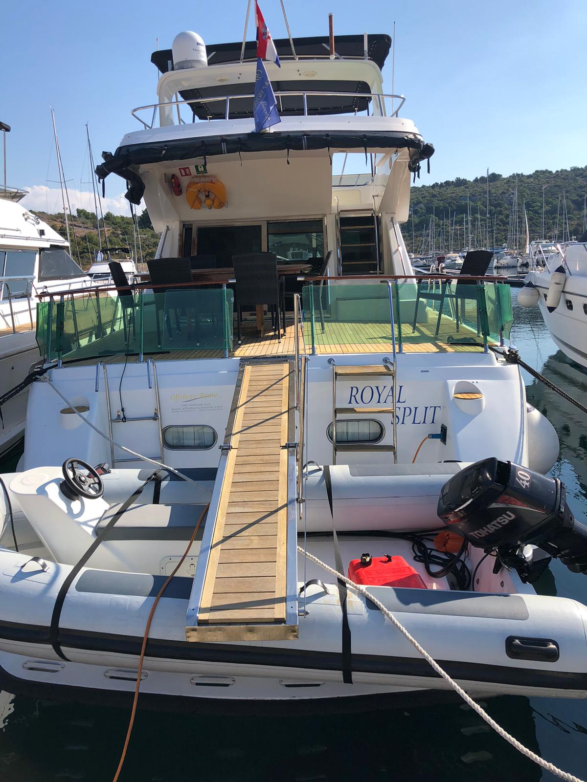 Living room suite with table on the flybridgeSeating area with table on the flybridgeSkipper cabin in the bowBathing platform can be lowered80 m galvanized anchor chainRefrigerator 12 V / approx. 120 lHeavy anchor galvanizedElectric stove 220 V with oven2-stick micro-commander gearGeneratoreTV with DVD/hard diskCD / USB RadioElectric stove 220VDoccetta a poppaNavigation systemComplete instrumentsDepth meterSalpa ancora elettricoHydraulic gangwaySun lounge on the bowElectric toilettesInternet Router WLANBimini topFlybridgeSun lounge on the flybridgeAria condizionataTable on the flybridgeElica di PruaMacchina del ghiaccioRadarTable in the cockpitStorage spacekompasTeak im CockpitGPS Fly Lowrance HDS7mFlapsKompas FlyEcholot Raymarine ST 40RiscaldamentoVHF radio Husun 70Komplete kitchen fixturesAutopilot Autohelm 7000Autopilot Fly Raymarine ST 6002Jetski on reqeustdinghy with 40 PSreserve anchorCarte nautichenavigational tool kitEstintoreharbor guidessignal rocketsfenderstereo-radio / CD / mp3board tool kitAcqua caldaCaricabatterieScaletta per il bagnobed clothescoffee machine/ Nesspressowater cookerguide for technical equipmentGiubbotto di salvataggio spotlight220V country connectionEcholot Raymarine ST 40